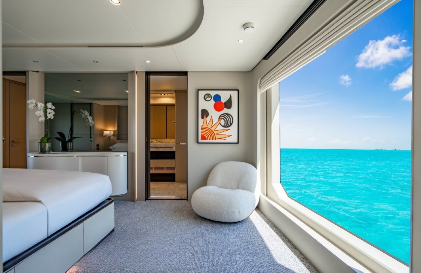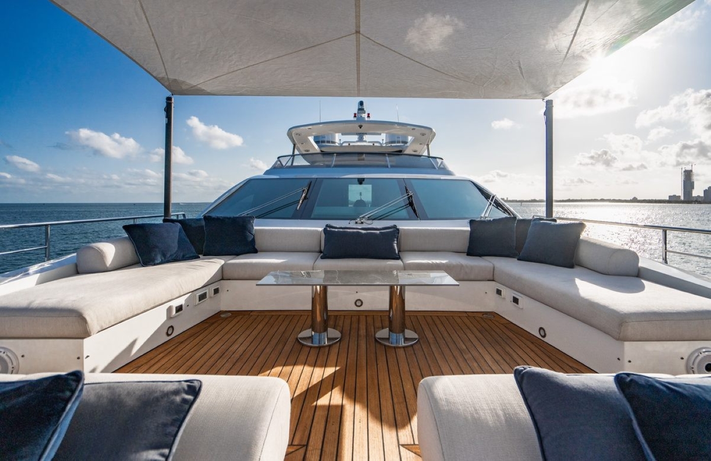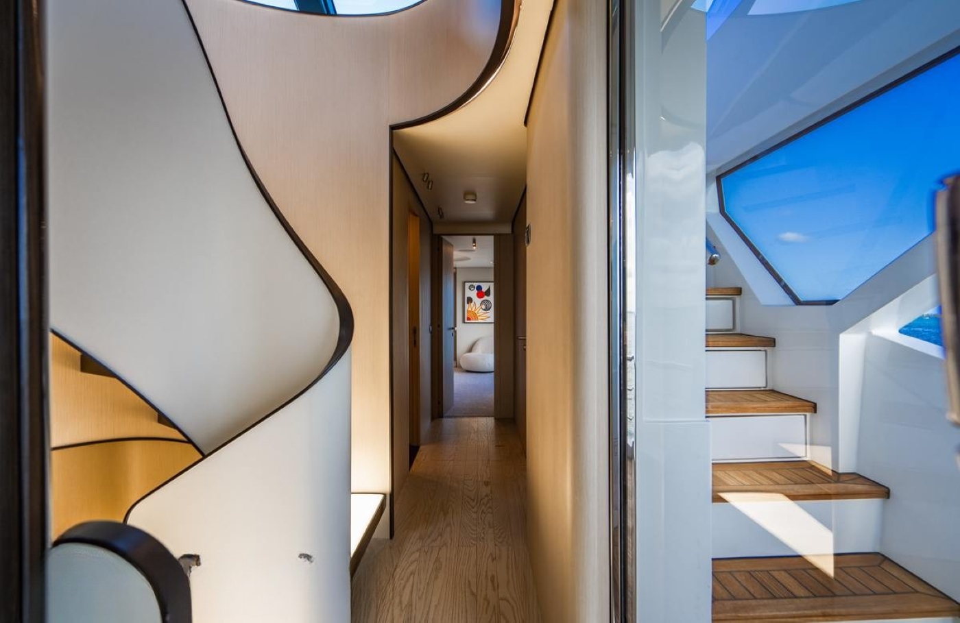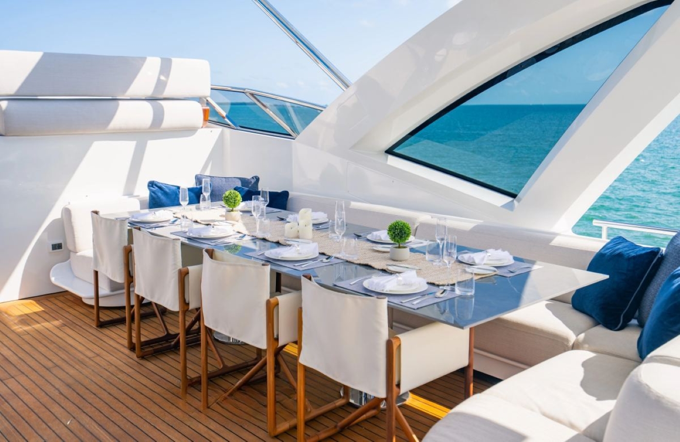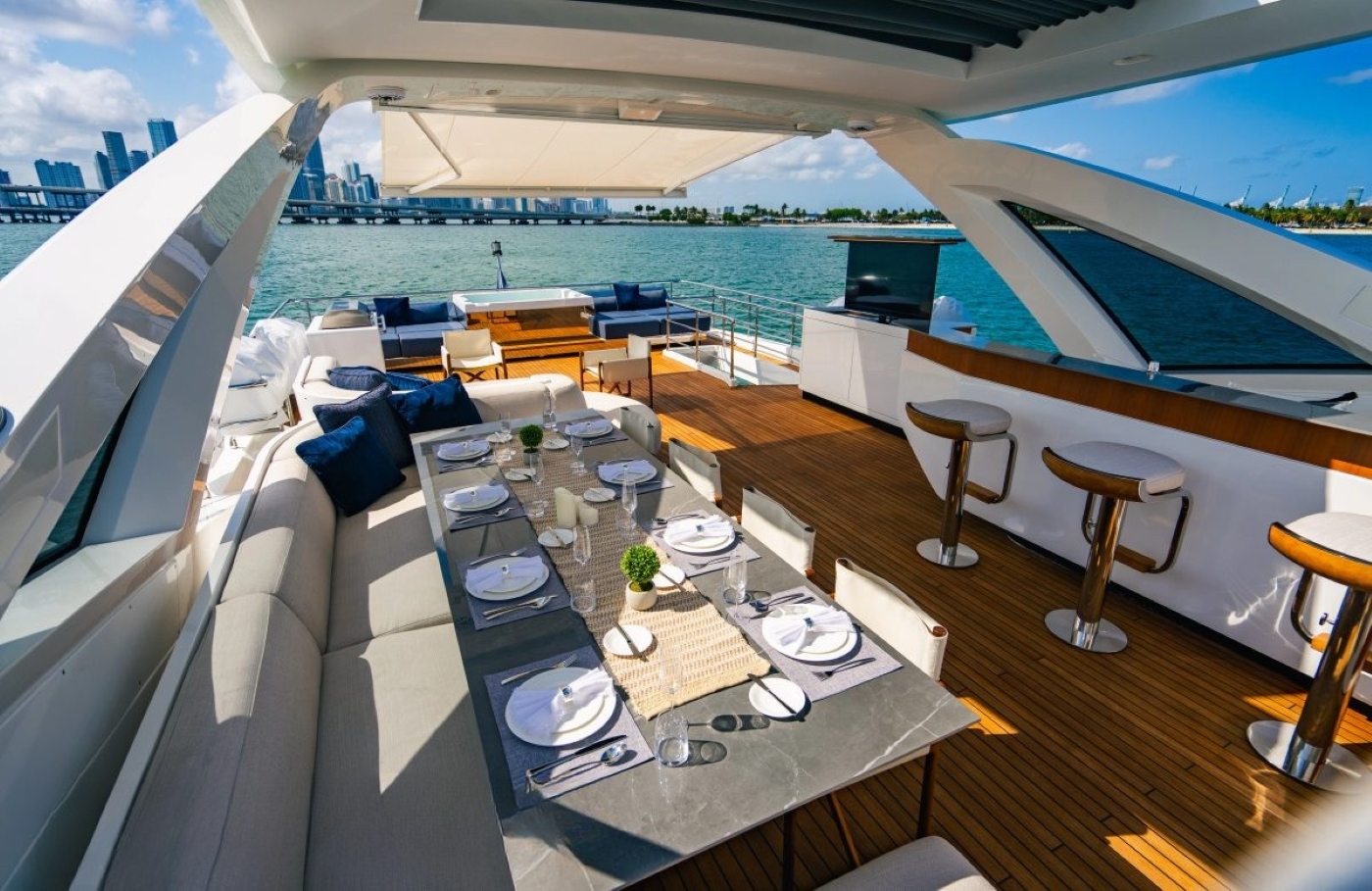 Her flybridge boasts a sunroof which can be opened for full sun exposure or the option to unwind in the shade. This space is sure to be the favourite guest hang out spot with a full bar, a dining table, forward-facing pilot seats and jacuzzi and loungers aft.