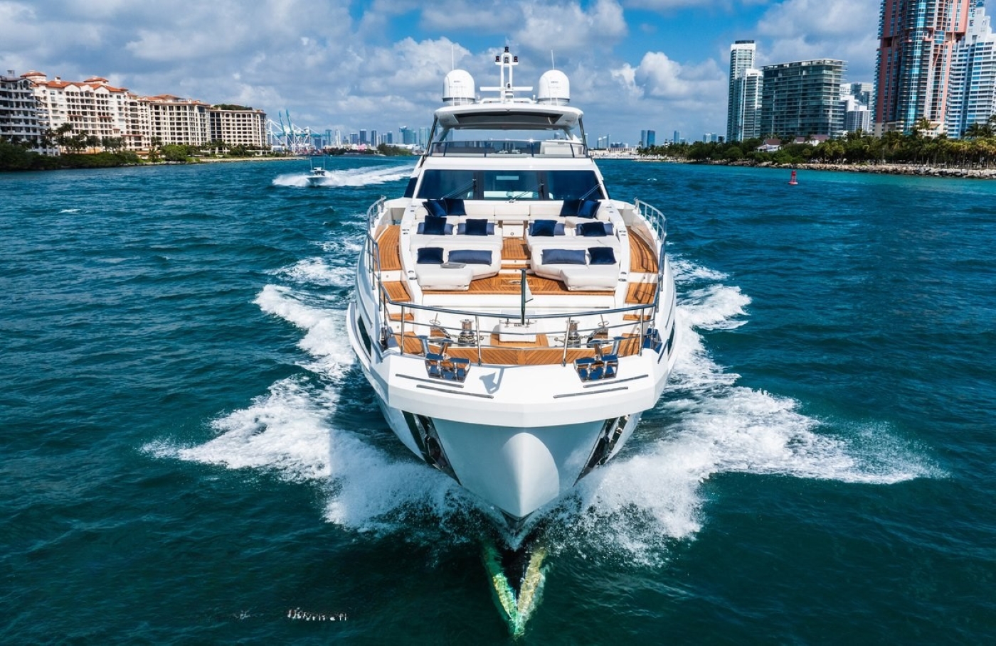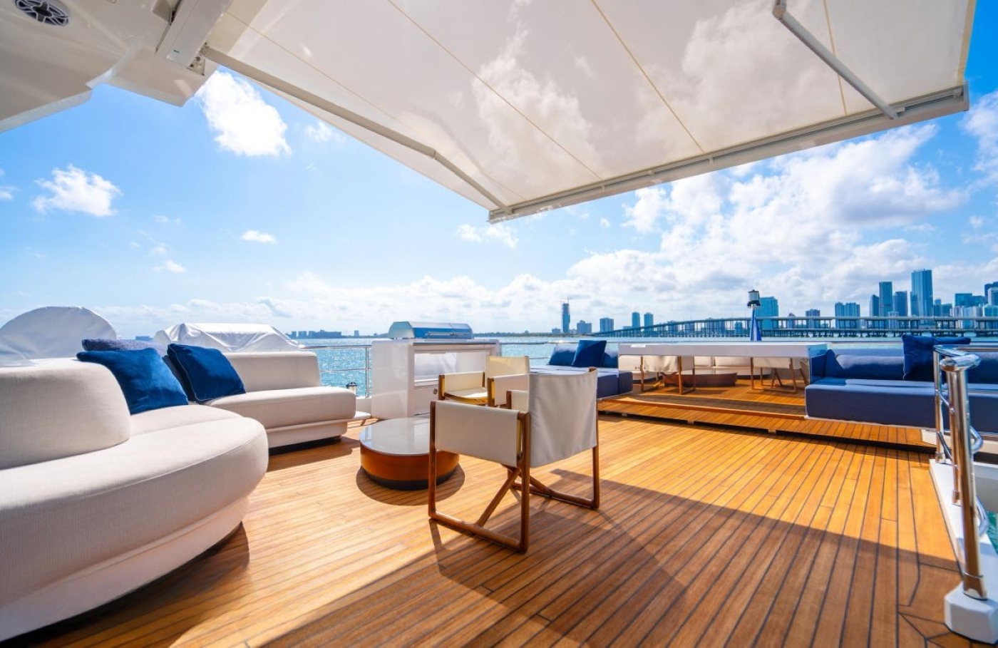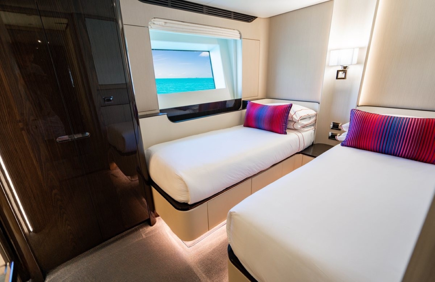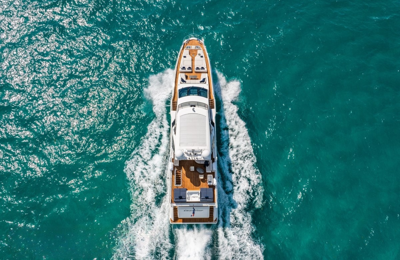 Her flybridge boasts a sunroof which can be opened for full sun exposure or the option to unwind in the shade. This space is sure to be the favourite guest hang out spot with a full bar, a dining table, forward-facing pilot seats and jacuzzi and loungers aft.