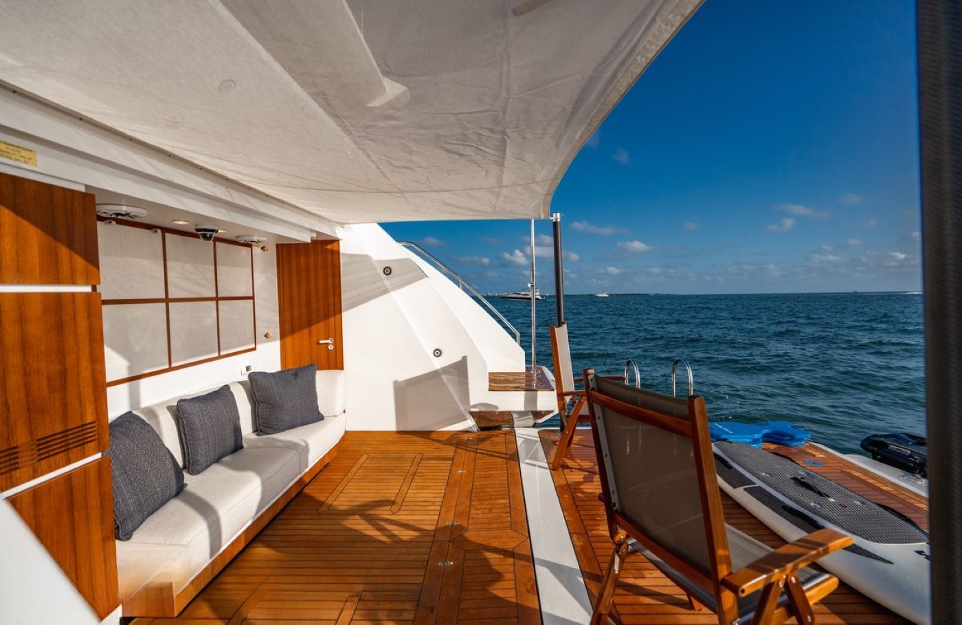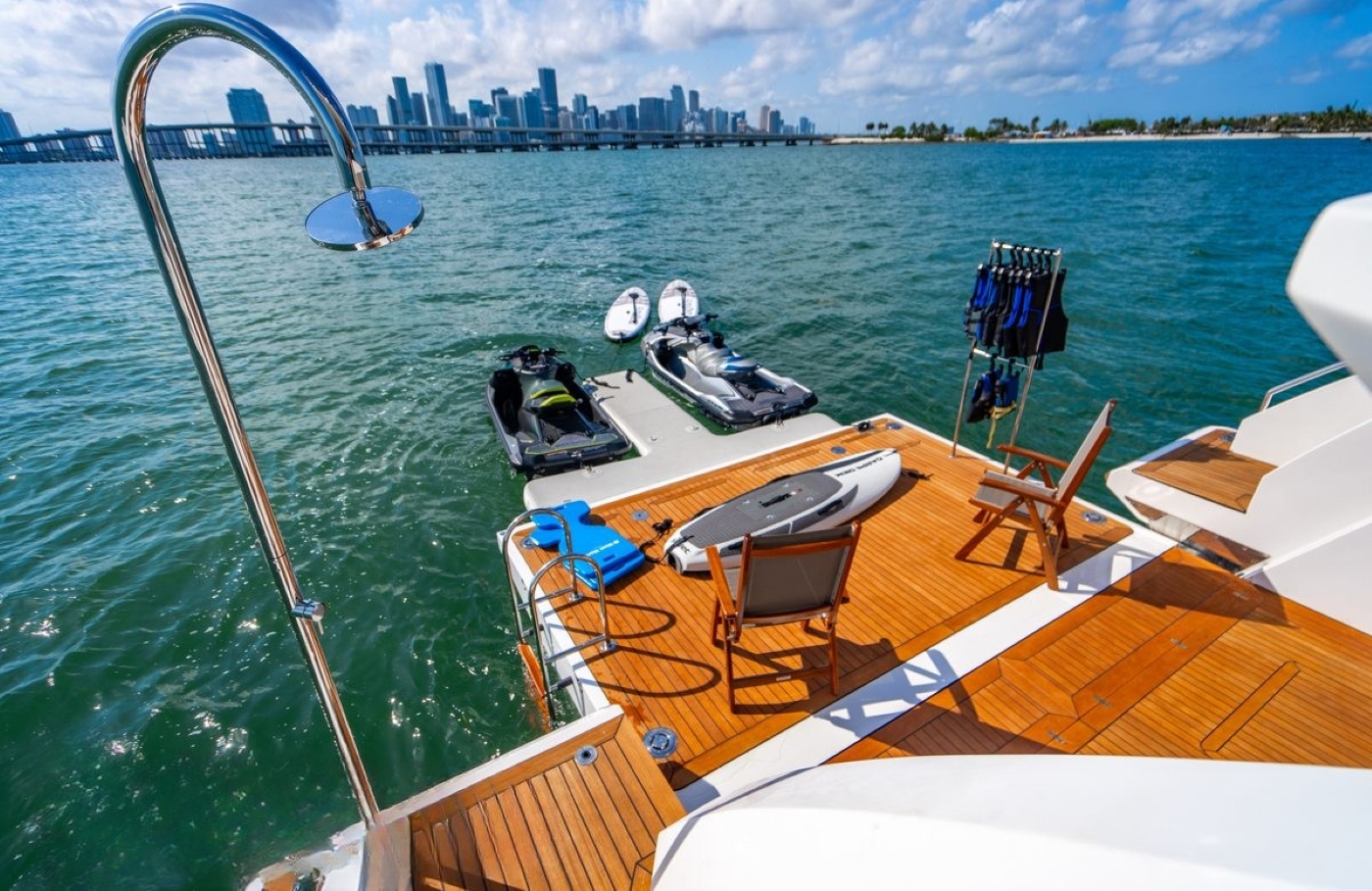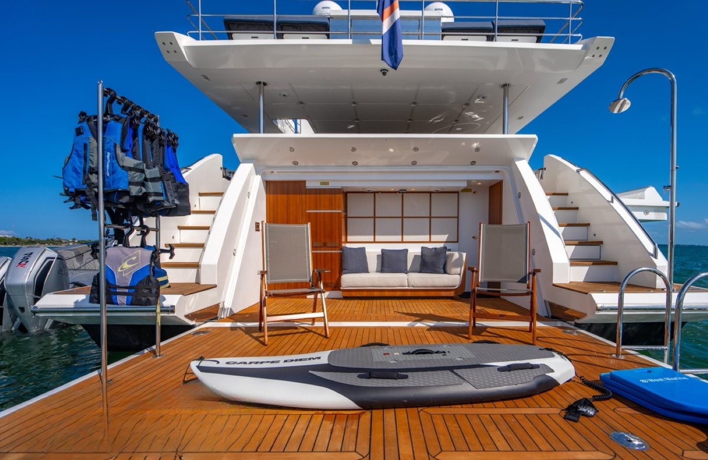 The main aft deck features a cozy alfresco seating space that welcomes guests to relax with a morning coffee or evening drink. Steps lead down to the beach club which has an extended swim platform created once the garage door is opened to water level. This space offers guests the perfect space to participate in or watch the watersports action while at anchor.