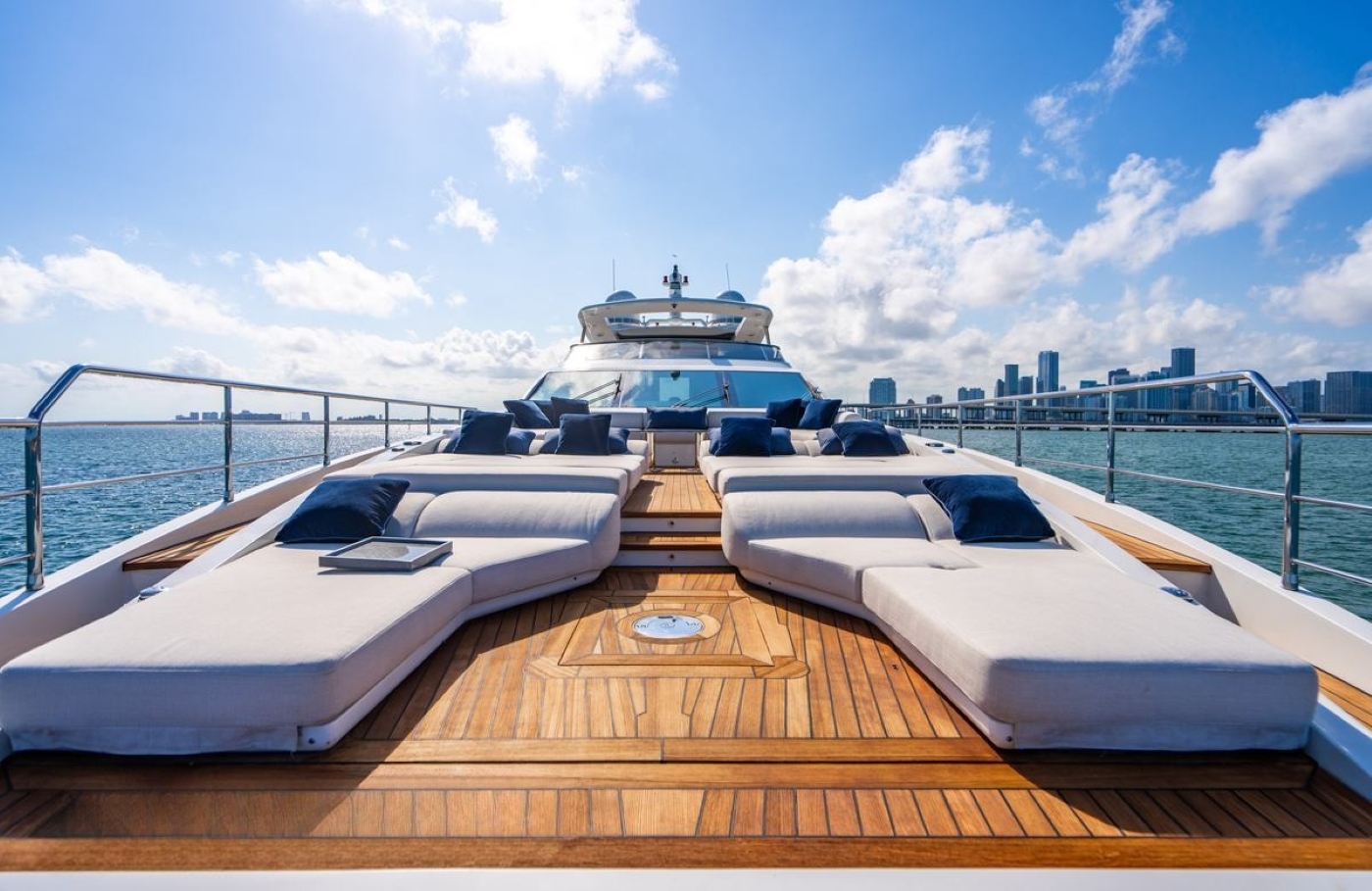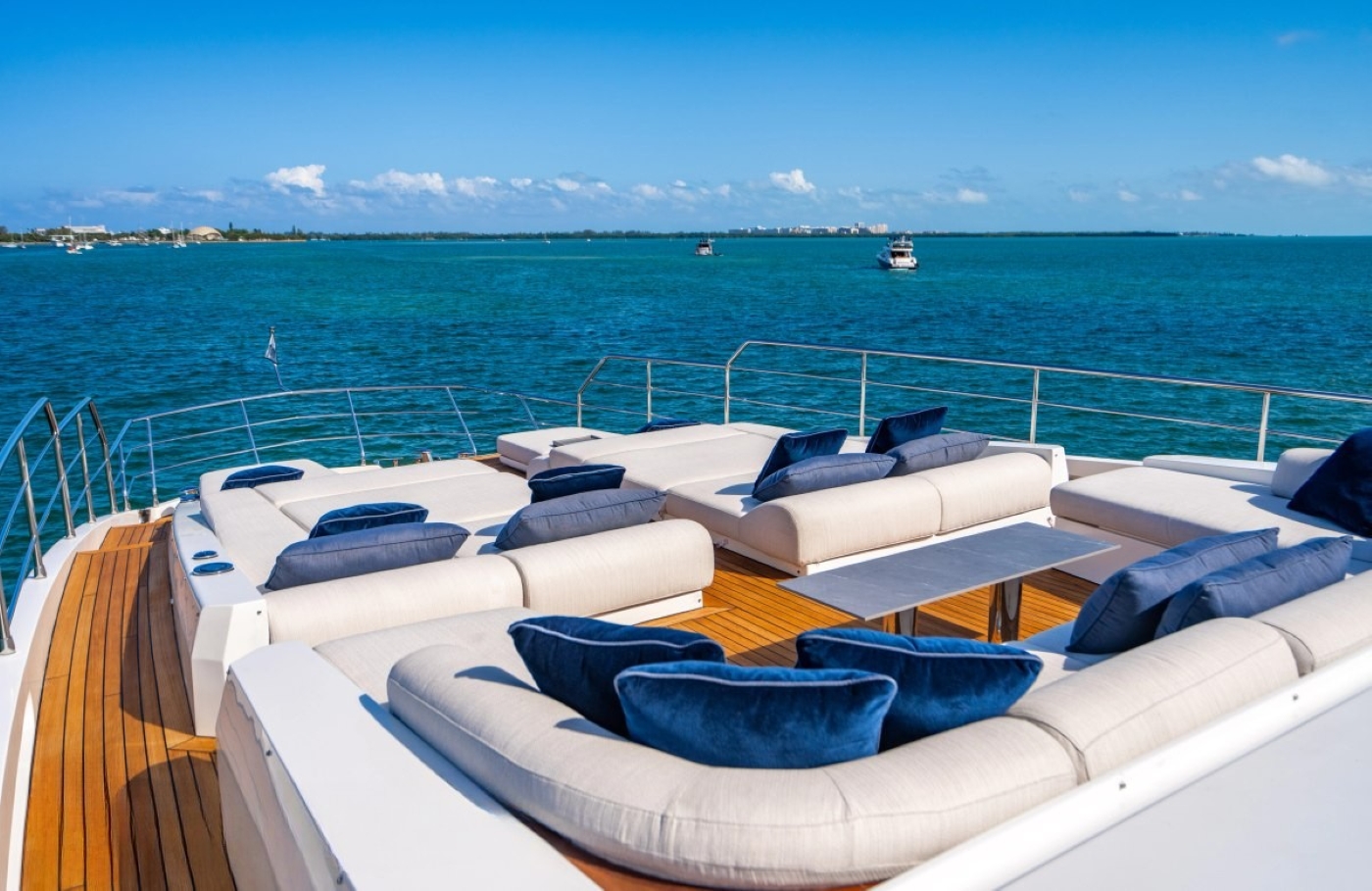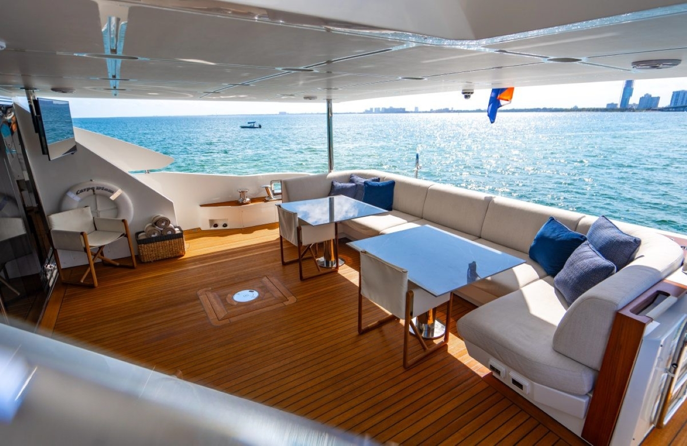 Her spacious foredeck is the prime location for appreciating unobstructed views of the surrounding over the bow. There are huge sun pads and a seating area with a table and optional shade.