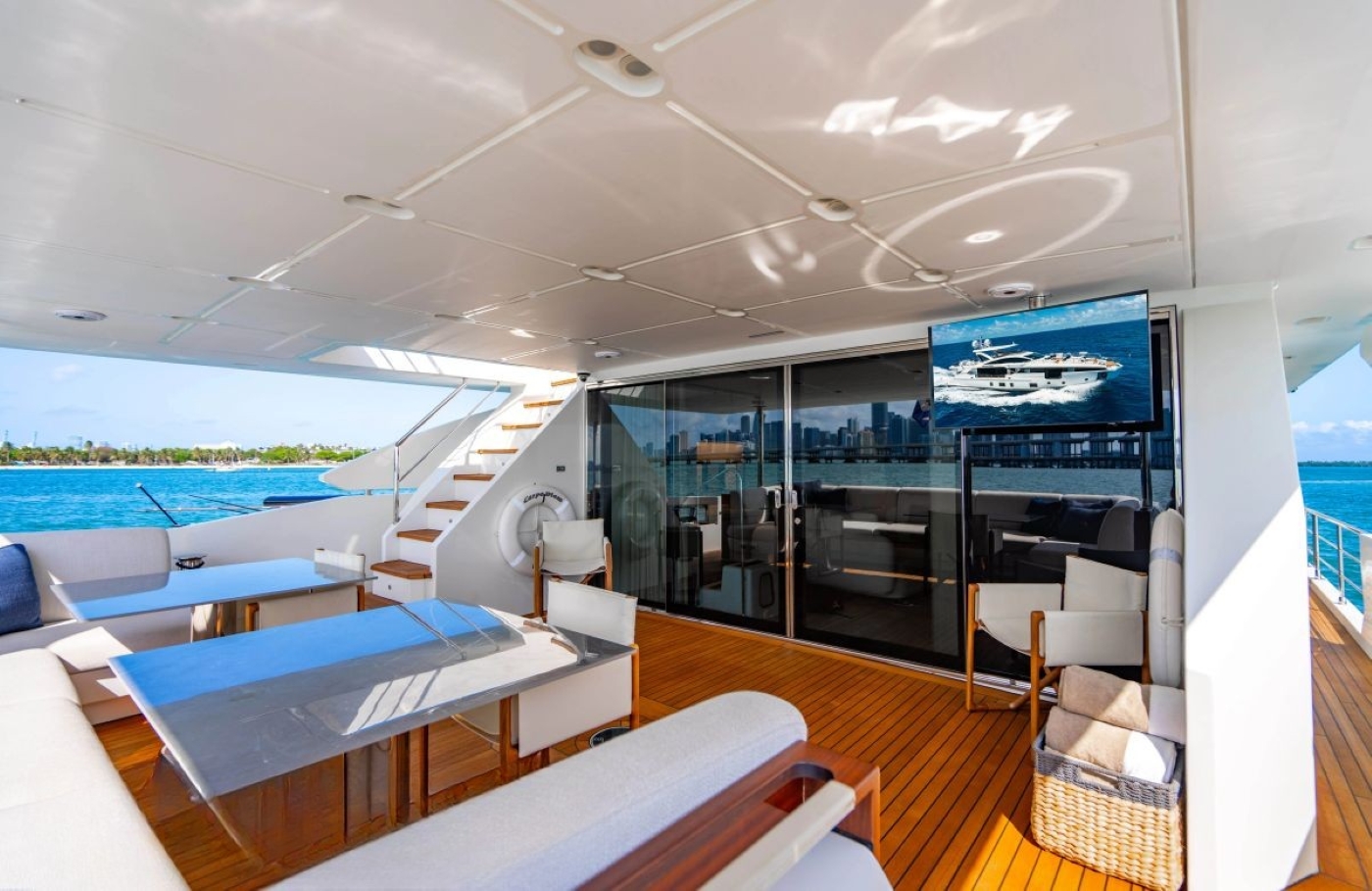 Her aft deck is a welcoming, covered area dedicated to alfresco lounging and dining. A deep, plush sofa surrounds a dining table while forward to starboard, a retractable TV can be lowered to create an outdoor TV/movie theatre.