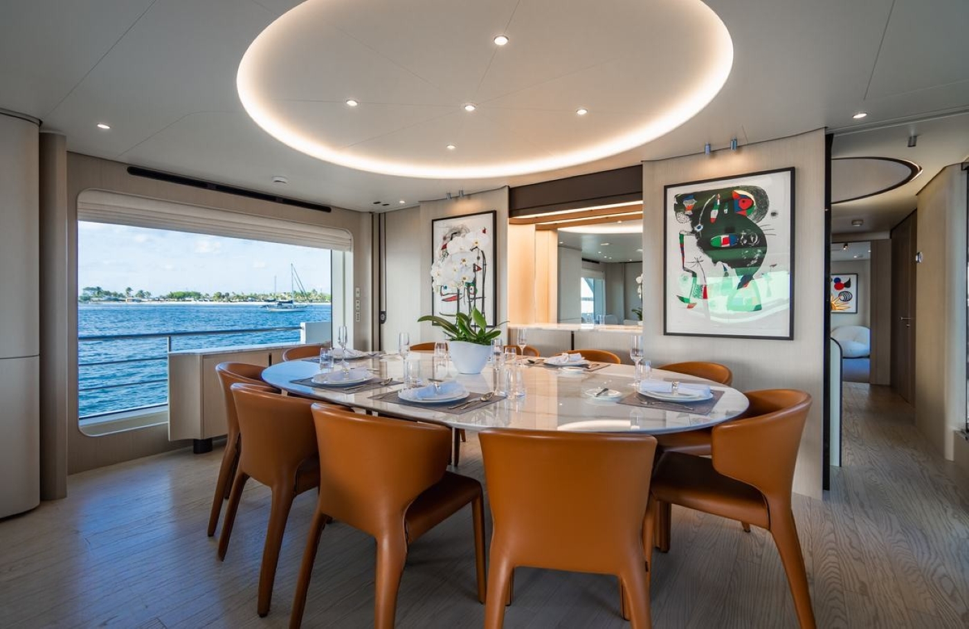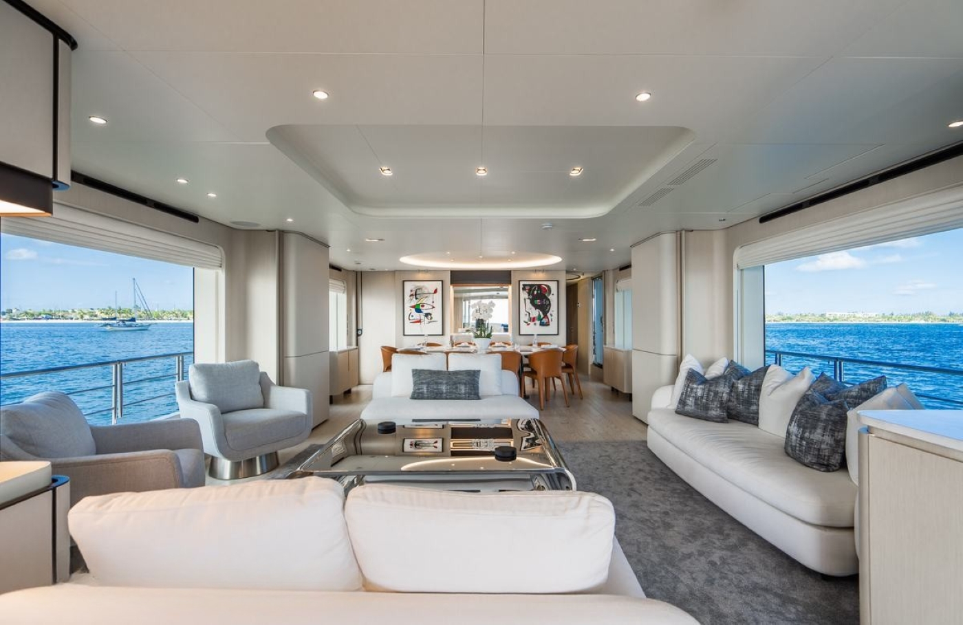 A large sliding door leads into the main salon where guests are greeted by huge windows to either side, giving the impression of extensive interior volume. The space is configured with a lounge to aft and a forward dining setting. The drop-down TV, and plush white couches make for the coziest locale for a movie night with family and friends. The attention to detail seen on her interior is second to none, with special attention paid to the modern light fixtures and ultra-comfortable furnishings.