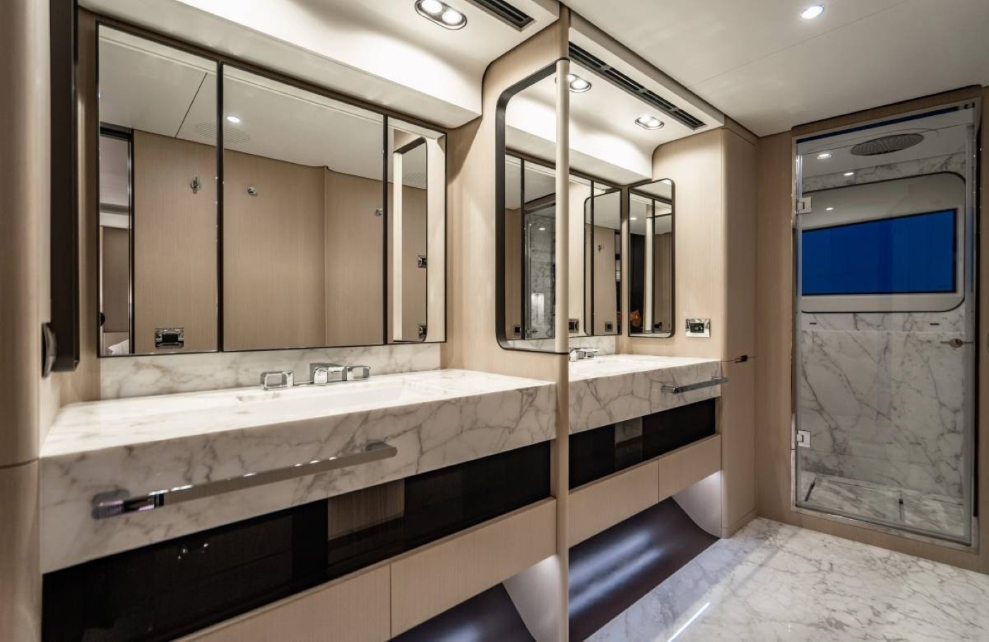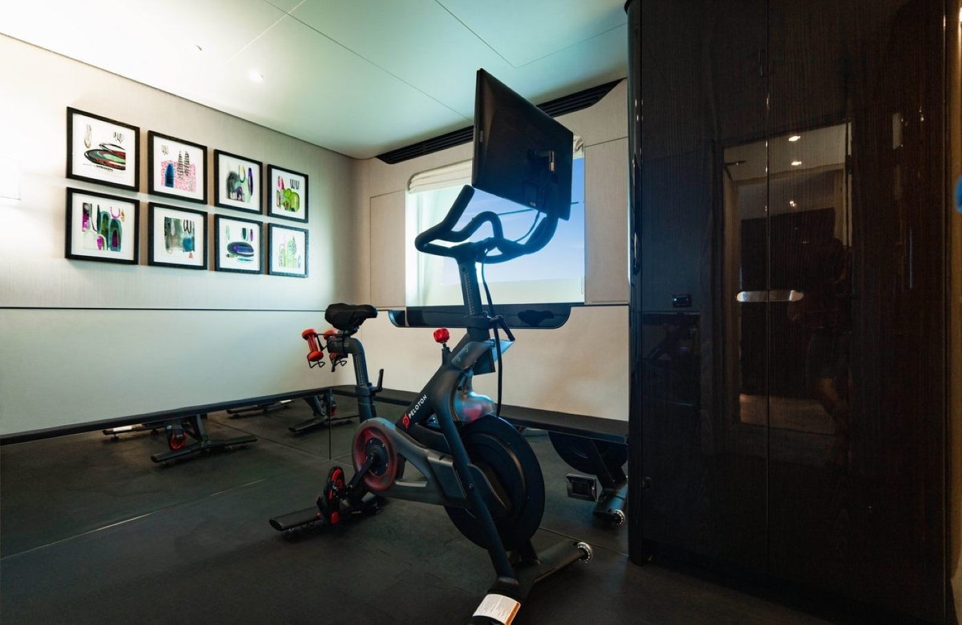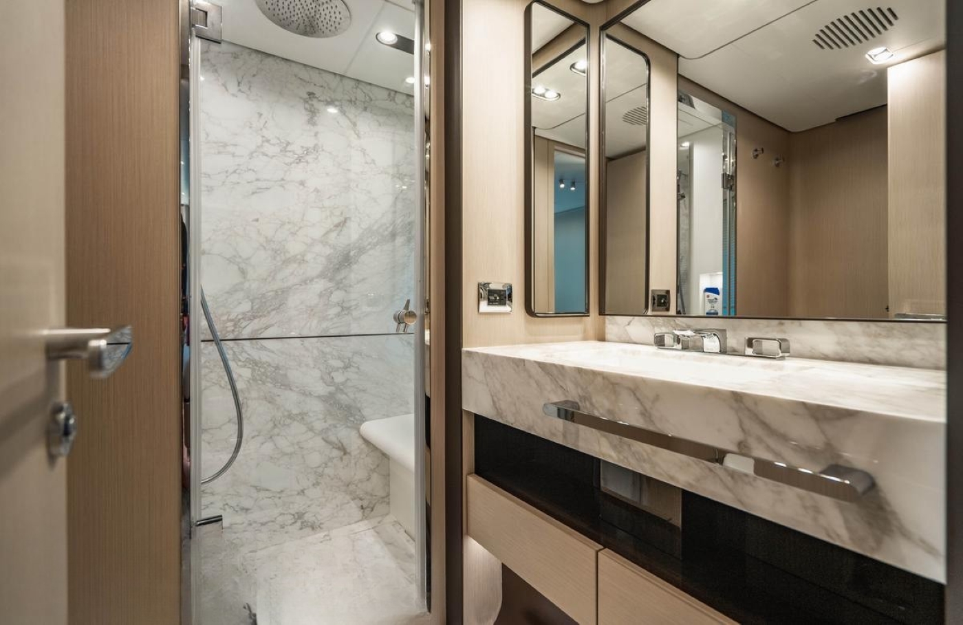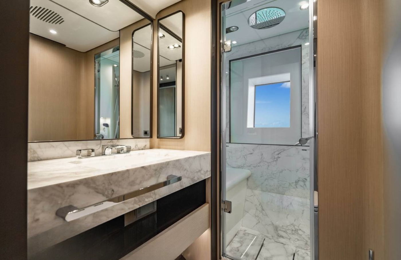 CARPE DIEM comfortably welcomes eight guests in four well-appointed staterooms. The master suite is located forward on the main deck and benefits from large windows which fill the space with light. The master en-suite bathroom is spa-like, adorned in marble with double sinks and a large standing rainfall shower with a marble bench. The three additional staterooms are found on the lower deck and can be accessed via a set of stairs. Two queen VIPs are located aft, a twin stateroom is forward to port and a fourth cabin has been converted to a gym with a peloton, free weights and yoga mats. Each one of CARPE DIEMs cabins features a bedside table, reading lights, a full-length mirror and wardrobe and a private en-suite standing rainfall showers.