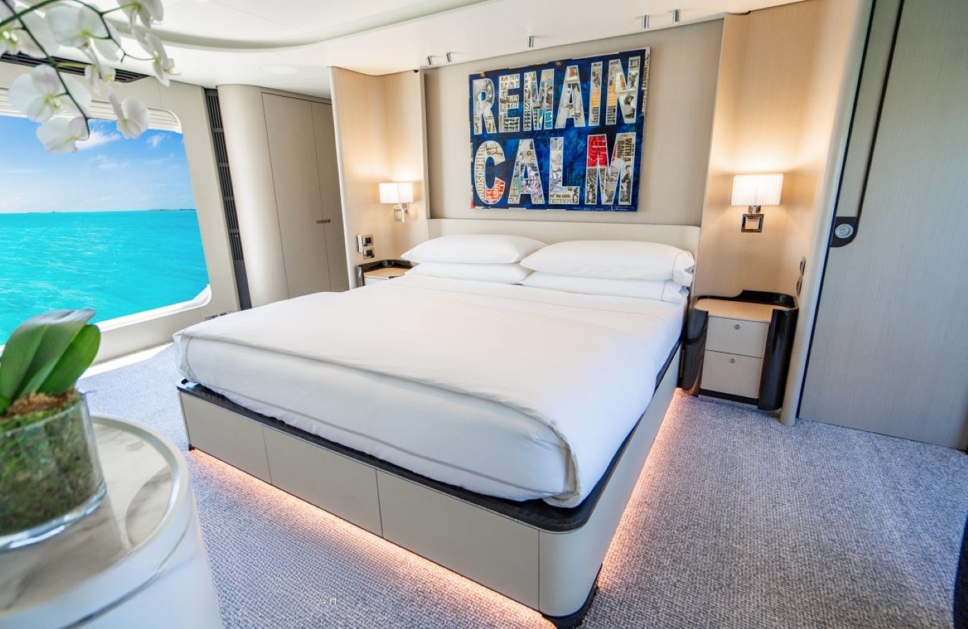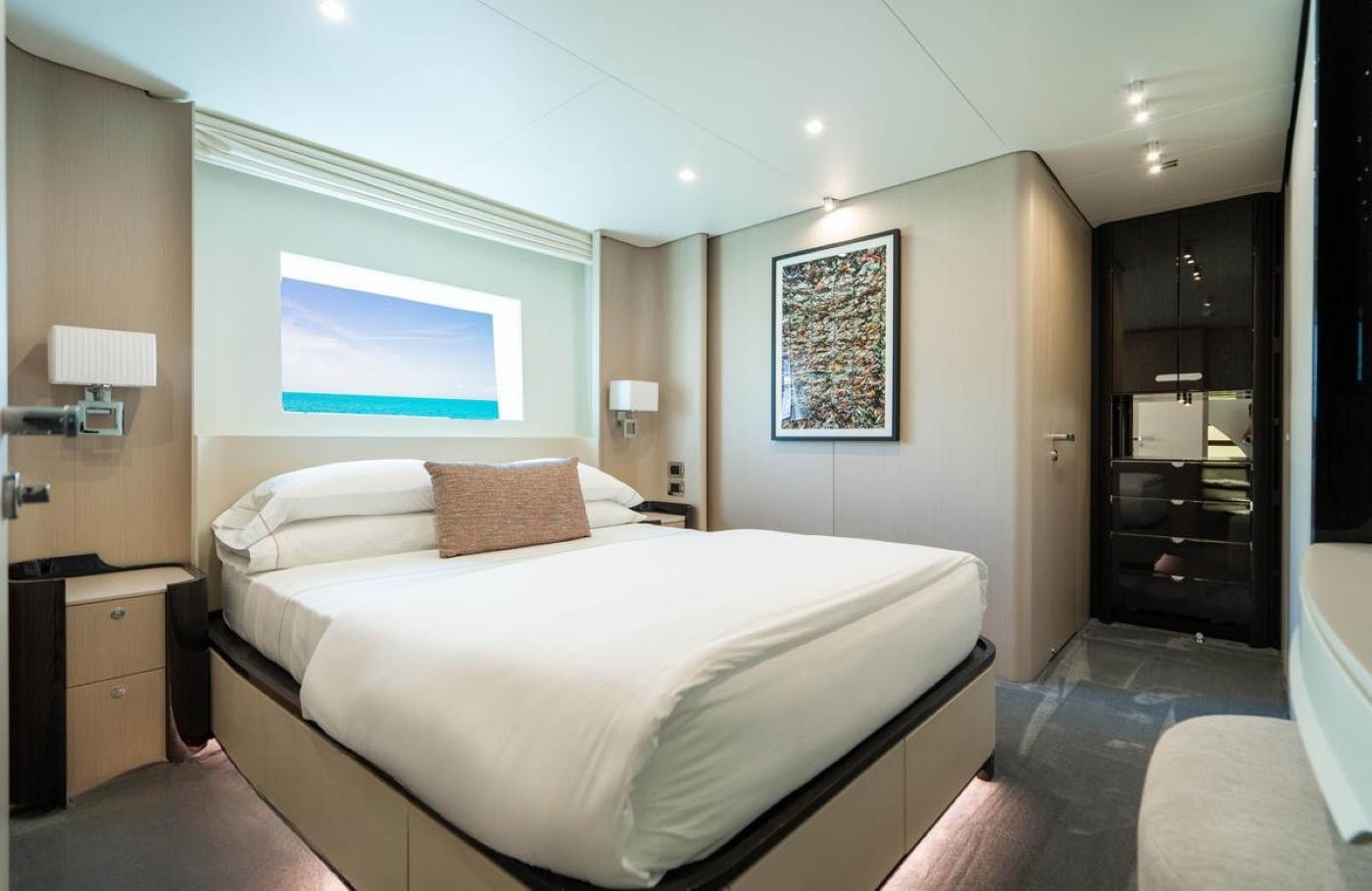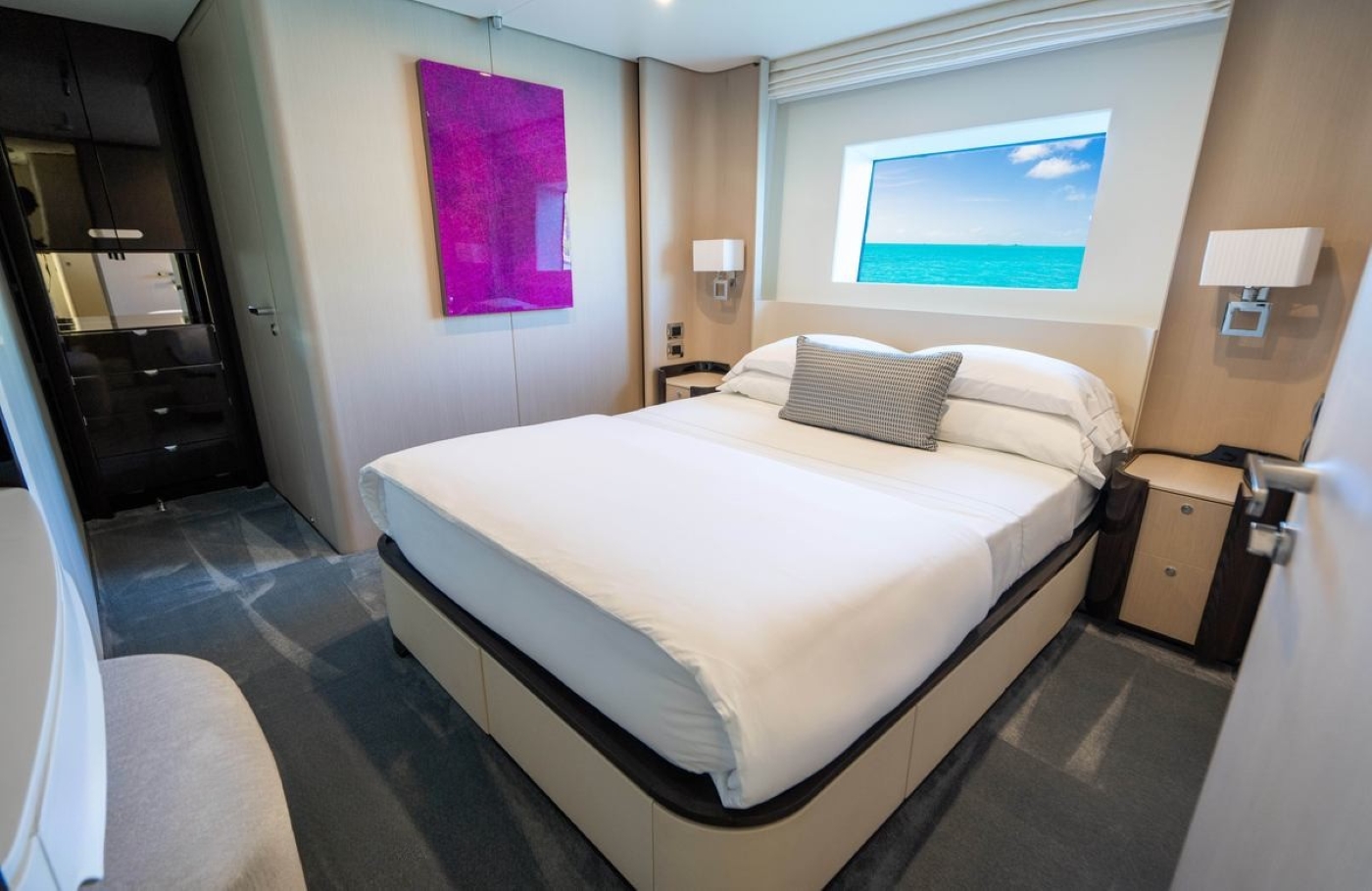 CARPE DIEM comfortably welcomes eight guests in four well-appointed staterooms. The master suite is located forward on the main deck and benefits from large windows which fill the space with light. The master en-suite bathroom is spa-like, adorned in marble with double sinks and a large standing rainfall shower with a marble bench. The three additional staterooms are found on the lower deck and can be accessed via a set of stairs. Two queen VIPs are located aft, a twin stateroom is forward to port and a fourth cabin has been converted to a gym with a peloton, free weights and yoga mats. Each one of CARPE DIEMs cabins features a bedside table, reading lights, a full-length mirror and wardrobe and a private en-suite standing rainfall showers.