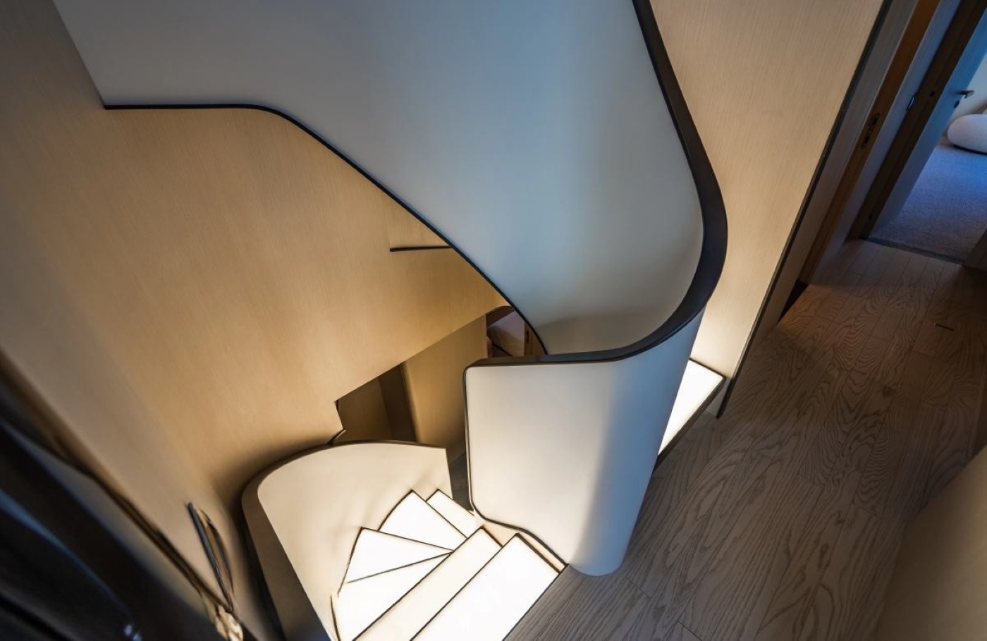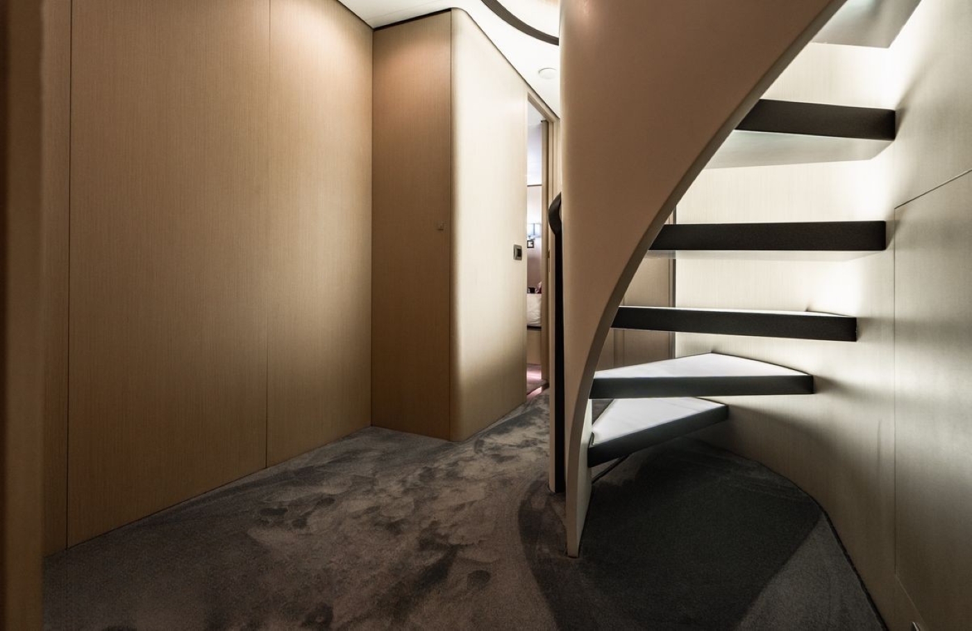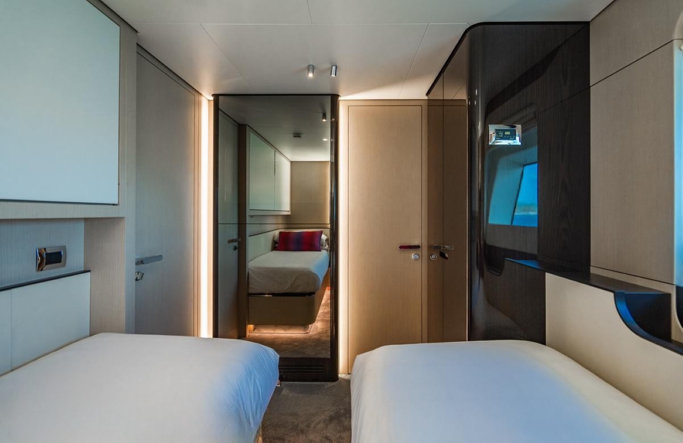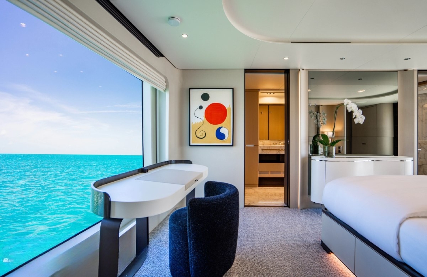 CARPE DIEM comfortably welcomes eight guests in four well-appointed staterooms. The master suite is located forward on the main deck and benefits from large windows which fill the space with light. The master en-suite bathroom is spa-like, adorned in marble with double sinks and a large standing rainfall shower with a marble bench. The three additional staterooms are found on the lower deck and can be accessed via a set of stairs. Two queen VIPs are located aft, a twin stateroom is forward to port and a fourth cabin has been converted to a gym with a peloton, free weights and yoga mats. Each one of CARPE DIEMs cabins features a bedside table, reading lights, a full-length mirror and wardrobe and a private en-suite standing rainfall showers.