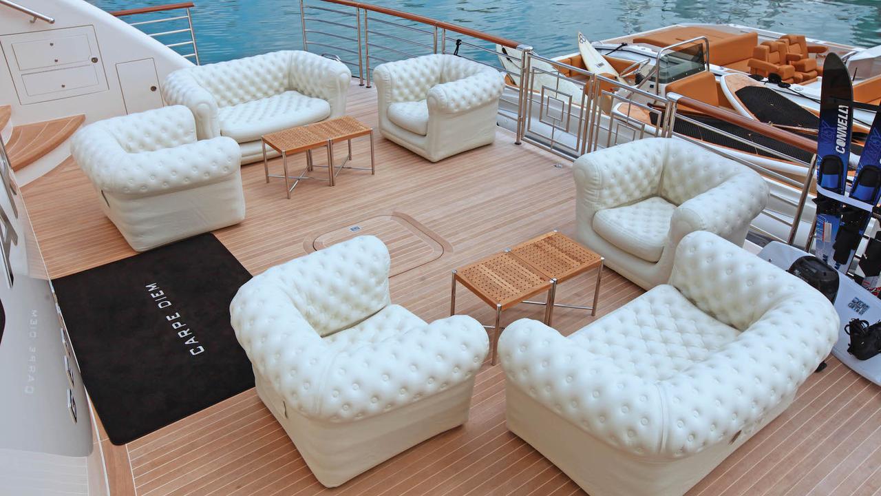 CARPE DIEM features a number of outdoor entertainment areas, including a large aft deck with a large al-fresco dining table and bar. The upper deck offers another al-fresco dining option and fixed seating aft, together with a large Sun-deck with Spa Pool, sunbathing and seating areas, as well as another bar. The tenders are stored on the sun-deck aft.