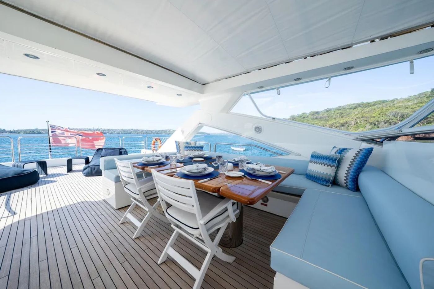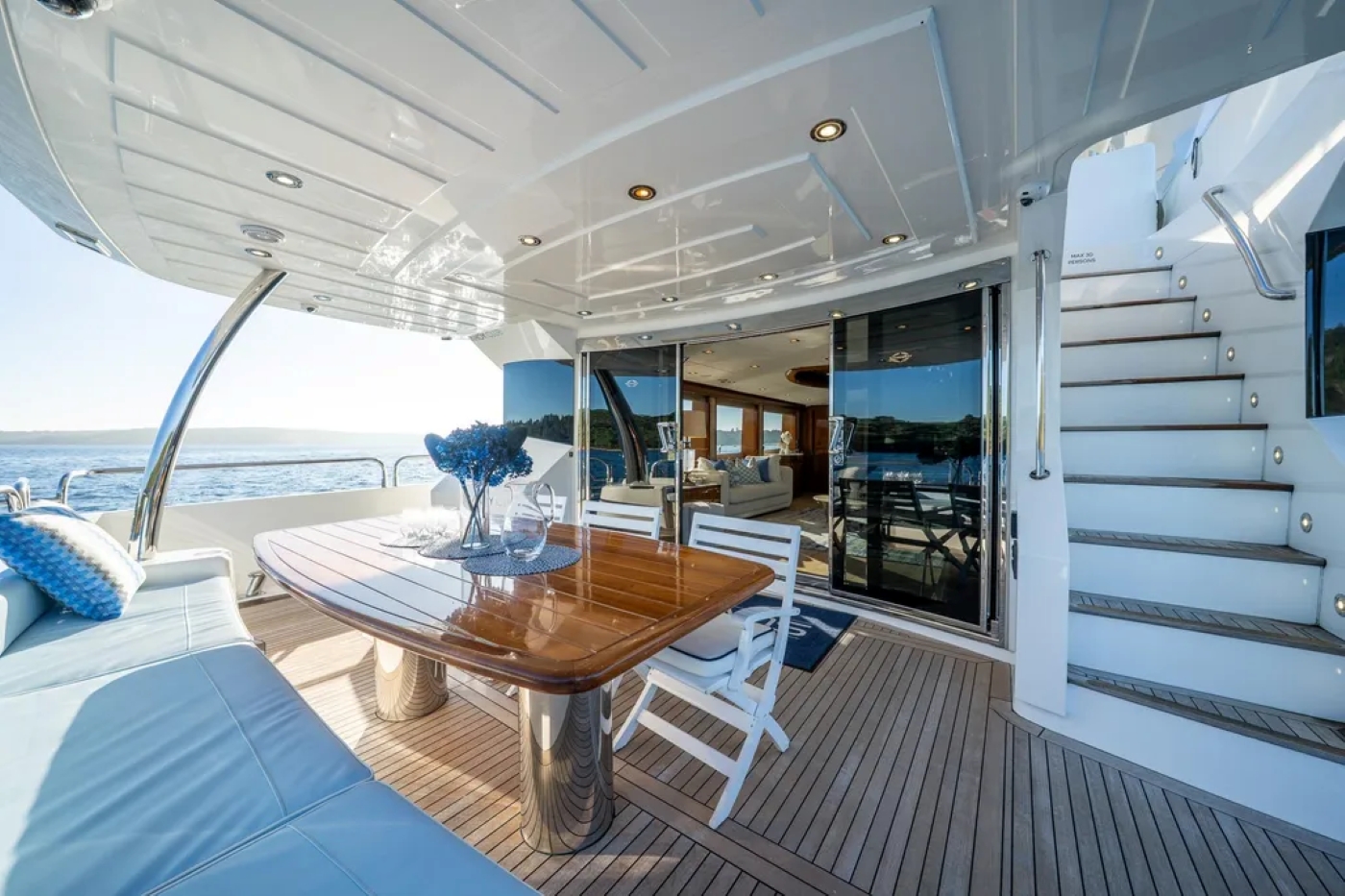 On the main deck aft there is another dining setting with a bench seat and moveable chairs plus steps leading down to the large swim platform.