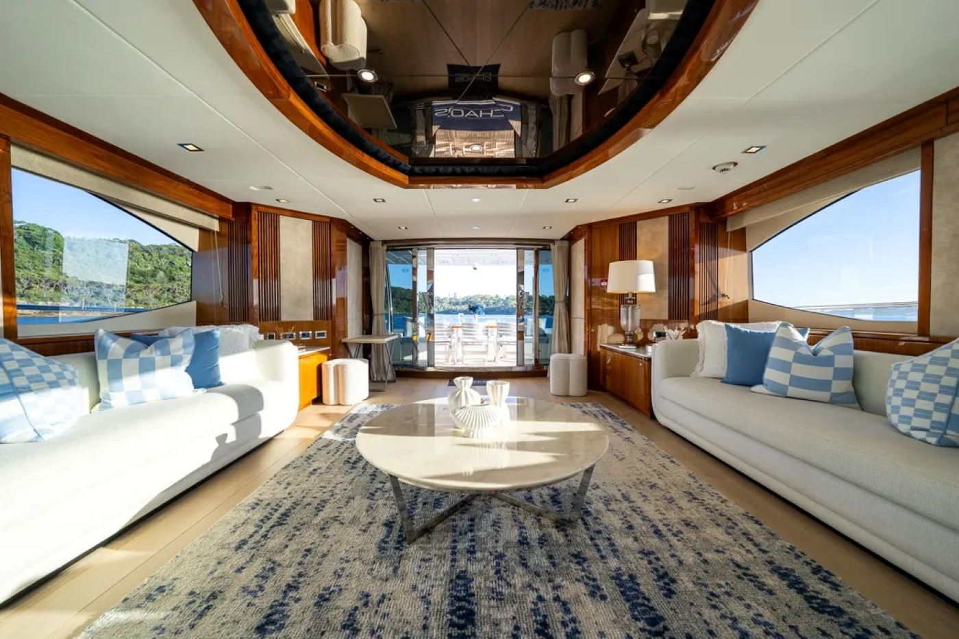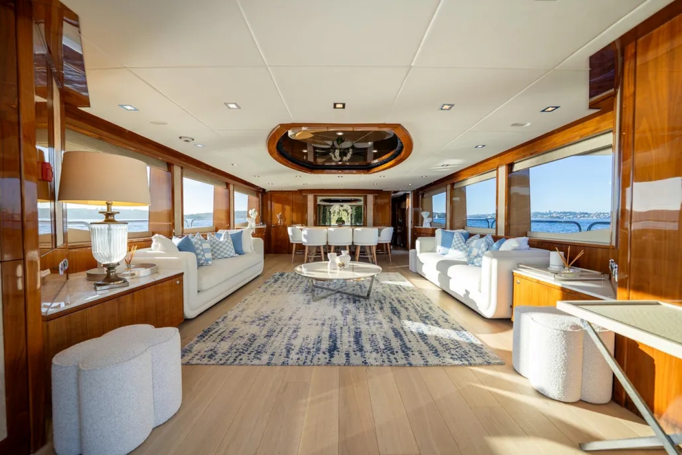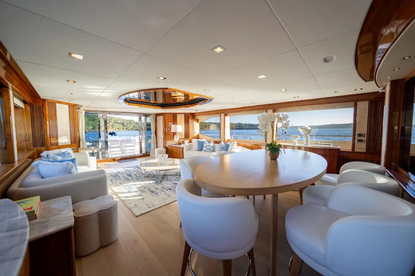 The light and bright main salon is set up with an arrangement of plush sofas surrounding a coffee table in the aft position and a sociable oval dining table forward. The panoramic windows fill the space with light and the unique parquet flooring creates a stylish atmosphere.