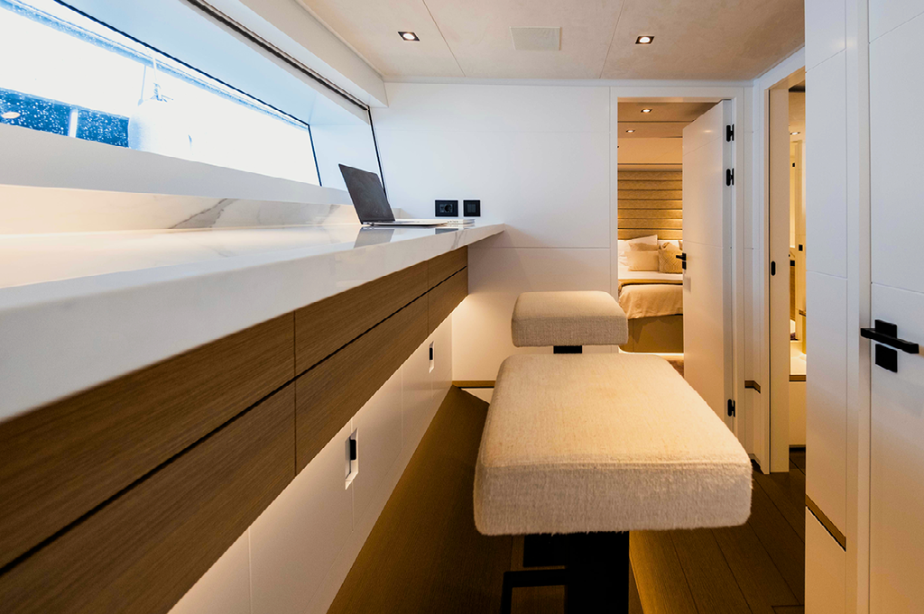 The interior showcases Sinot's signature sophisticated design philosophy, creating an atmosphere of contemporary elegance throughout. The main saloon offers a refined social hub with comfortable seating areas and panoramic windows providing abundant natural light. Every detail has been carefully considered to maximize both comfort and functionality, with premium finishes and thoughtful layout ensuring the ultimate luxury experience for guests.