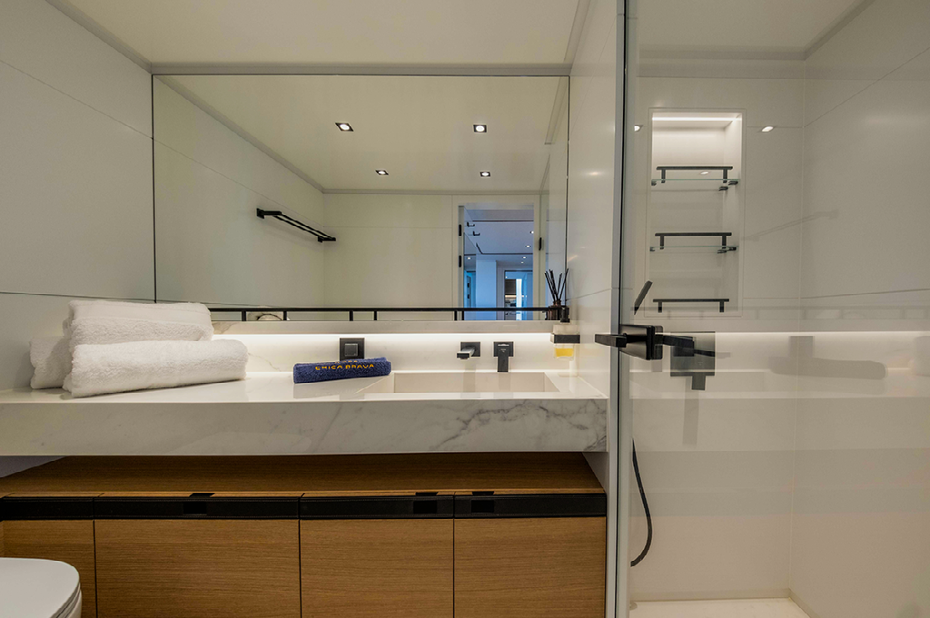 The yacht features 2 elegantly designed double cabins configured to sleep 4 guests in absolute comfort. The master suite boasts a luxurious king-size bed, while the guest cabin offers a spacious queen bed. Both cabins are fully equipped with en-suite facilities including showers, entertainment systems with TV, and comfortable sofa seating areas, ensuring privacy and comfort for all guests.