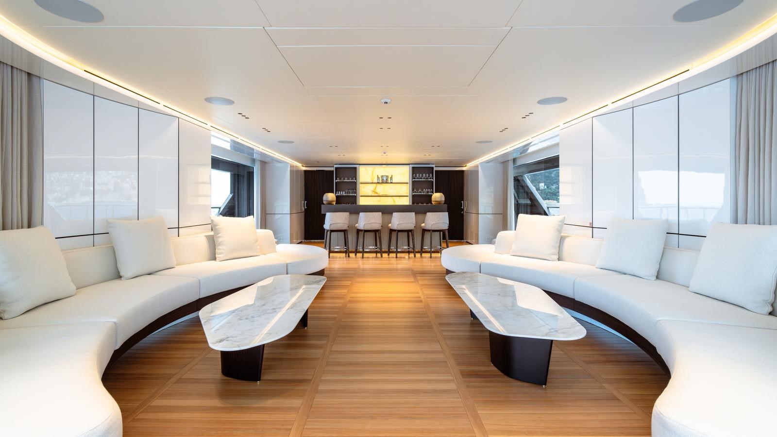 Custom built sofas curve along each side of the main salon providing ample seating for guests inside, while a backlit Onice marble bar is forward. The curves are echoed in the sliding doors onto the aft deck which full open to make one large entertainment space. There is a second generous salon in the sky lounge, where families can cosy up for movie night, enjoy a sheltered dinner or drink at the bar. An additional cabin is set up for spa treatments and doubles as a gym.