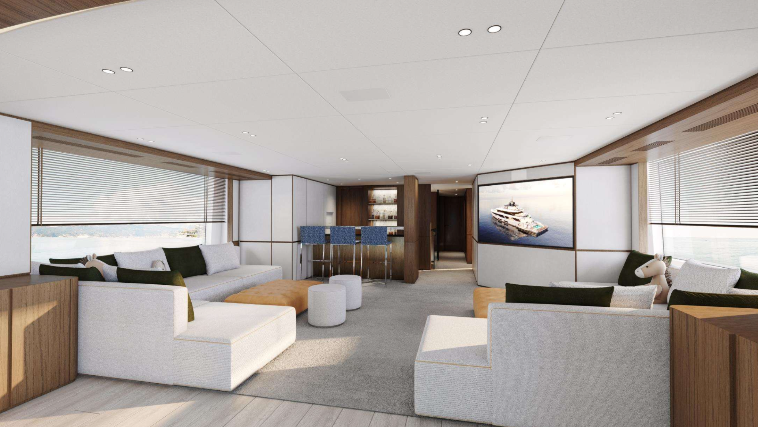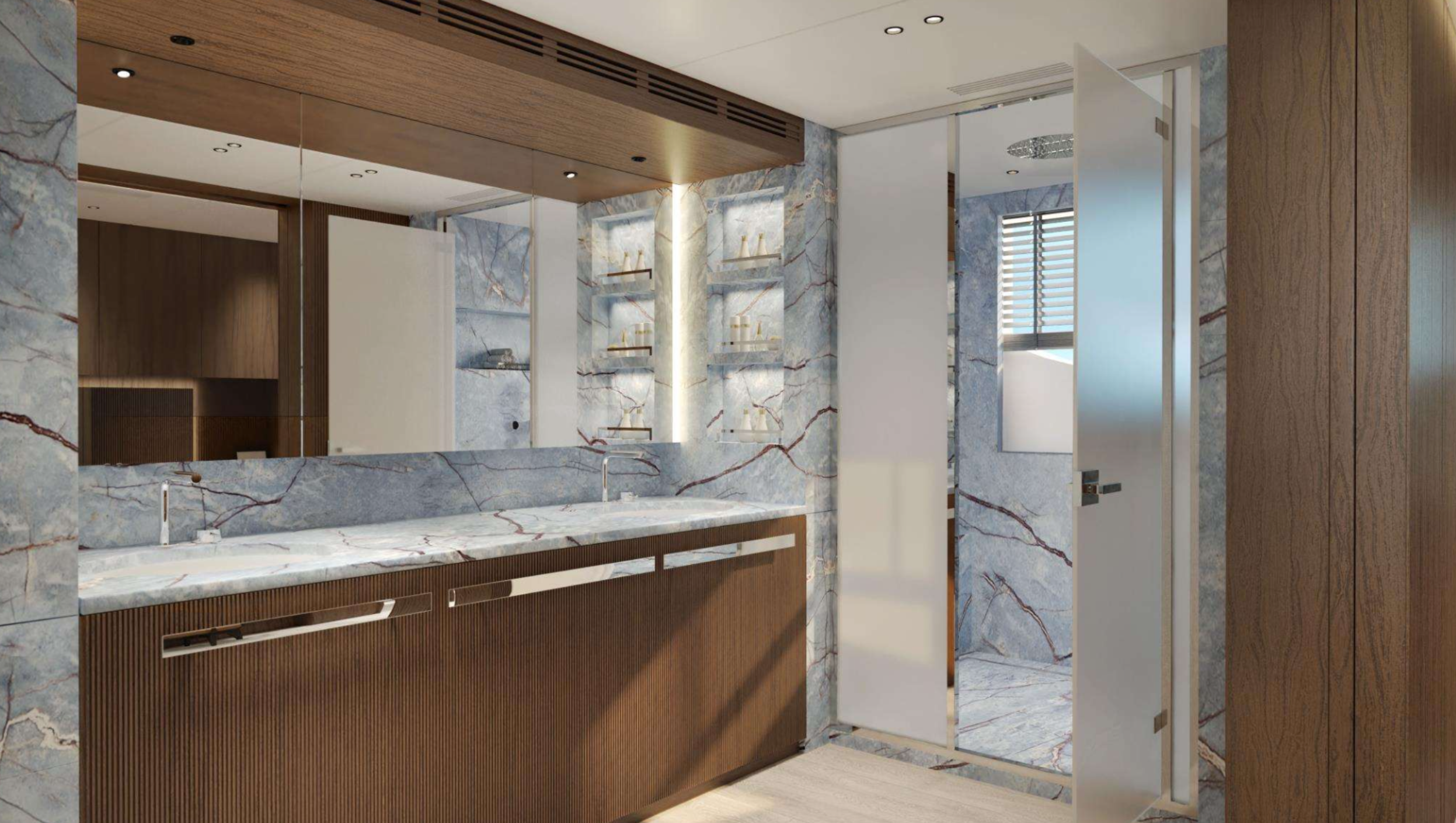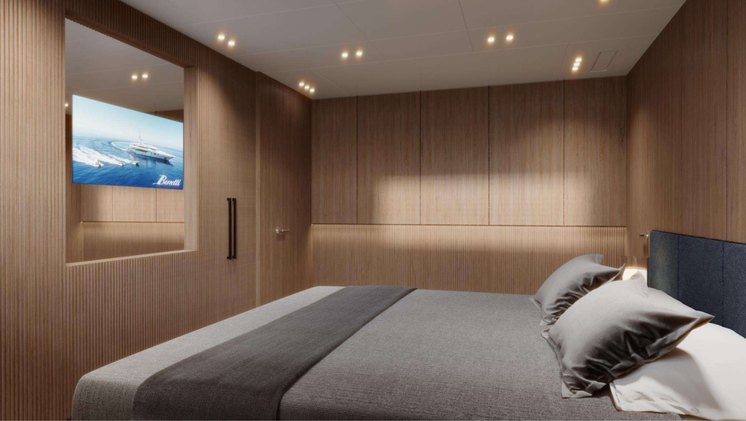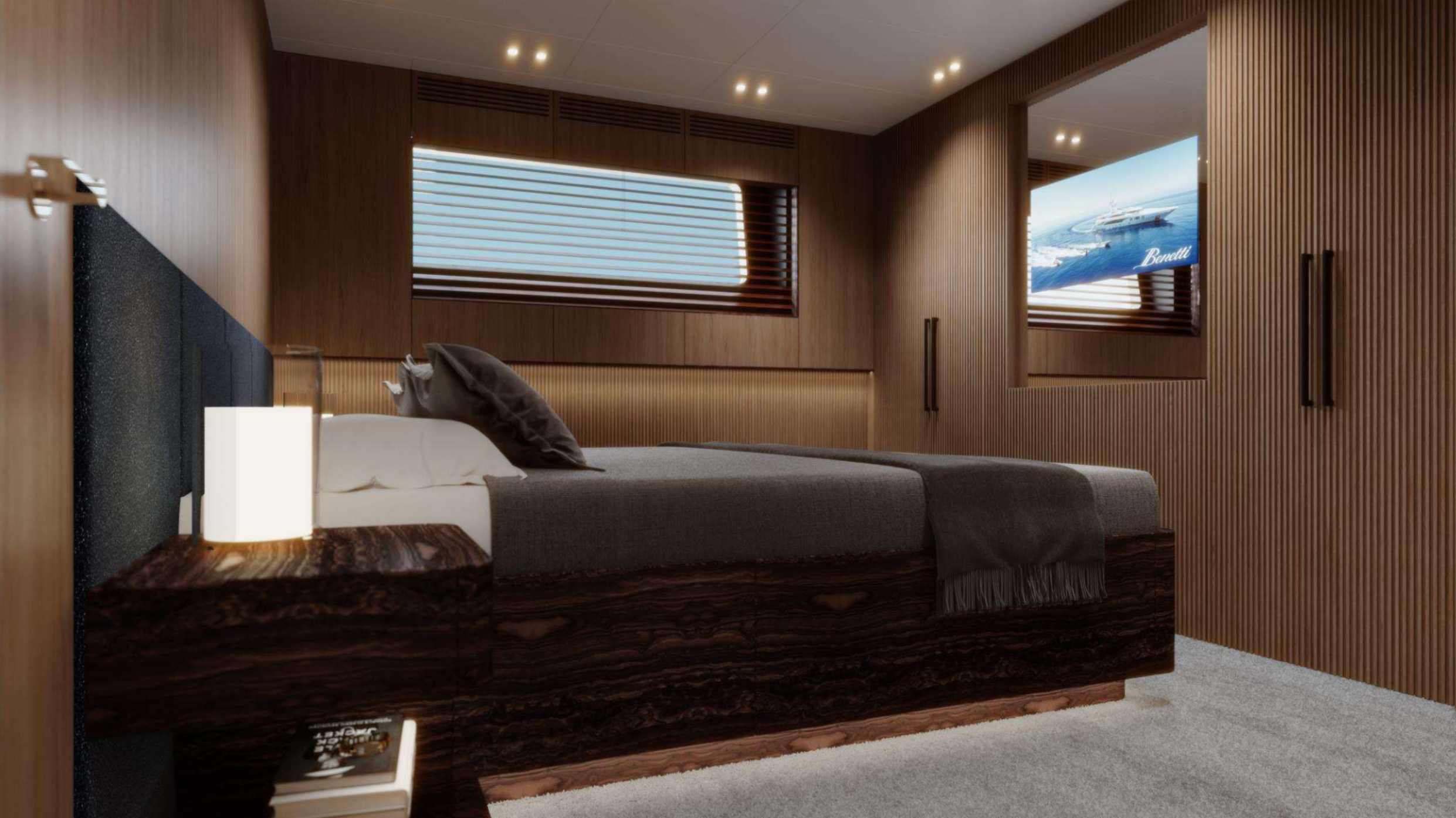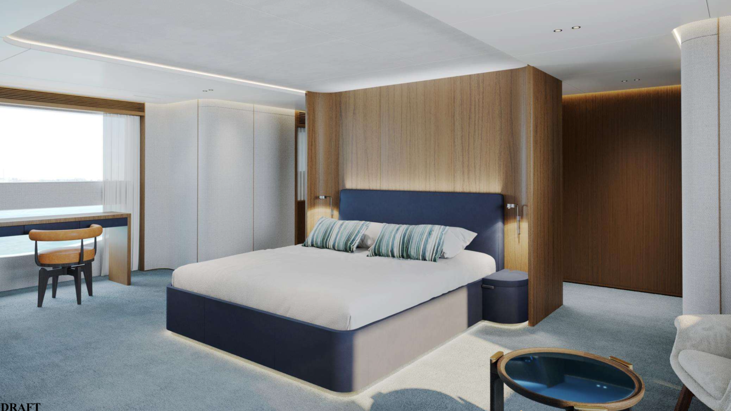 She features a five-stateroom configuration accommodating up to 10 guests, with her master suite situated on the main deck. The suite includes a central bed, while the vanity area has been moved forward to create a concealed ensuite bathroom.