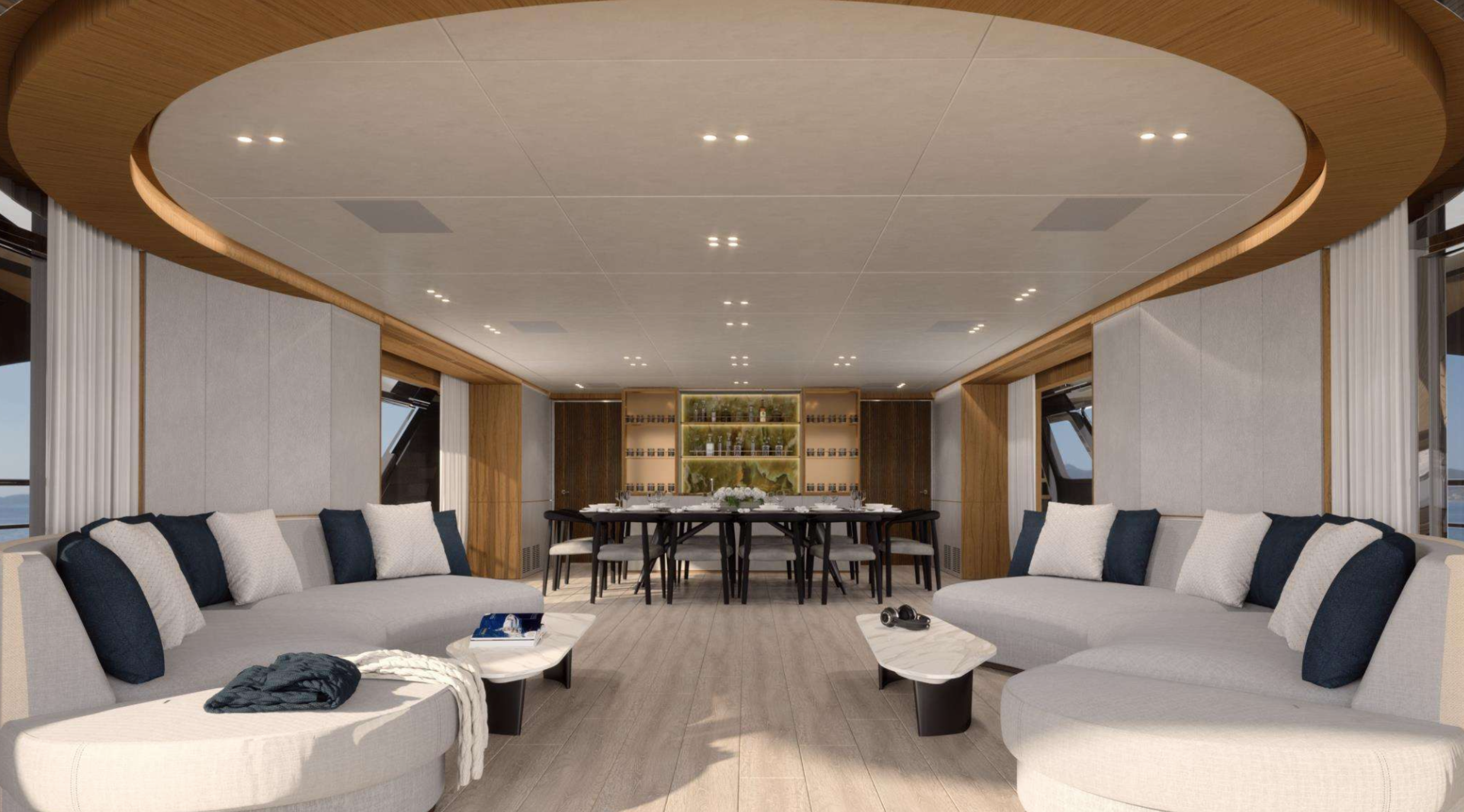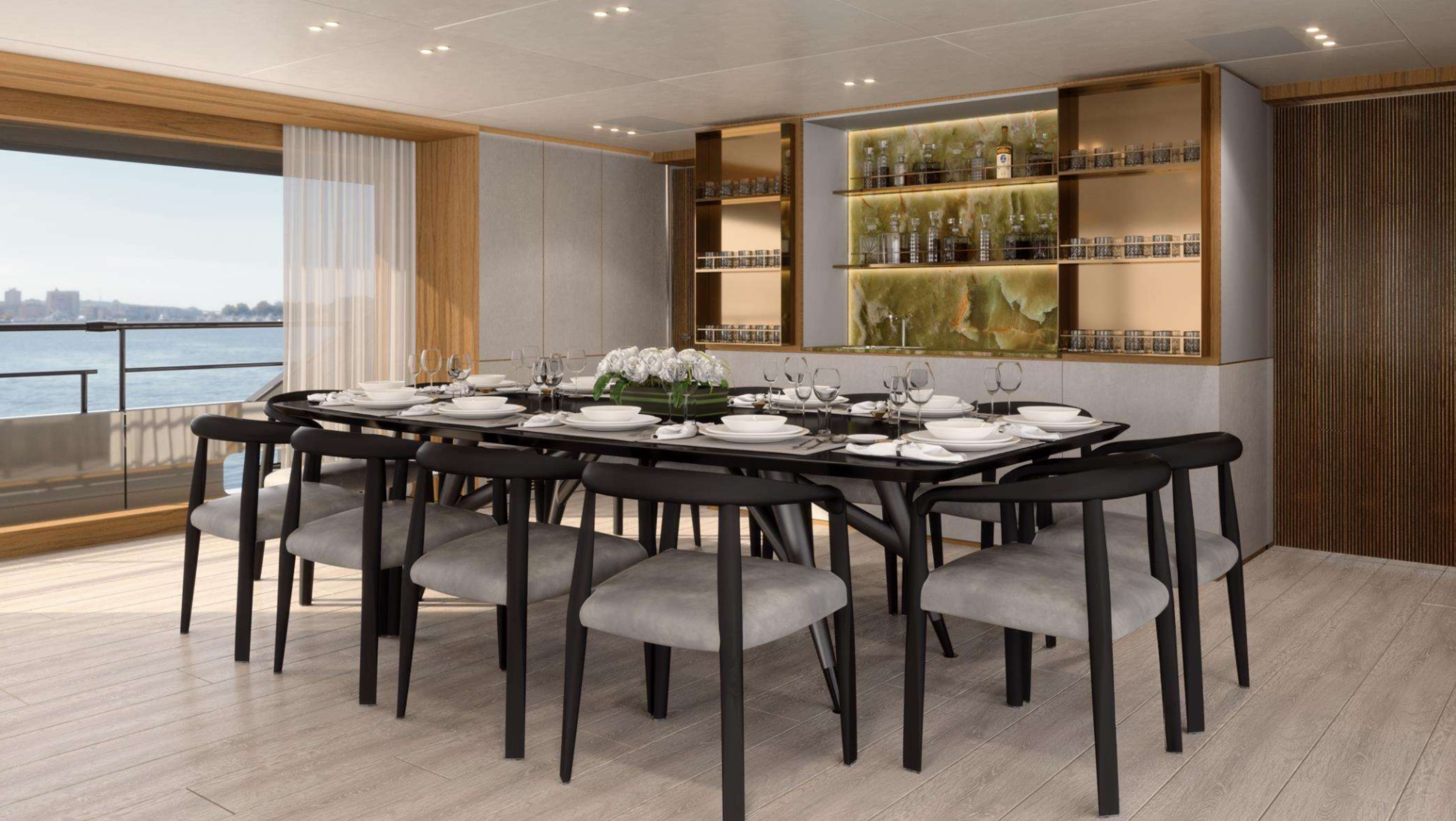 Characterised by Benetti’s unique Oasis Deck® this superb superyacht boasts side wings that open the space even further, creating a huge water’s edge terrace. Her upper deck has been customised to include an alfresco space with a quartzite-topped table, while her sun deck has been designed for relaxing and entertaining.