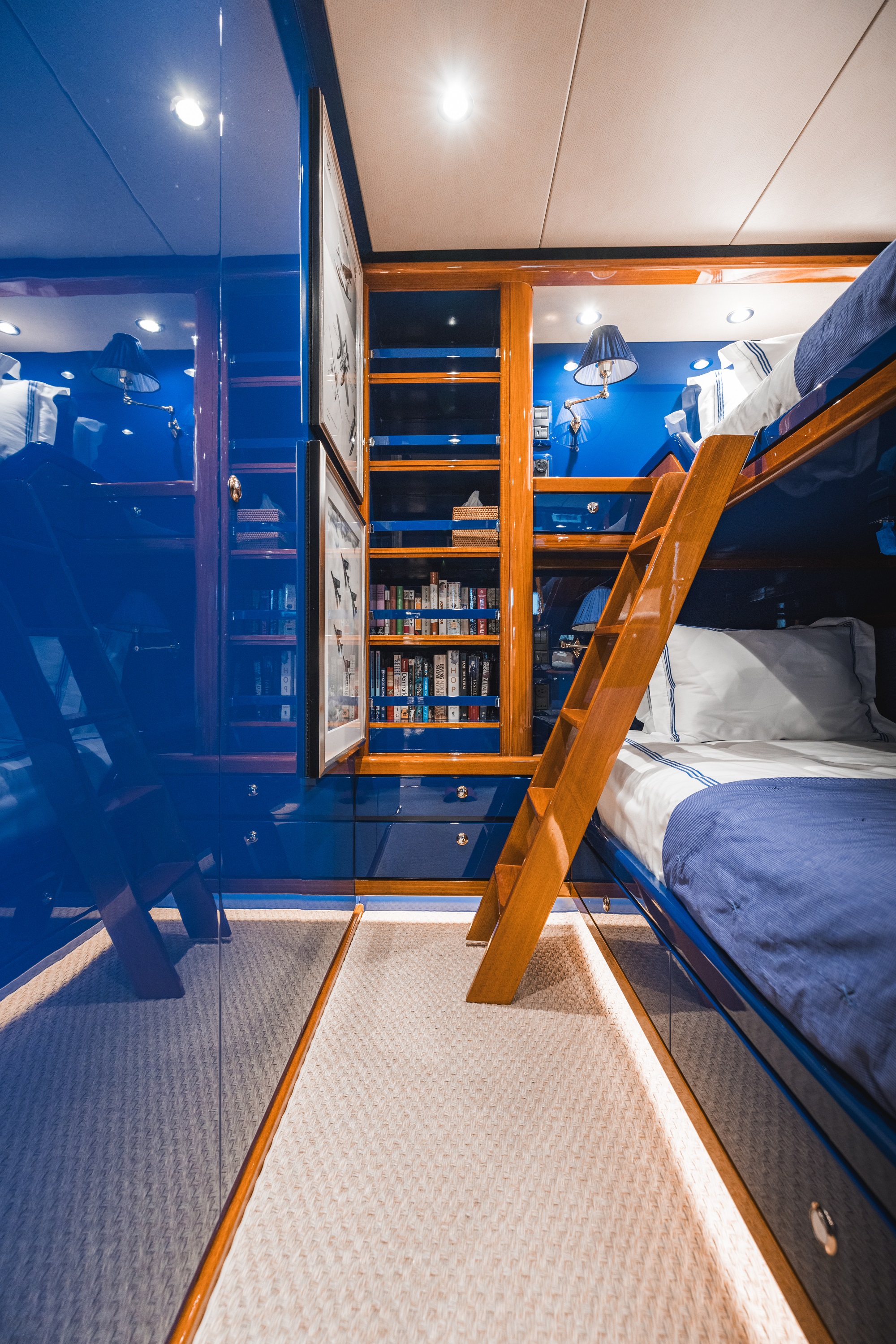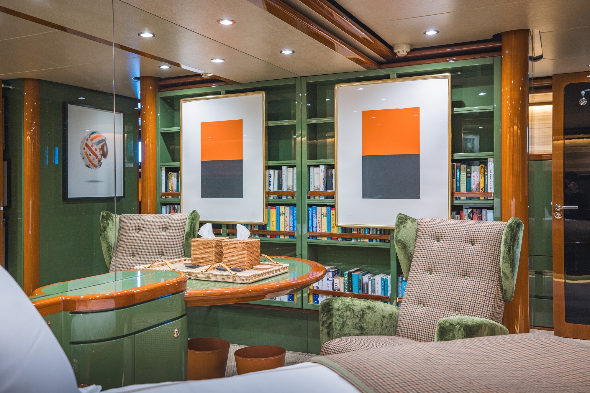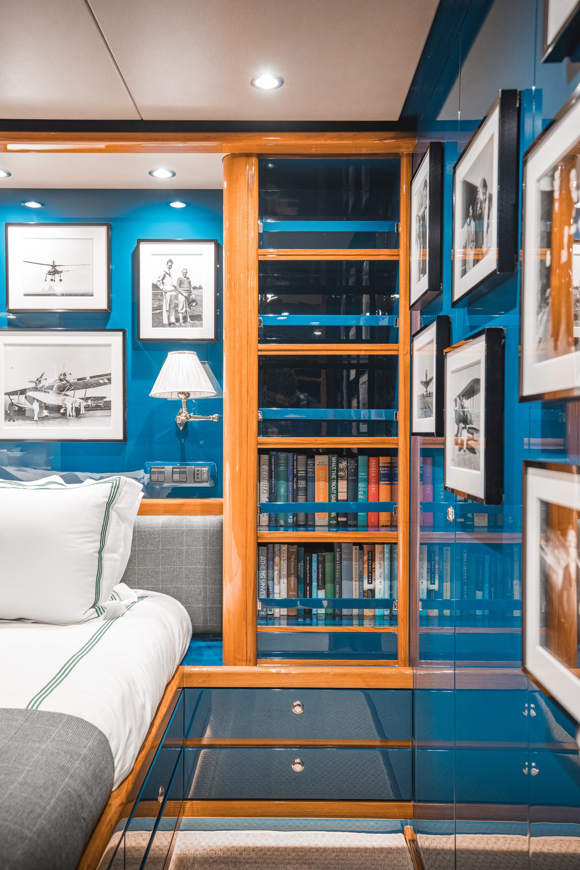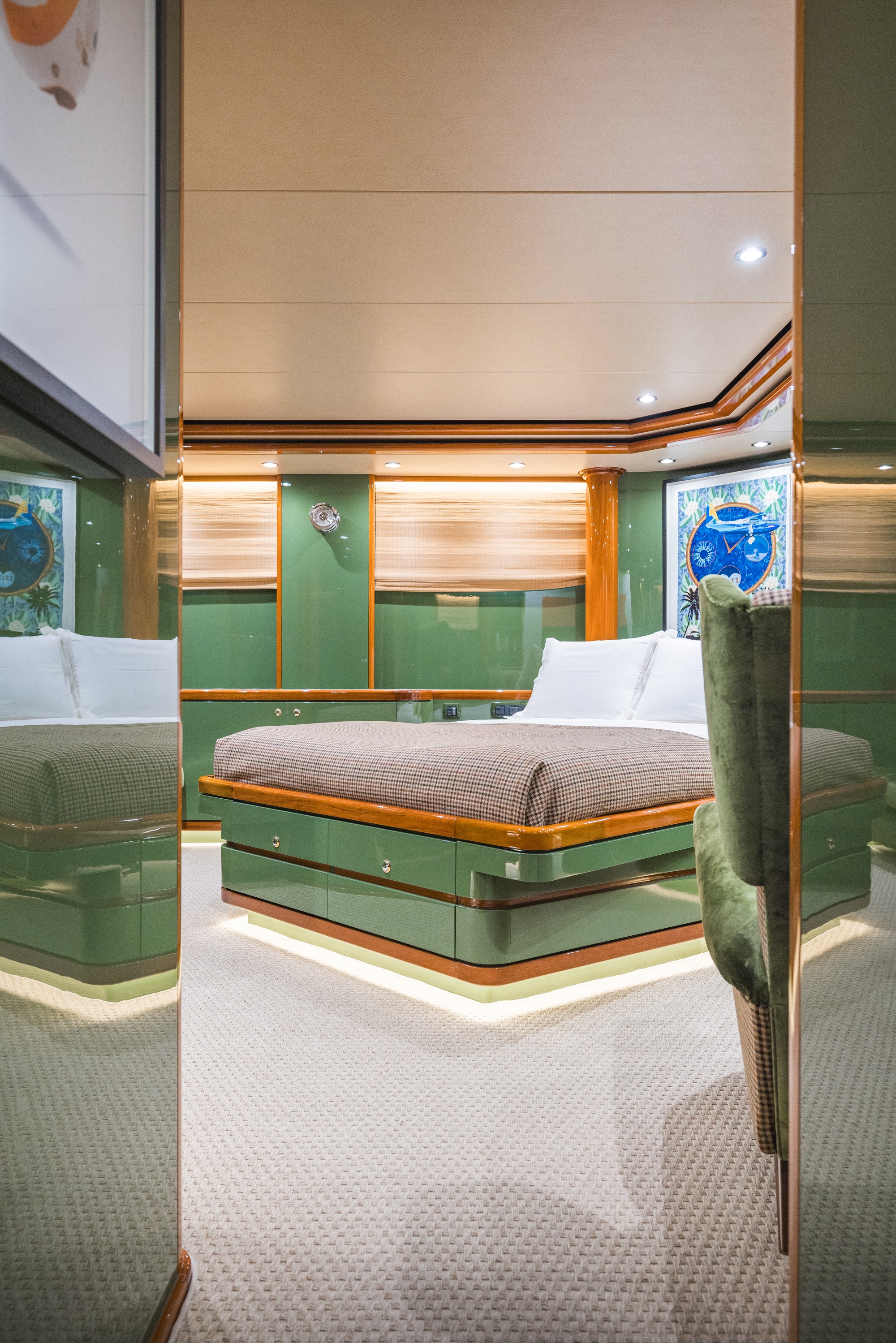 Her latest refit has seen a new interior aesthetic from New York-based designers Redd Kaihoi from New York which brings an impactful high-gloss retro feel to the yacht. Bold blues, greens—and black in the main salon—are paired with original cherry wood panelling, mouldings and trims to create a warm and cosy ambience with a high-end residential feel and custom finishes.