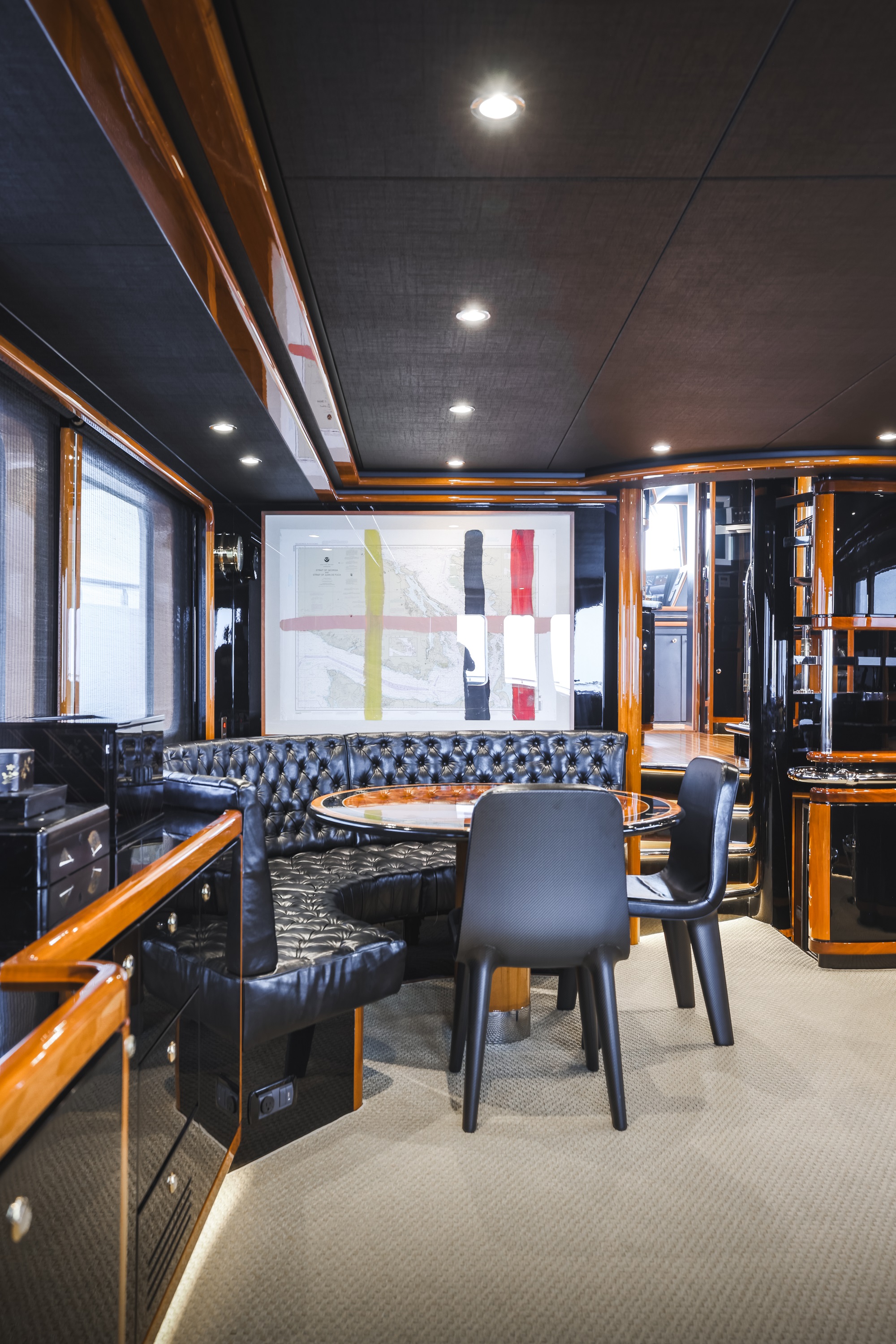 The hull is painted in black with a distinguished British racing green stripe, while the sun awning is adorned with a custom artwork by artist Paul Kremer. The main deck aft is furnished with a sofa, raised table and moveable chairs for alfresco dining and outdoor lounging in the shade. Two stairways lead down to the swim platform, a port-side stairway connects to the flybridge and side walkways lead around to the foredeck, where there are two sofas in front of the raised pilothouse for guests to take in the sweeping views.