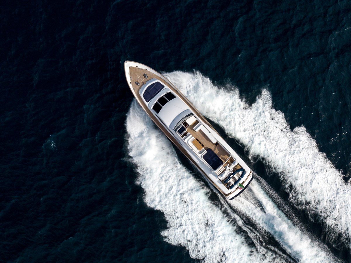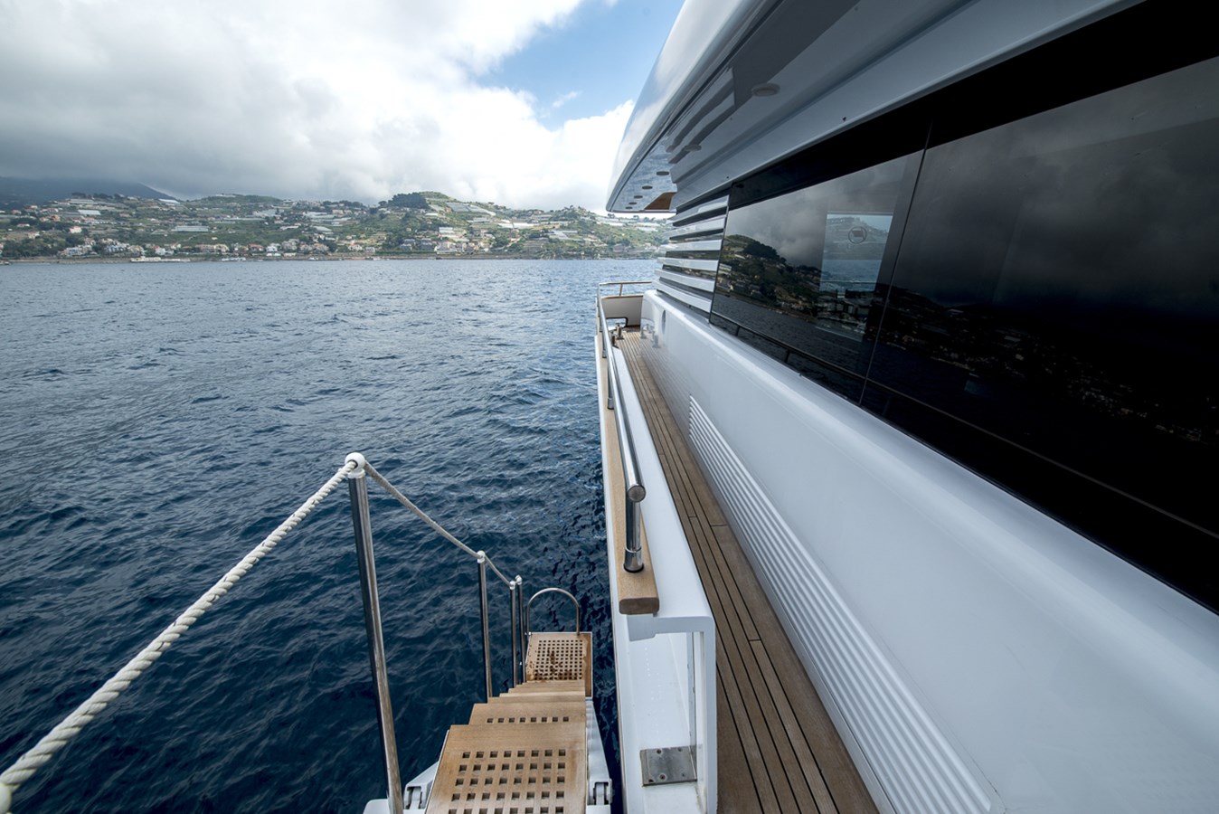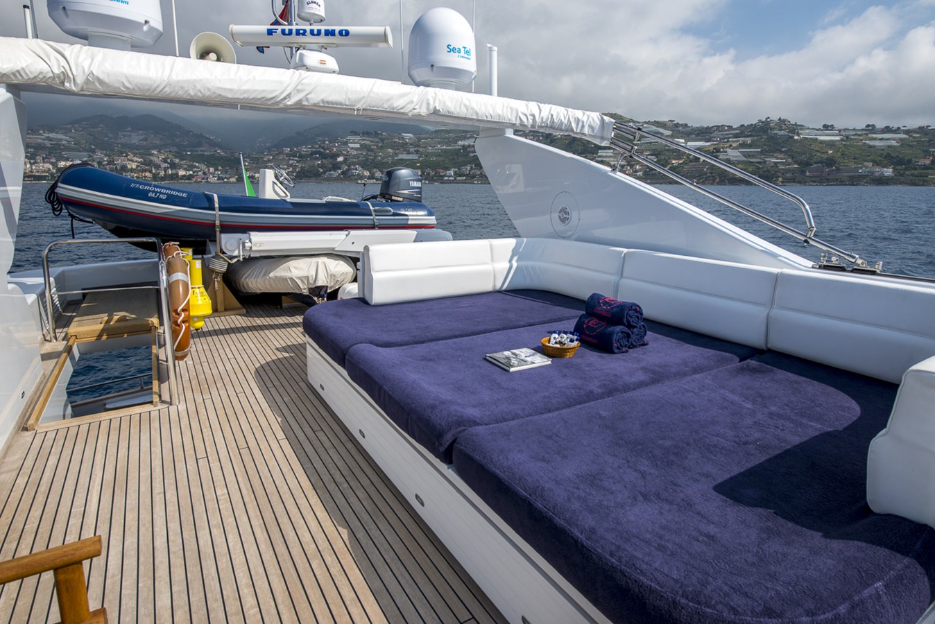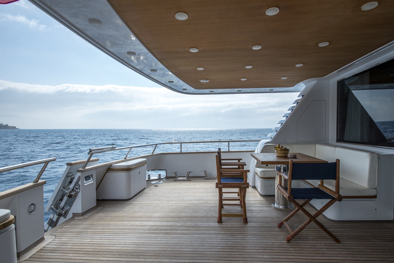 The lower deck swim platform has two ladders for easy access in and out of the sea, and a set of steps lead up to the spacious main deck aft. This environment has been left clear and can be used for outdoor exercise, shaded by the flybridge overhang. In the forward port corner is an L-shaped sofa and a large table can be added to this space for alfresco dining. Side walkways lead around to the foredeck, where sumptuous sunpads cover the area in front of the helm station.