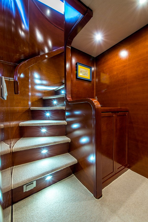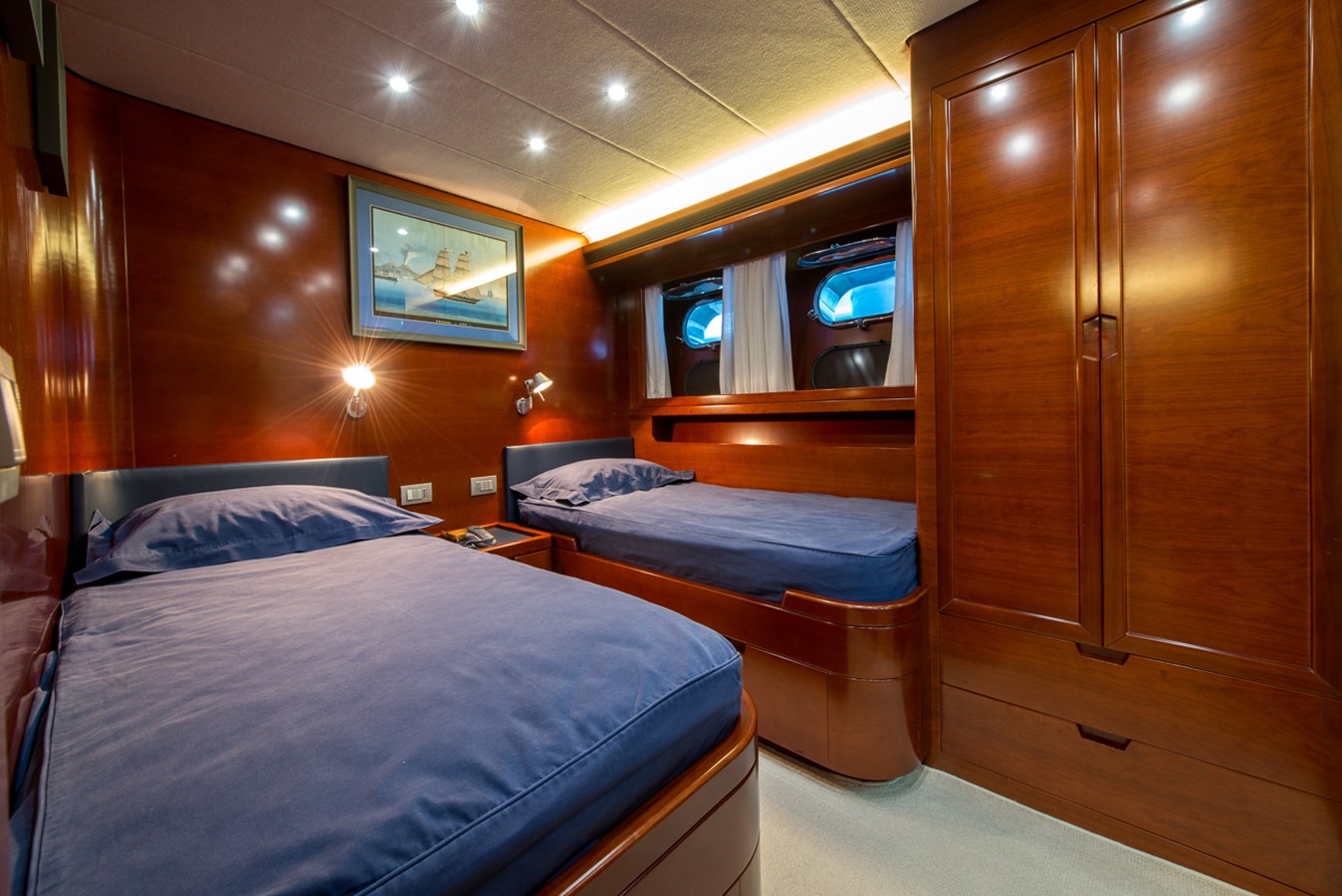 The accommodation sleeps a maximum of 8 guests over 4 en-suite cabins: 1 Master suite, 1 VIP stateroom, 1 twin cabin and 1 bunk cabin. ~ The full-beam Master suite on the lower deck amidships has a king-sized bed, a sofa to port and a desk/vanity to starboard, plenty of wardrobe space and TV entertainment among the systems available. The en-suite bathroom is fitted with a sink, toilet, bidet and a shower. ~ The VIP stateroom is in the bow and has a double bed with sofas on both sides, a widescreen TV on the wall opposite, plenty of storage space and an en-suite bathroom containing a sink, toilet, bidet and shower. ~ The twin cabin and bunk cabin are to port and starboard respectively between the larger cabins. Both have TV entertainment, wardrobe space and an en-suite bathroom with a sink, toilet, bidet and shower. ~ The professional crew of 3 will ensure that everyone on board receives first class service.