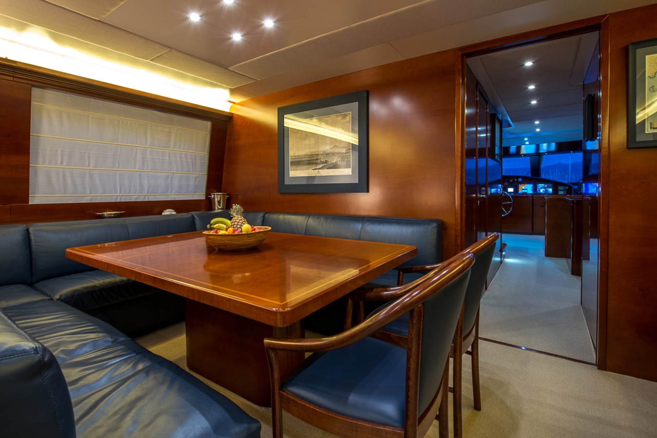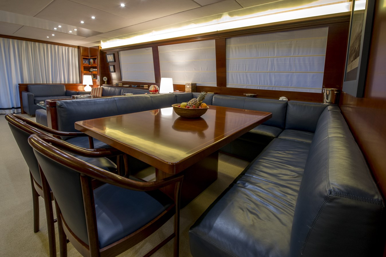 The forward dining table seats all guests in a U-shaped alcove, with additional chairs as required. Immediately behind to port, three sofas and two coffee tables form the lounge, with a widescreen TV on top of the cabinetry opposite.