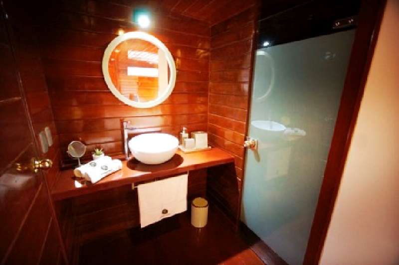 The guest accommodation is spread across the main deck and upper deck, with the former hosting the galley and formal dining area in the stern while the upper deck has a casual lounge with bar for cosy indoor conversation in an air-conditioned environment.