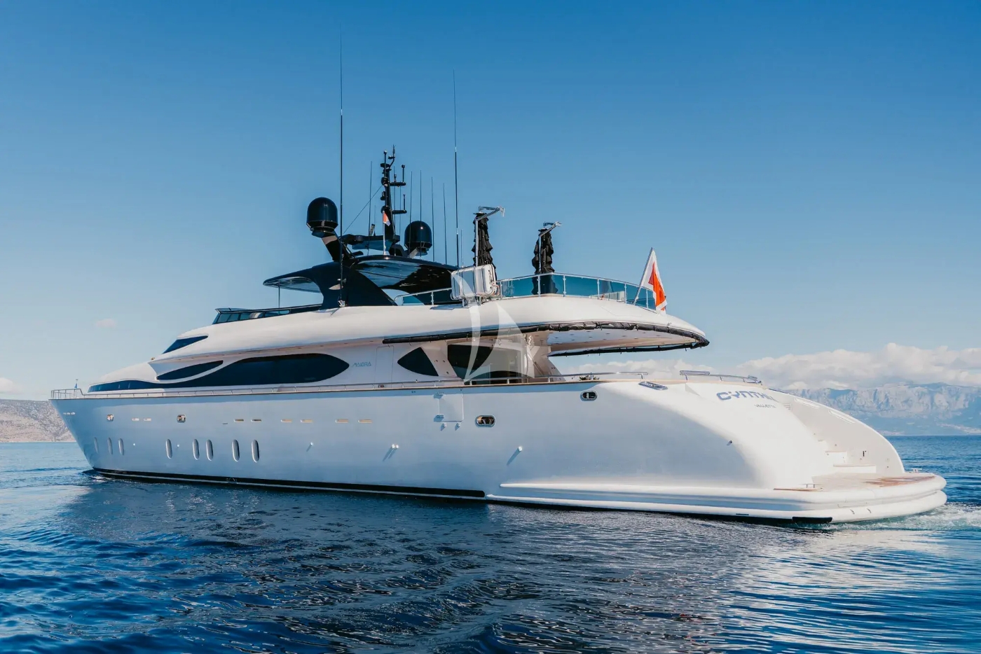 Motor yacht CYNTHIA is a 35.20m (115' 6") Maiora flybridge yacht built in 2010 and refitted in 2024. Her spacious decks and warm, welcoming interior create a truly luxurious charter vessel for up to eight guests who will be accommodated in four suites. Six crew members are on board offering professional service throughout the charter.