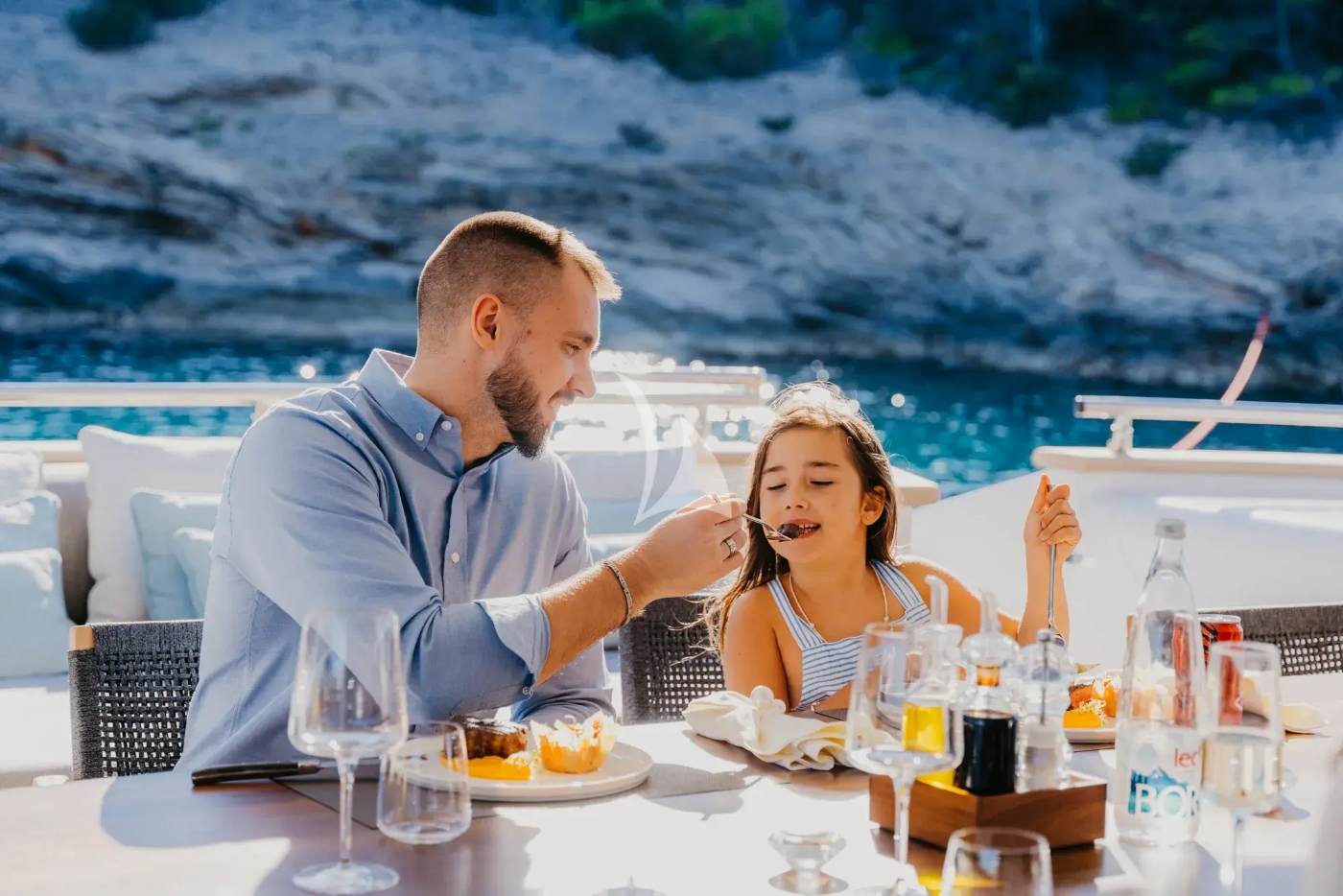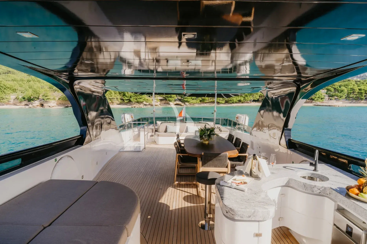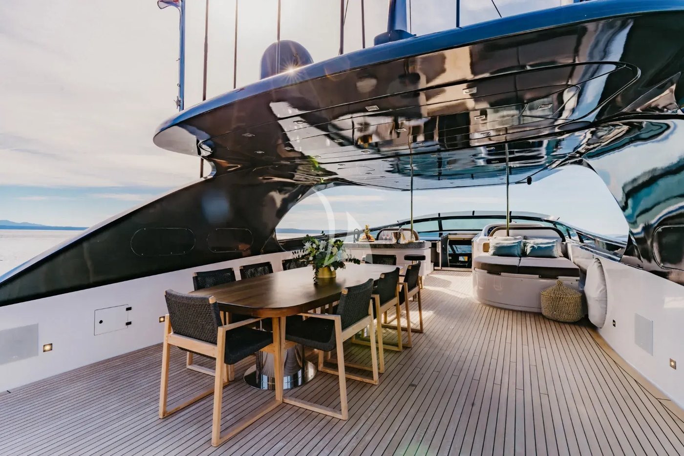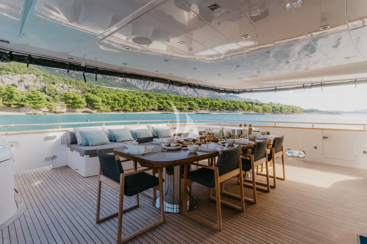 The al fresco lifestyle is catered for across the yacht with a choice of dining settings, plenty of space to sunbathe and easy access to the water.