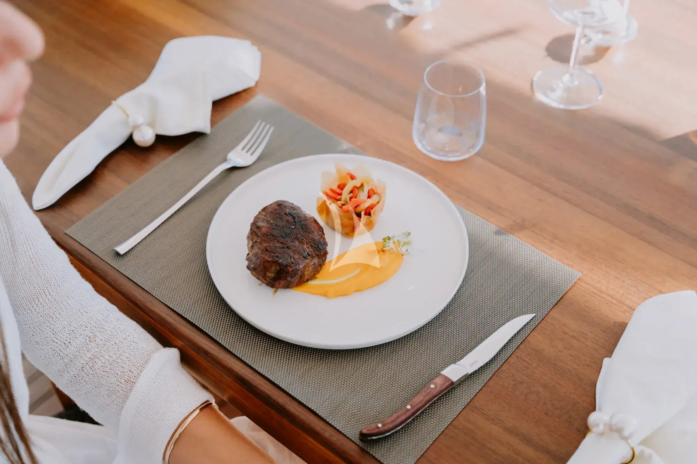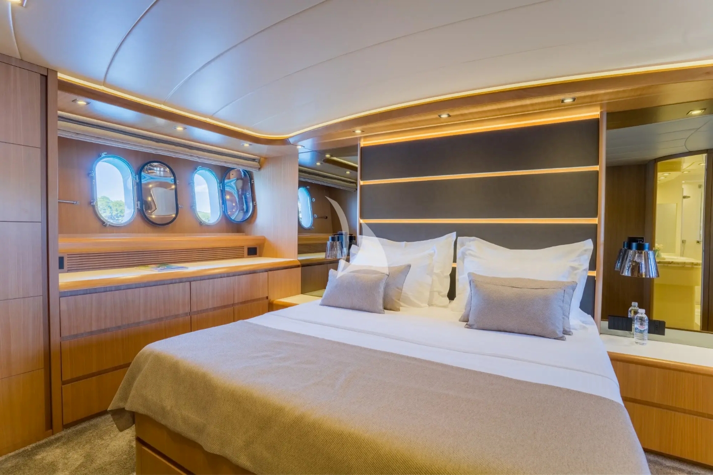 Warm wood panelling and neutral furnishings characterise the interior with the main salon boasting a very large modular sofa, pop-up TV and dining setting with glass table. Panoramic windows allow the light to flood in, and the lighting creates a relaxing atmosphere at night.