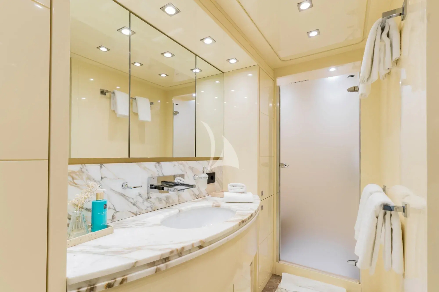 The guest accommodation is on the lower deck and configured as four double suites: two kings, one queen and one double, each with deluxe ensuite bathrooms with marble counter tops and separate shower cubicles.