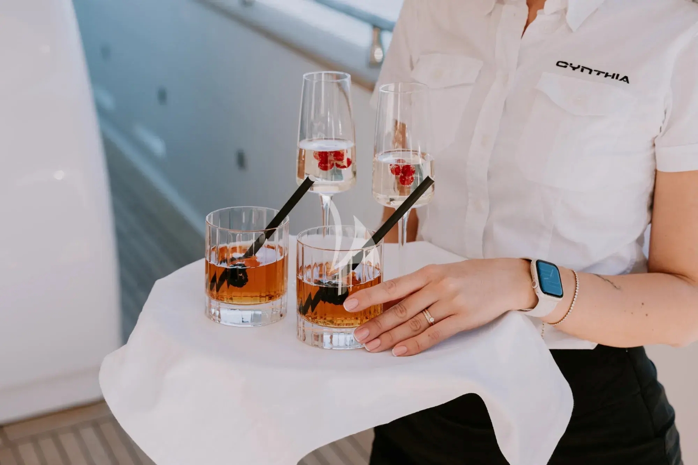 NOTABLE FEATURES OF CYNTHIA: ~Choice of al fresco dining ~Warm and welcoming interior ~Superior tender and water toys ~At anchor and underway stabilisers ~Gym equipment ~Air conditioning ~WiFi