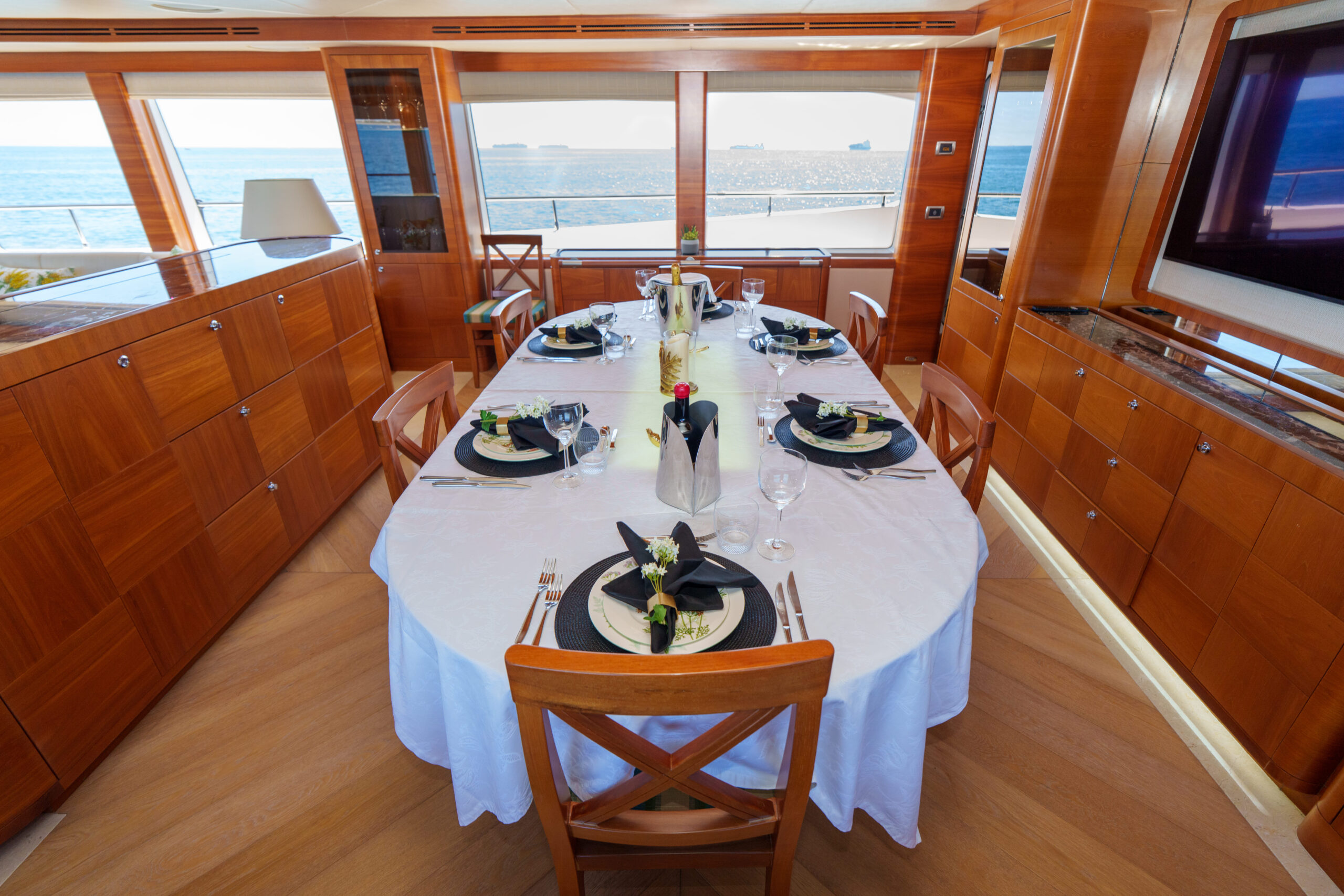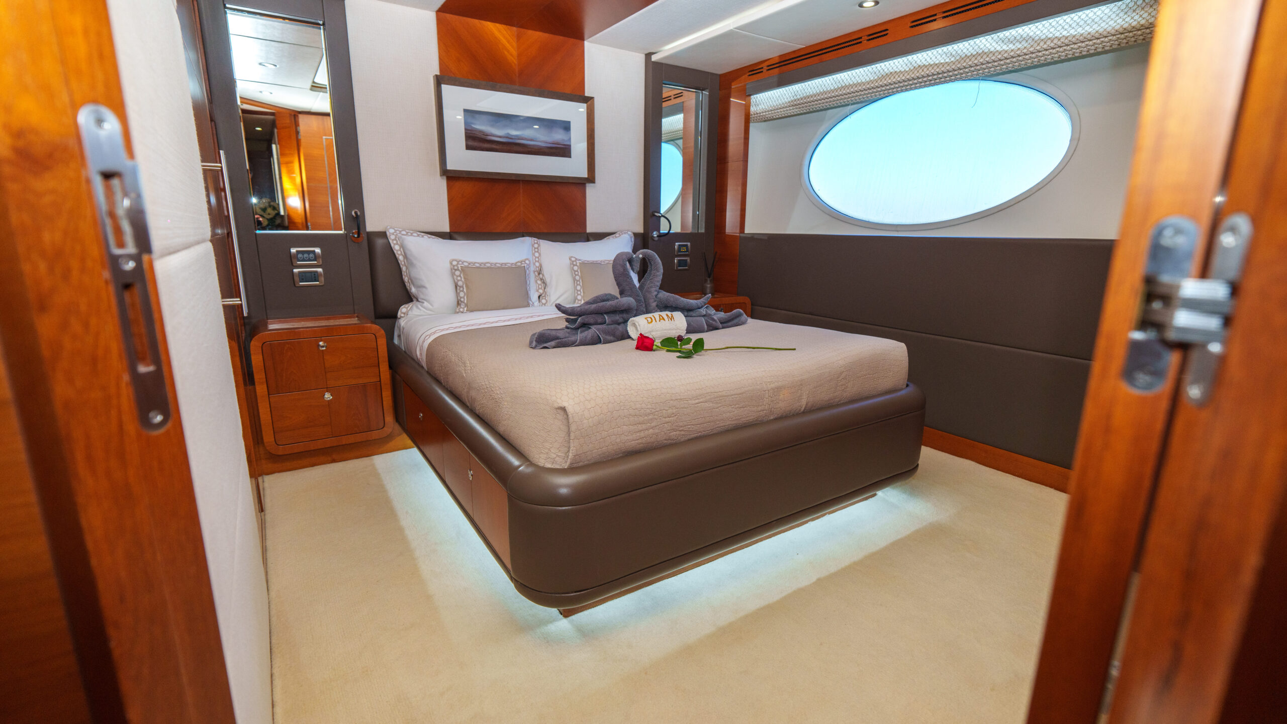 DIAM comfortably hosts up to nine guests in five well configured cabins: ~ Master suite: full beam with generous volume and ensuite bathroom ~ 2 Double cabins: each with private ensuite facilities ~ 2 Twin cabins: each with ensuite bathrooms, ideal for friends or family The yacht also accommodates six crew in separate quarters, ensuring discreet and attentive service.