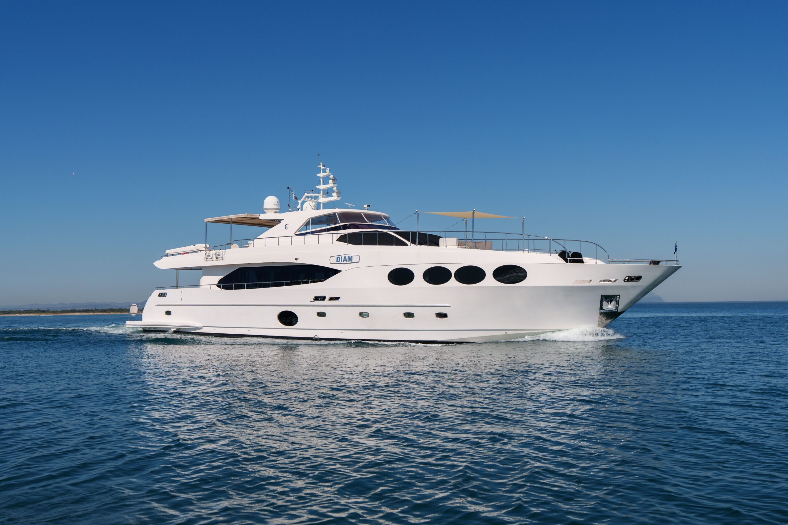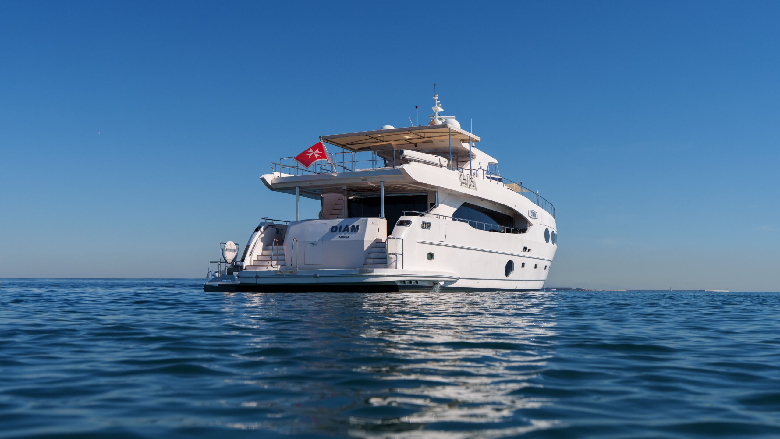 Built by Gulf Craft in the United Arab Emirates and launched in 2013, DIAM is a striking 32.7 metre Majesty 105 motor yacht, completely styled in house by Gulf Craft. Elegantly finished with expansive glazed spaces and graceful lines, she welcomes up to nine charter guests across five beautifully outfitted cabins, with a dedicated crew of six ensuring impeccable service. Combining cruising comfort with playful sophistication—including a sun deck jacuzzi and generous watersports collection—DIAM offers a refined yet joyous Mediterranean charter experience.