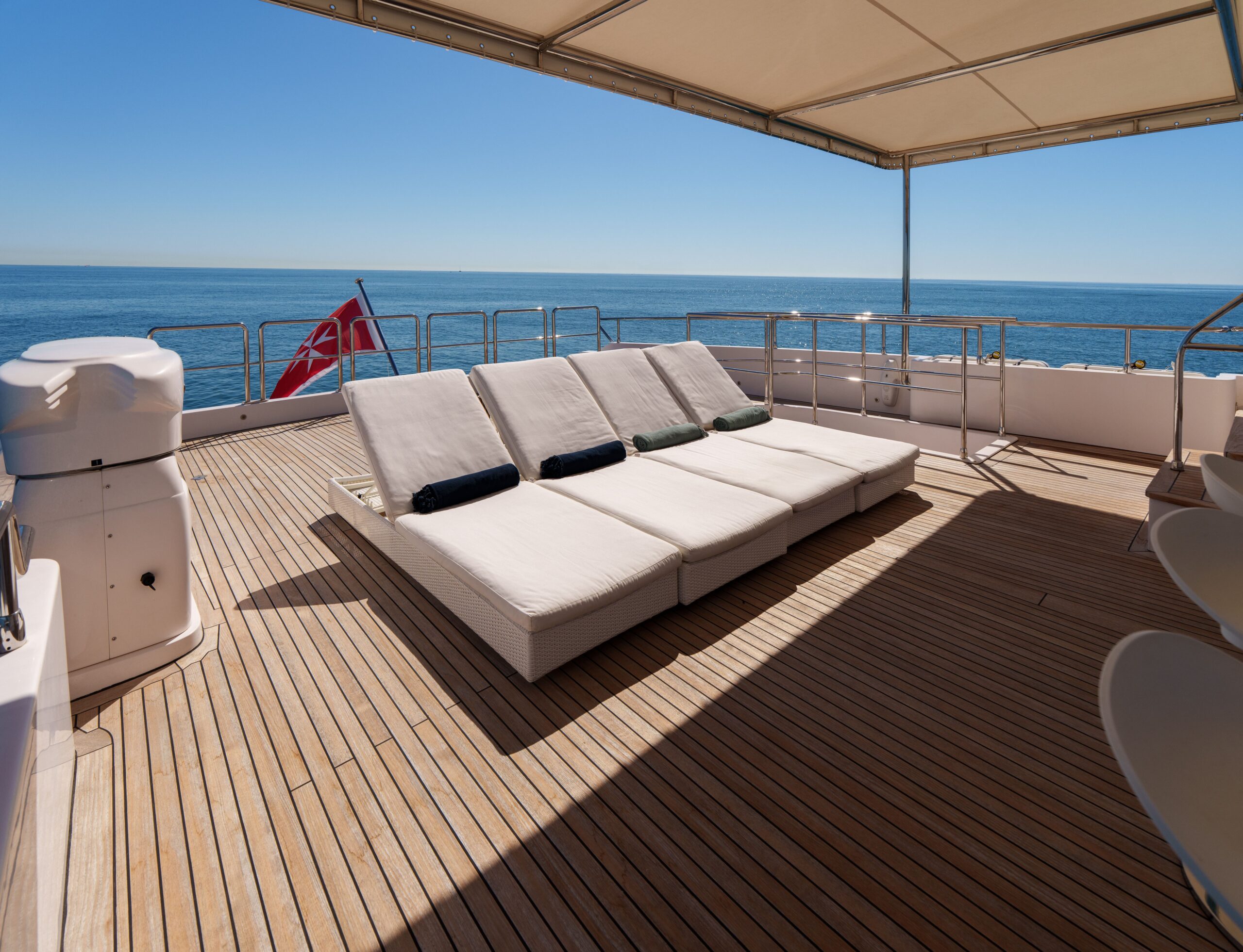 DIAM’s exterior layout offers multiple enticing spaces for relaxation and conviviality. A sun deck Jacuzzi is nestled amidships, encircled by cushioned sunpads for serene soaking or sunset cocktails. Forward on the same level, an alfresco lounge area benefits from sweeping sea views, while a shaded dining zone invites leisurely meals under the sun deck hardtop. Below, the aft deck integrates a hydraulic swim platform that lowers to water level—a simple transition from yacht to sea toys or tender. The foredeck delivers a further quiet sunbathing zone, perfect for morning lounging under gentle breezes.