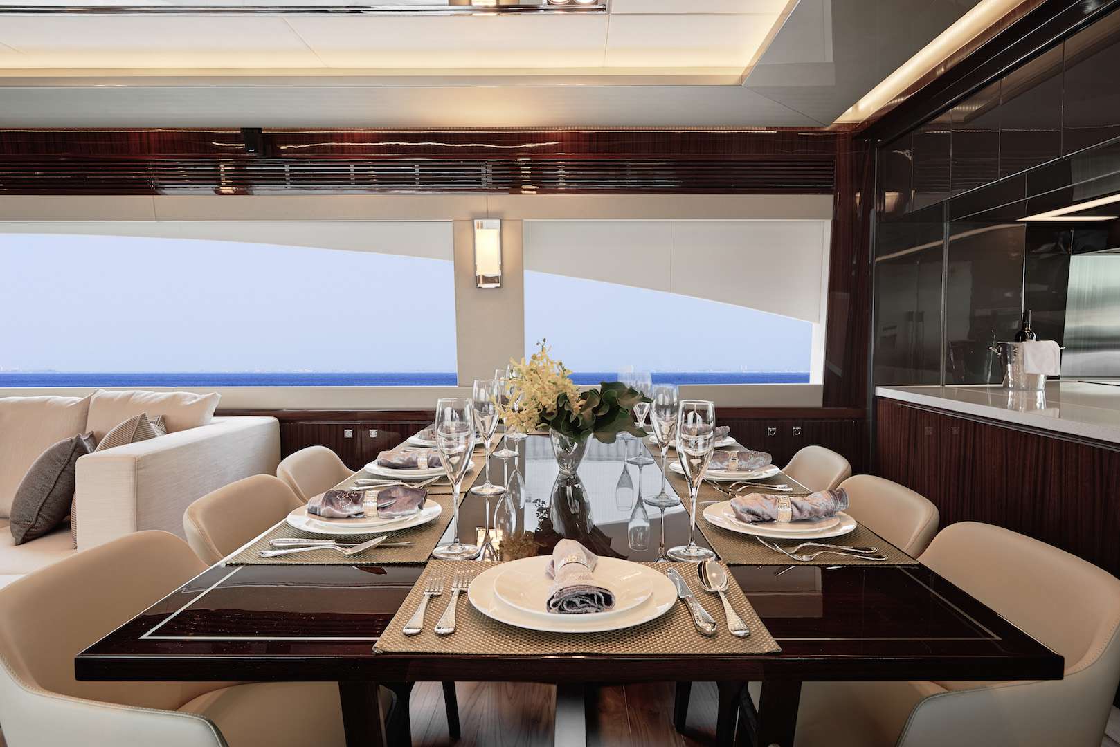 The flybridge has a sofa and coffee table, while the exterior bow area offers large sun pads for sunbathing. Aft on the flybridge there is further seating and table for guests to dine alfresco.