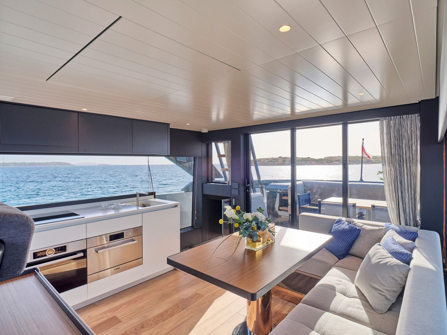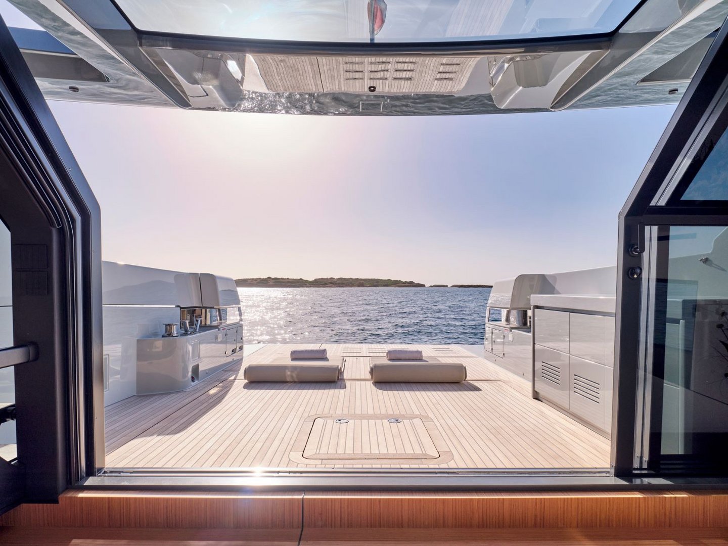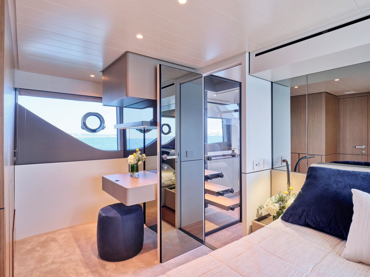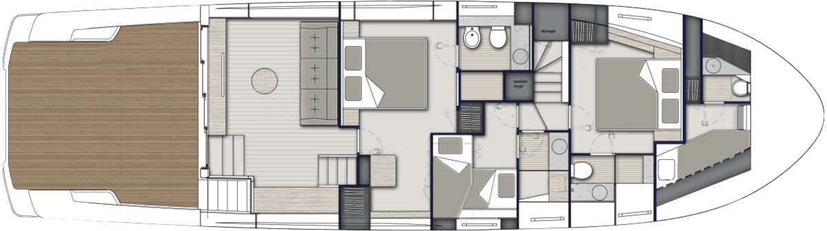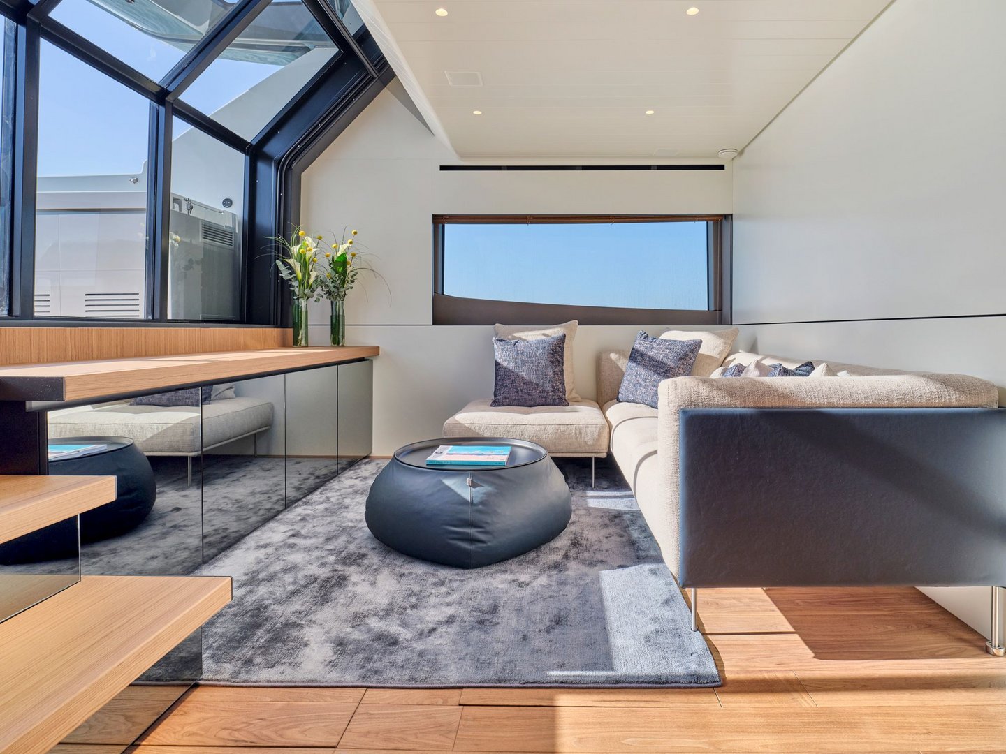 The layout provides guests with salon space on two levels including a sunroom on the lower deck leading out onto the beach area and a main salon on the upper deck with dining, integrated galley and helm controls. The interior décor is cool and bright blending light wood finishes with contemporary neutral soft furnishings.