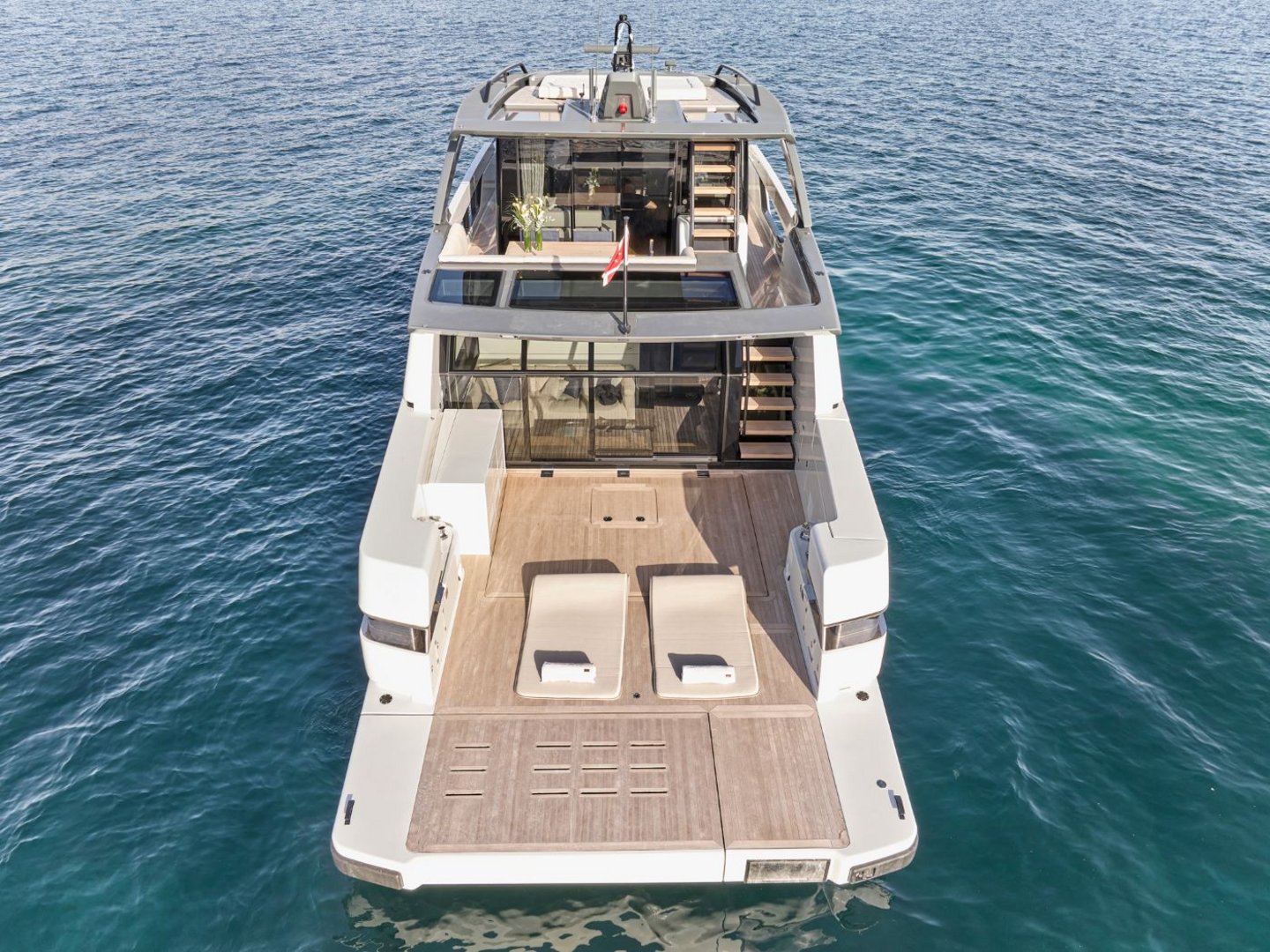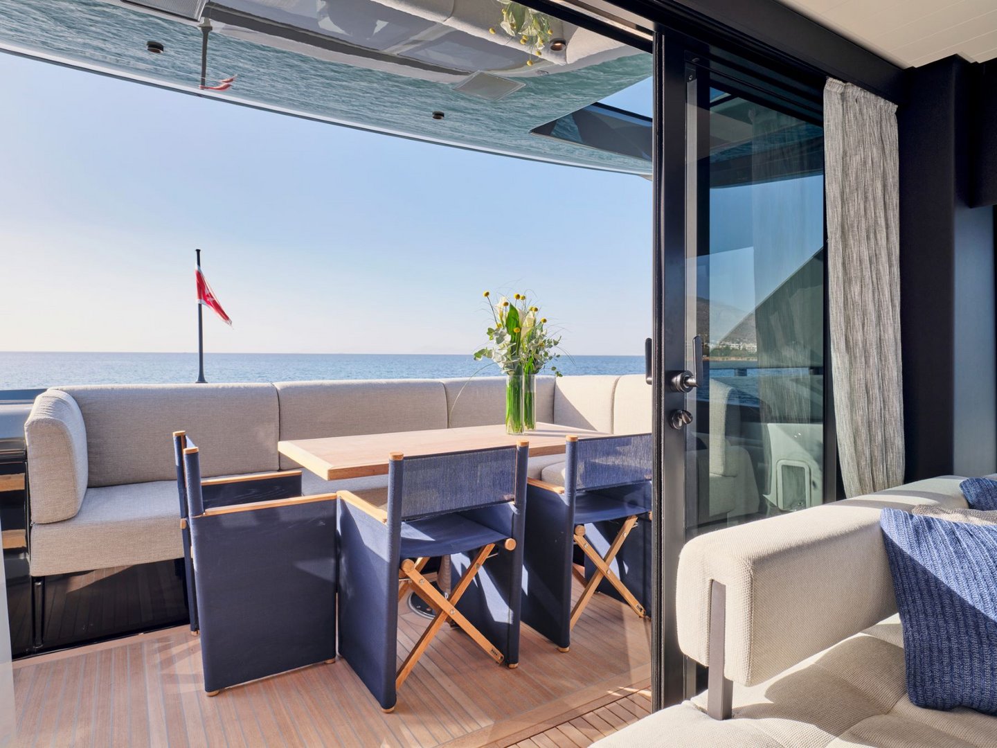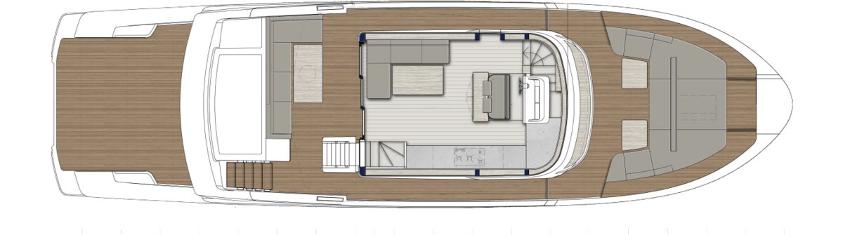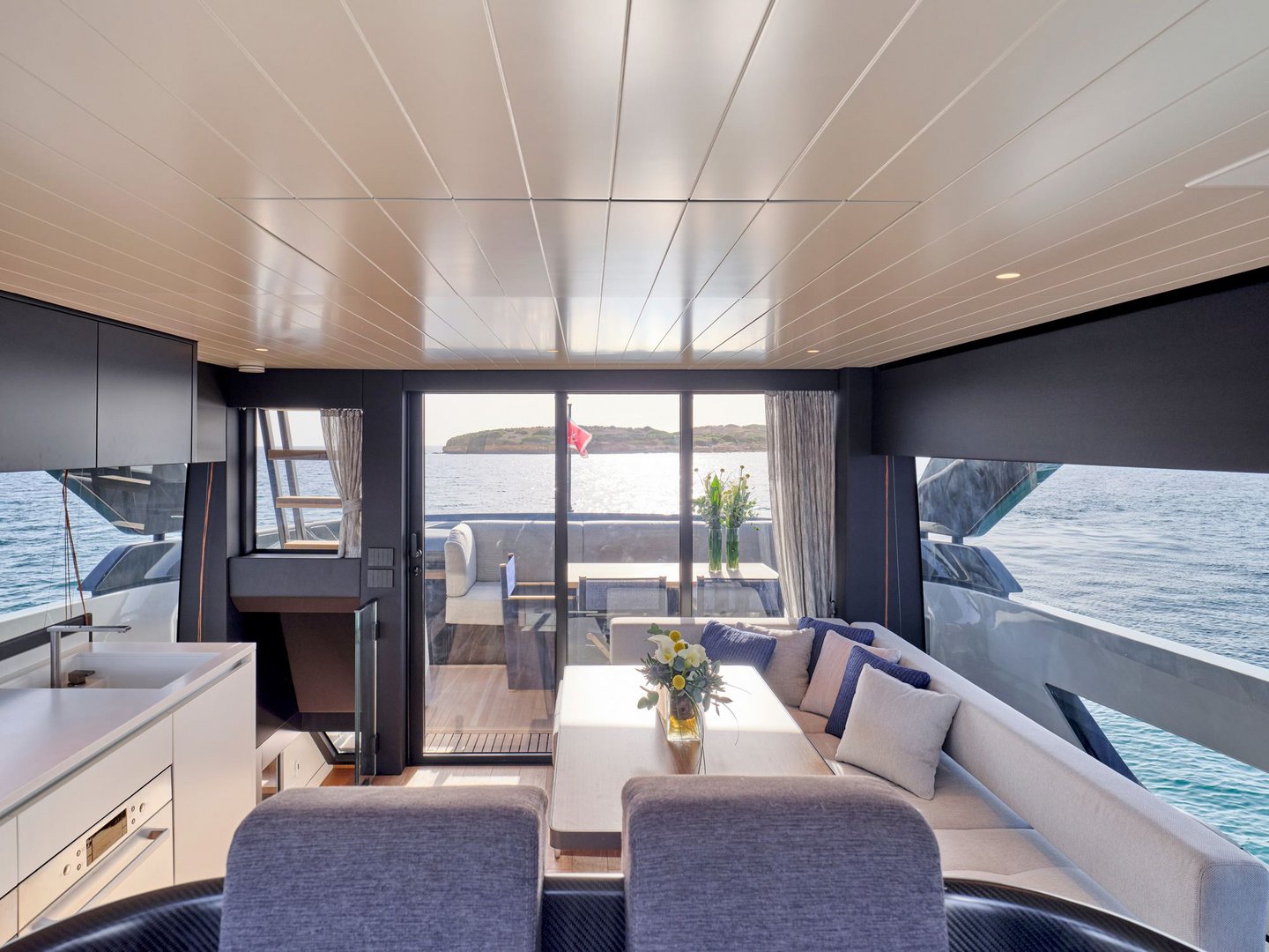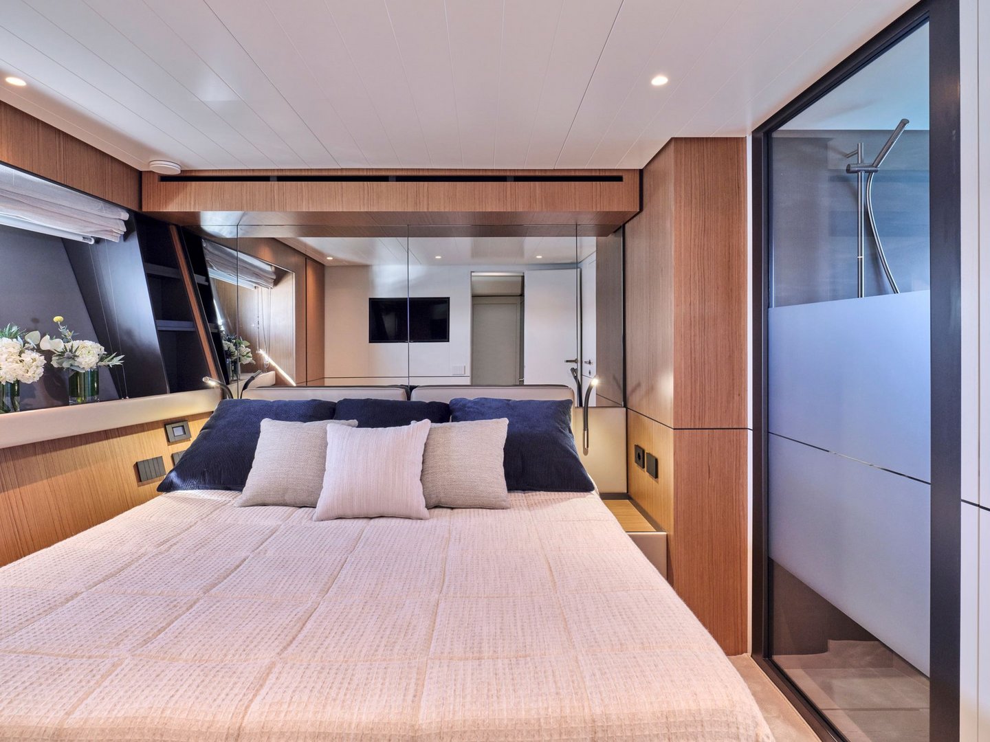 The layout provides guests with salon space on two levels including a sunroom on the lower deck leading out onto the beach area and a main salon on the upper deck with dining, integrated galley and helm controls. The interior décor is cool and bright blending light wood finishes with contemporary neutral soft furnishings.