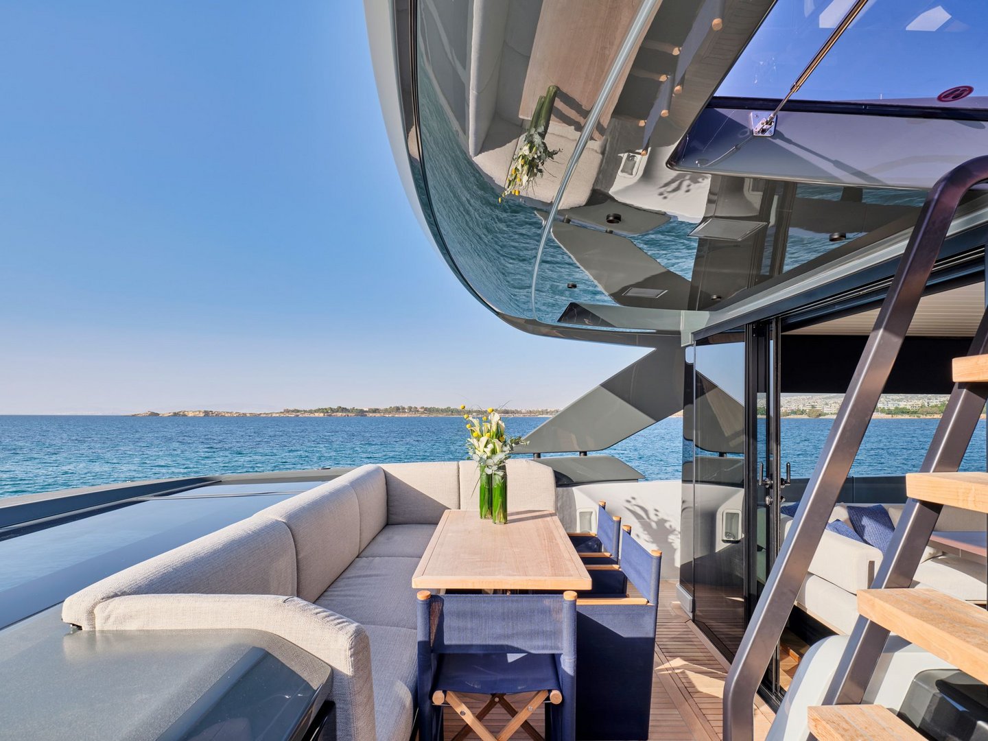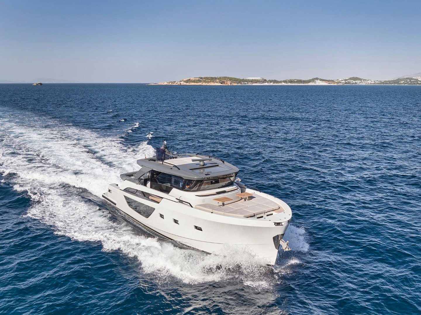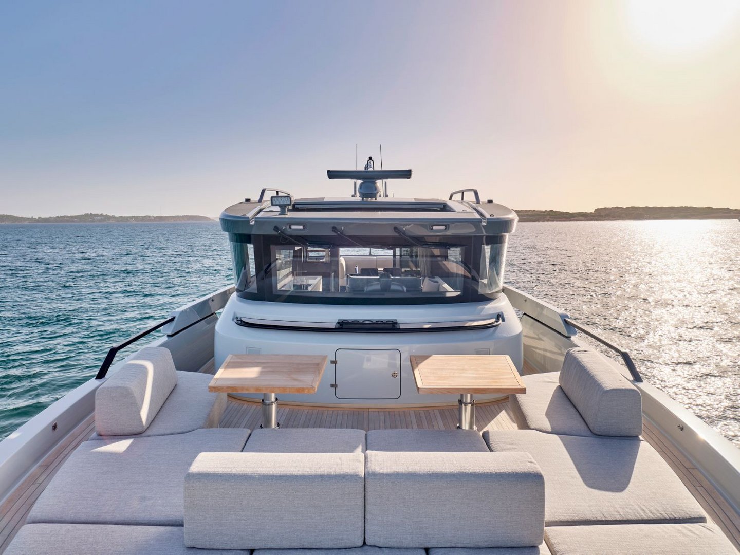 Her explorer style profile offers four exterior deck areas – a spacious arrangement usually only seen on larger yachts. The extended aft deck – which characterises explorer yachts – creates a generous beach area at the water’s edge. The foredeck is extremely sociable providing dining, day beds and sun pads for guests to relax on all day. A soft bimini shade can be erected over the space to provide shelter in the heat of the day. The upper deck aft offers a lovely al fresco dining setting, while the pilot house roof is fitted with a row of inbuilt sun pads with amazing views.