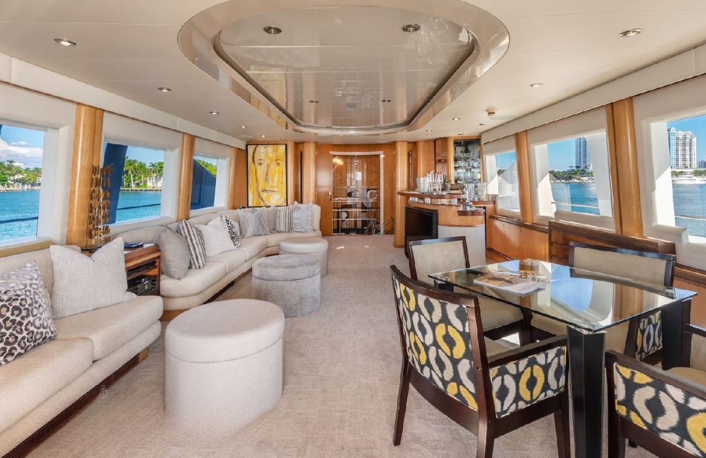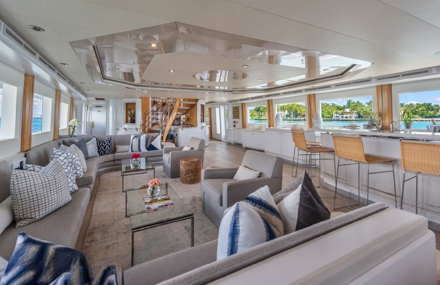 On the main deck the formal dining area is forward and receives an abundance of natural light along with excellent views through the forward windows. The main foyer amidships leads through to the main salon aft, where a wet bar is placed along the starboard wall and a pair of corner sofas make a C-shaped sitting area on the port side, accompanied by two coffee tables and a pair of armchairs. A circular dining table and eight chairs are placed ear the glass doors out onto the main deck aft.