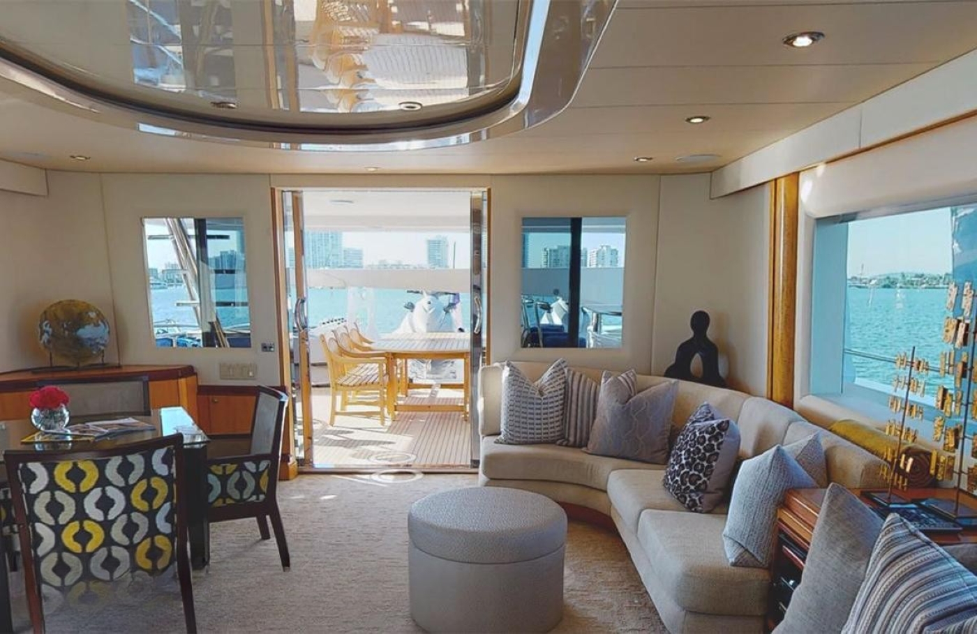 On the bridge deck, the forward helm station has a curving sofa behind the Pilot and co-Pilot seats for guests to watch on as the Captain cruises into port. The skylounge behind is a second sitting room just as desirable as the main salon, and seating is placed along the port wall with a widescreen TV integrated into the bar opposite. A drinks and games table for four is situated next to the doors out onto the bridge deck aft.