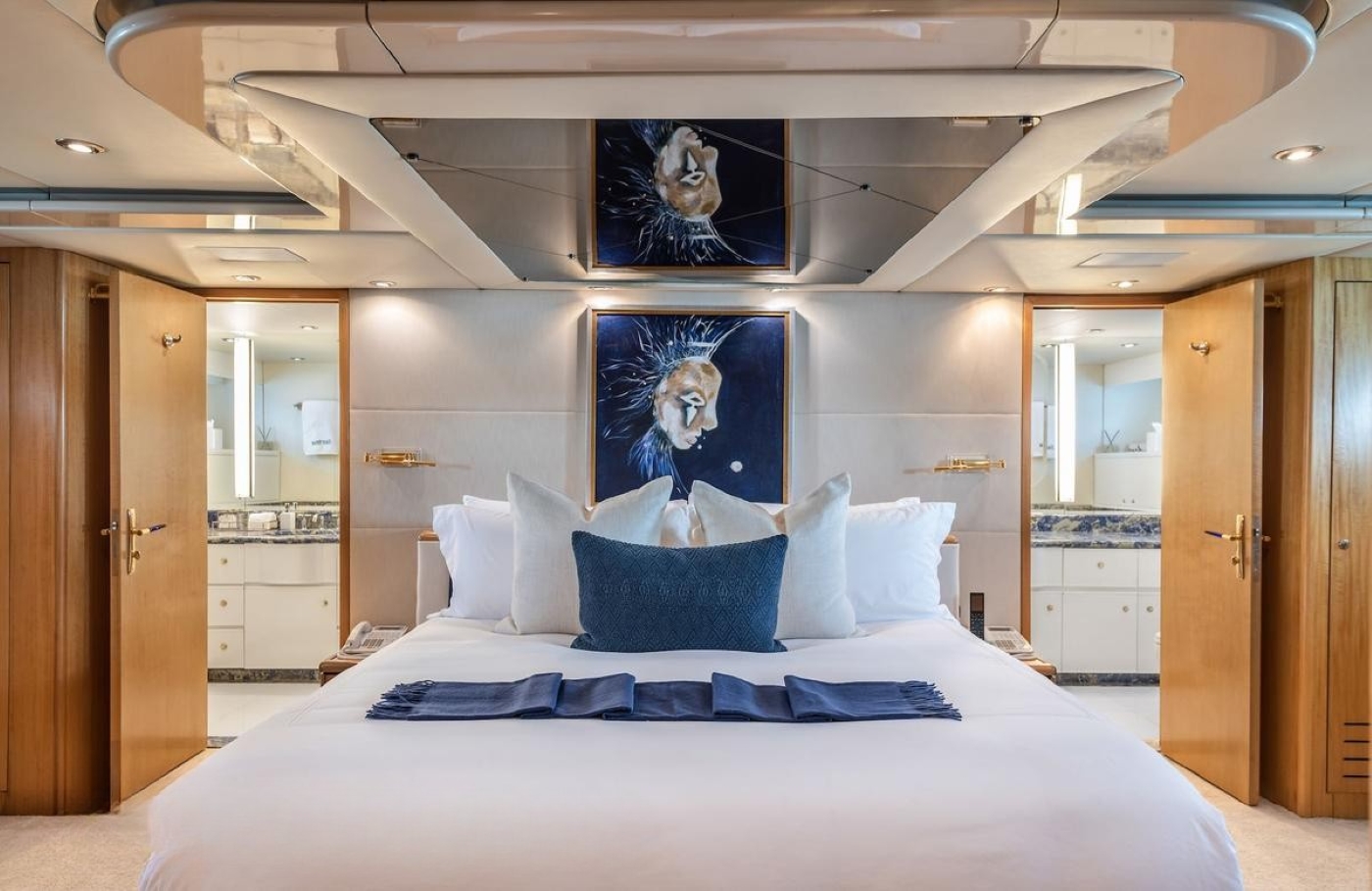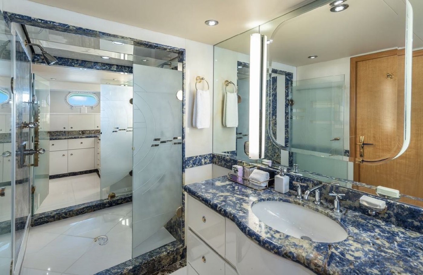 While up to 12 guests can remain on board while cruising, the accommodation sleeps up to 10 guests in 5 en-suite cabins: 1 Master suite, 2 double cabins and 2 twin cabins. ~ The Master suite is placed amidships on the lower deck to take advantage of the full beam, and comes with a king-sized bed with a widescreen TV on the opposite wall, a desk/vanity on both sides of the room, ample storage and his-and-hers en-suite bathrooms both with a toilet and sink, and a large shared central shower. ~ The double cabins are aft of amidships and both have queen-sized beds with a widescreen TV mounted on the wall opposite, ample storage and an en-suite bathroom providing a sink, toilet and shower. ~ The twin cabins are placed between the double cabins and the Master suite to port and starboard respectively. Both have two single beds with a widescreen TV opposite, plenty of storage and an en-suite bathroom with a sink, toilet and shower. ~ The professional crew of 8 is accommodated in the bow and has a separate entrance to ensure guest privacy.