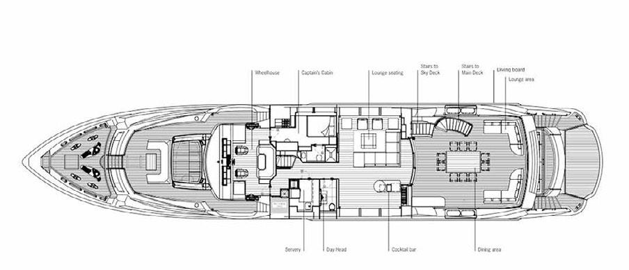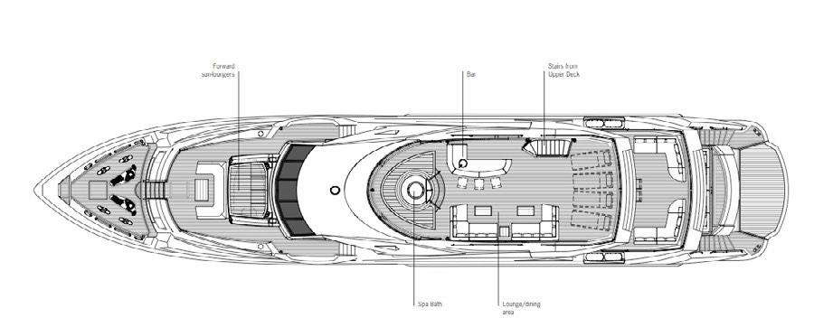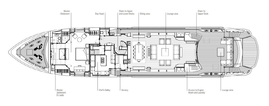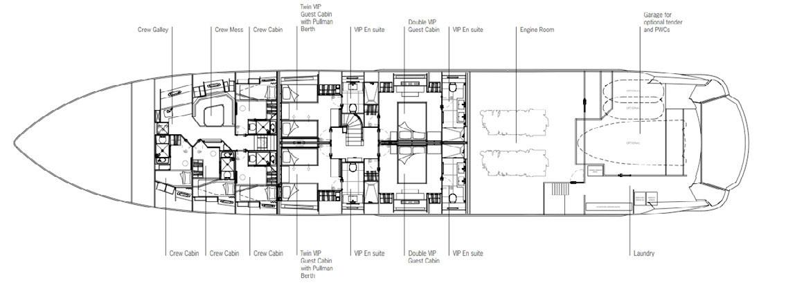The lower deck places the crew accommodation and mess forward, the guest accommodation amidships and the engine room behind with the tender garage in the stern.