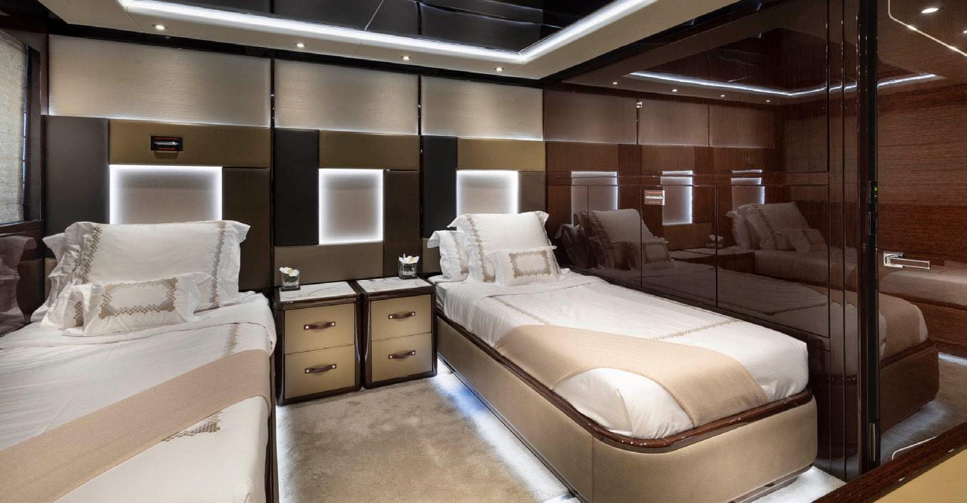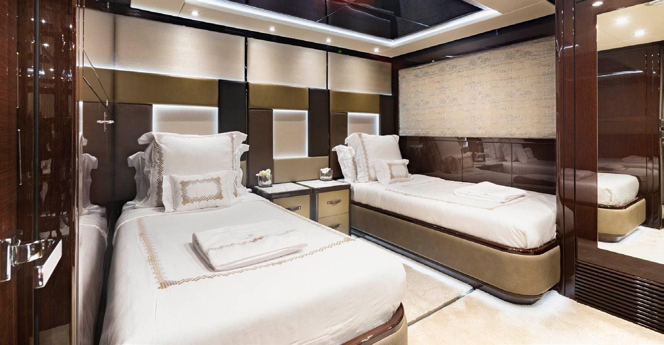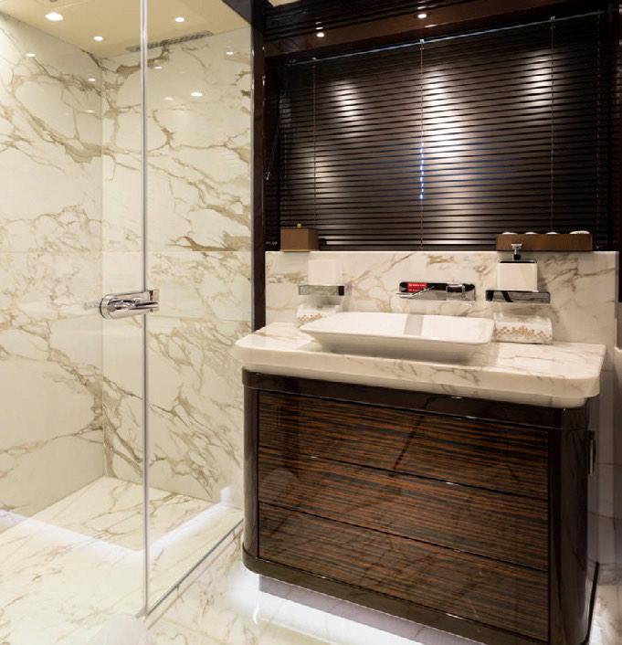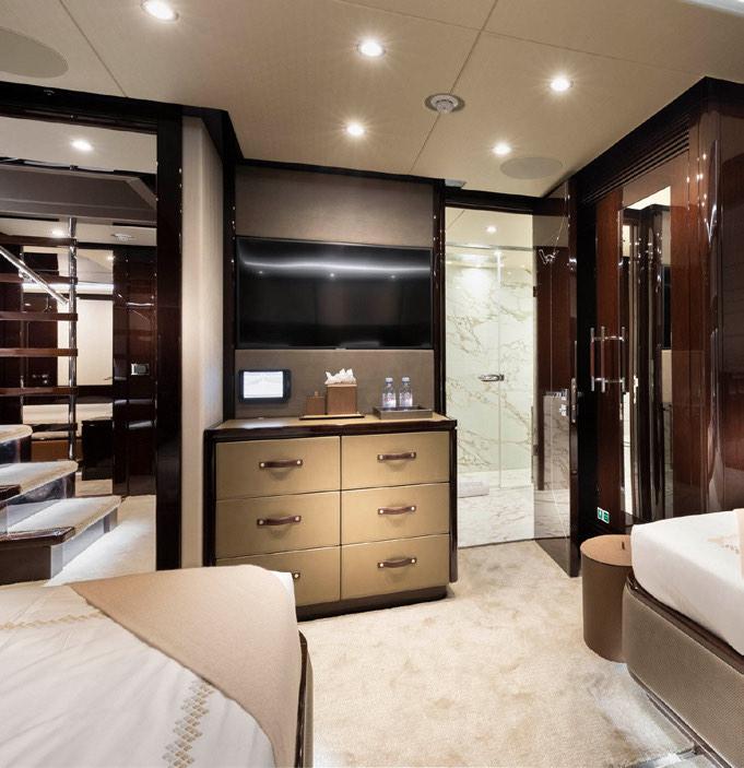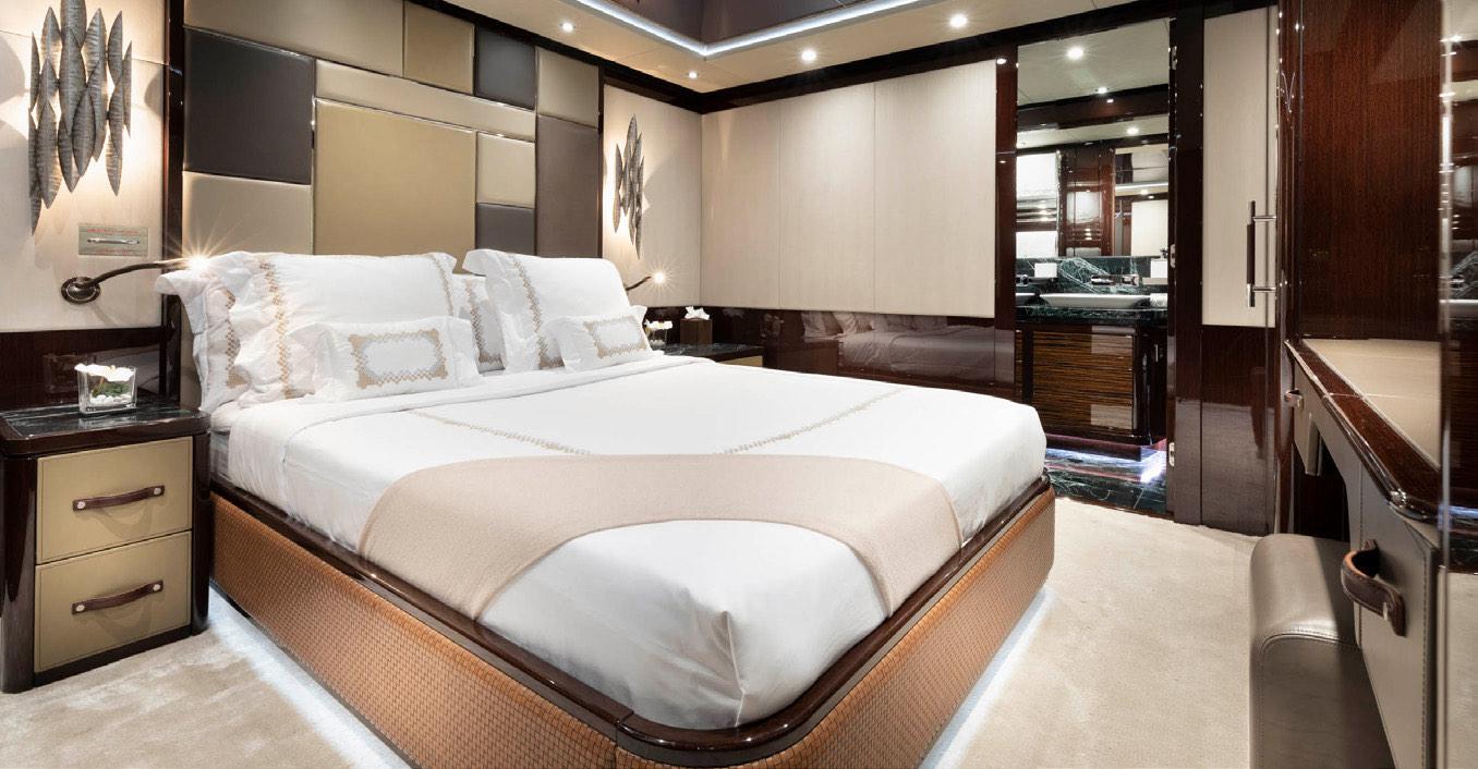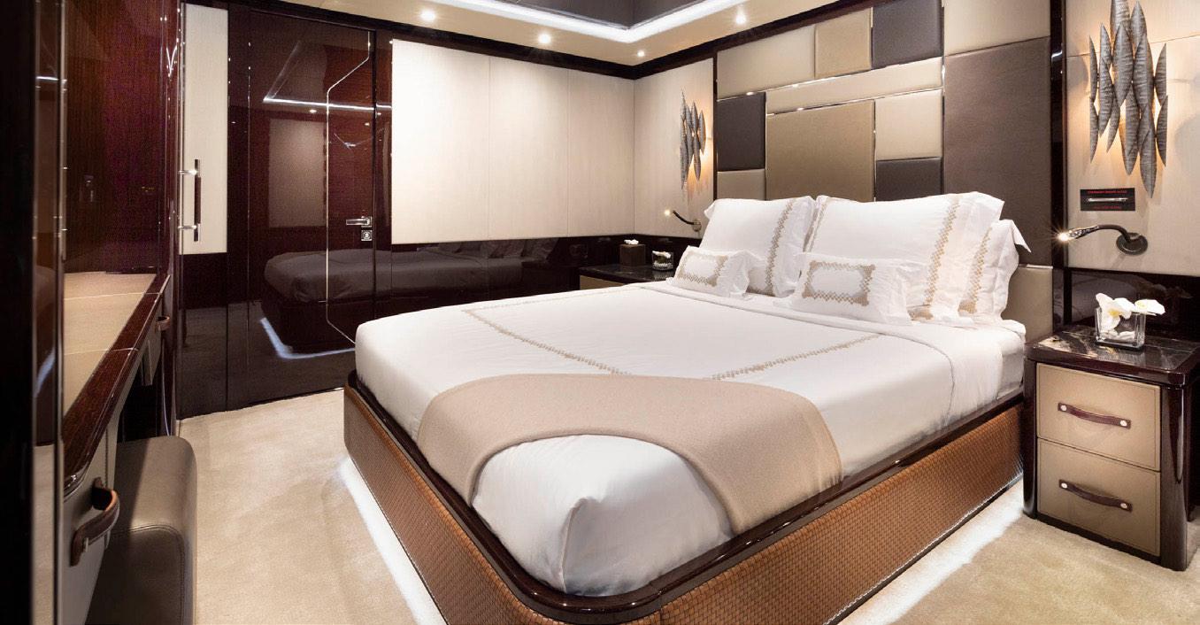 The accommodation sleeps a maximum of 10-12 guests over 5 en-suite cabins: 1 Master suite, 2 double cabins convertible to twins, each with a Pullman berth, and 2 twin cabins. ~ The Master suite is placed on the main deck forward and provides its occupants with a king-sized bed, opposite of which is a wall-mounted widescreen TV. Spacious windows to port and starboard provide plenty of natural light, and there is a desk and lounge area beneath the respective sides. There are also two large wardrobes and an en-suite bathroom fitted with an enclosed toilet bidet and sink, a shower opposite and two sinks and a bathtub in the centre. ~ The lower deck hosts the two convertible cabins forward, and each has a Pullman berth suitable for a child. Each room has a widescreen TV, desk, wardrobe and en-suite bathroom with a toilet, sink and shower. Two further twin cabins are placed behind and have the same amenities as the other cabins. ~ The crew of 8 will ensure that every guest receives first class service throughout their time on board.