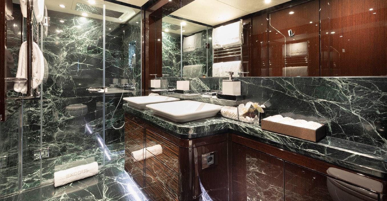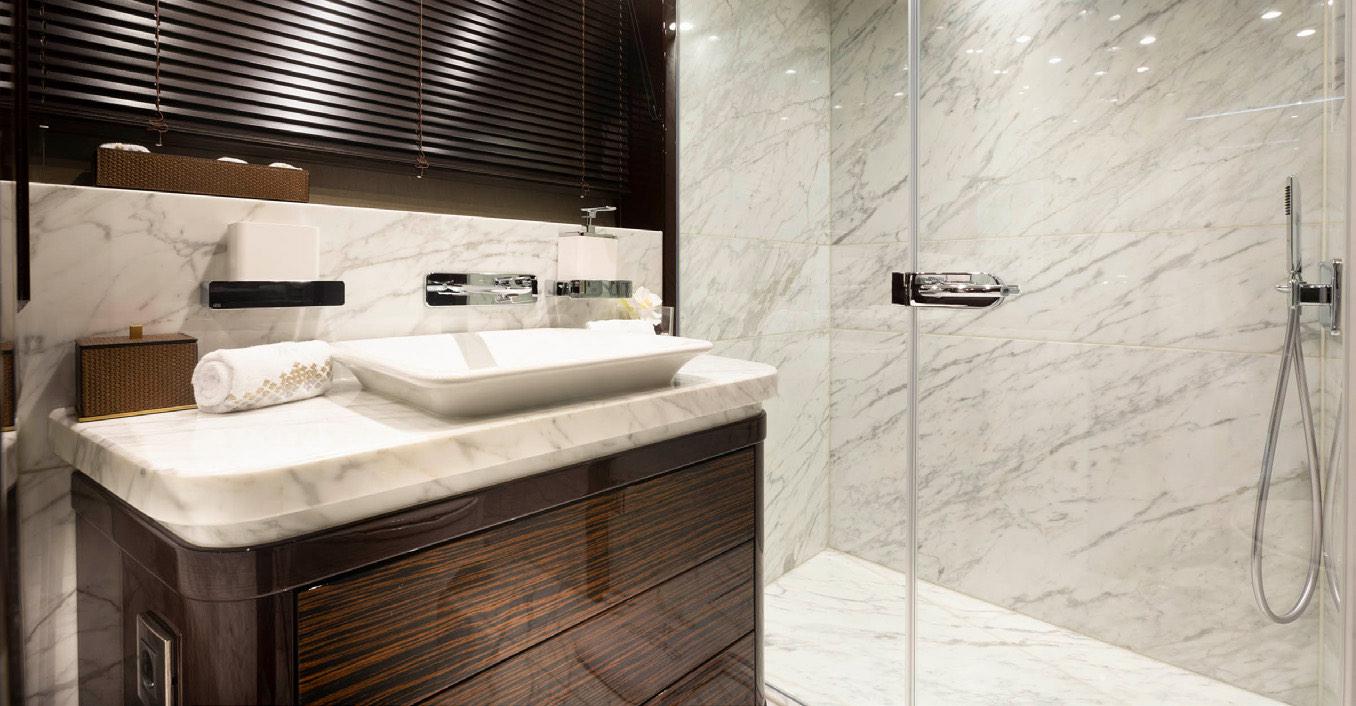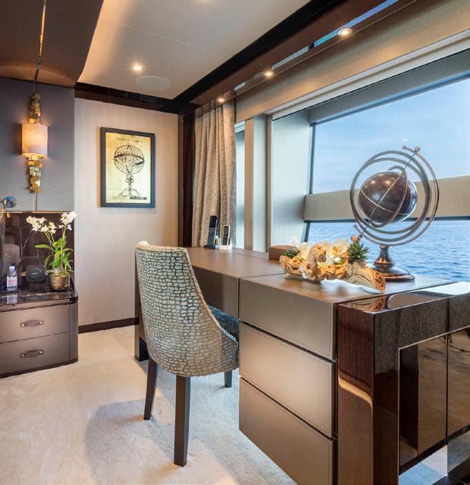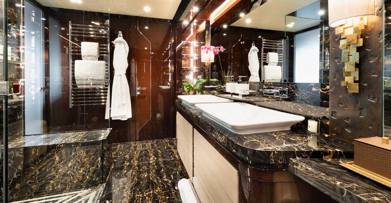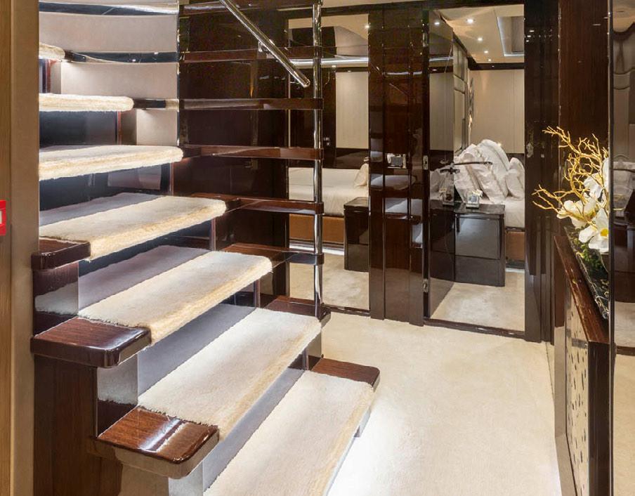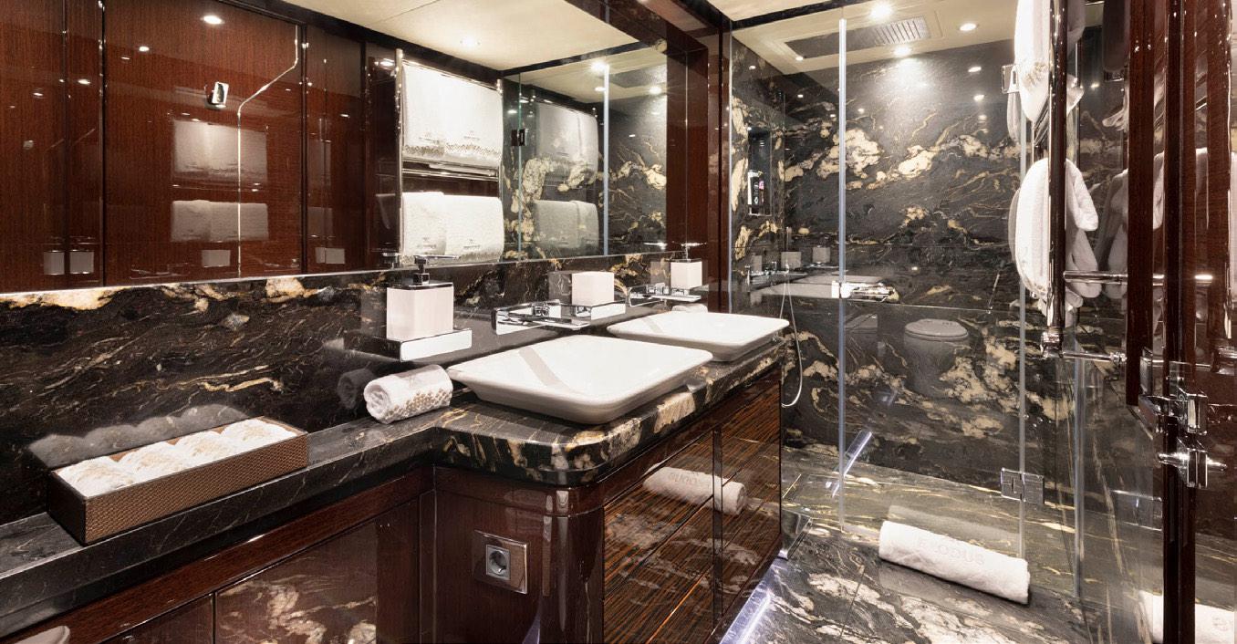 The accommodation sleeps a maximum of 10-12 guests over 5 en-suite cabins: 1 Master suite, 2 double cabins convertible to twins, each with a Pullman berth, and 2 twin cabins. ~ The Master suite is placed on the main deck forward and provides its occupants with a king-sized bed, opposite of which is a wall-mounted widescreen TV. Spacious windows to port and starboard provide plenty of natural light, and there is a desk and lounge area beneath the respective sides. There are also two large wardrobes and an en-suite bathroom fitted with an enclosed toilet bidet and sink, a shower opposite and two sinks and a bathtub in the centre. ~ The lower deck hosts the two convertible cabins forward, and each has a Pullman berth suitable for a child. Each room has a widescreen TV, desk, wardrobe and en-suite bathroom with a toilet, sink and shower. Two further twin cabins are placed behind and have the same amenities as the other cabins. ~ The crew of 8 will ensure that every guest receives first class service throughout their time on board.