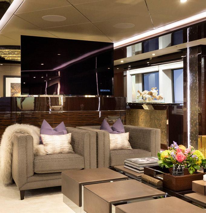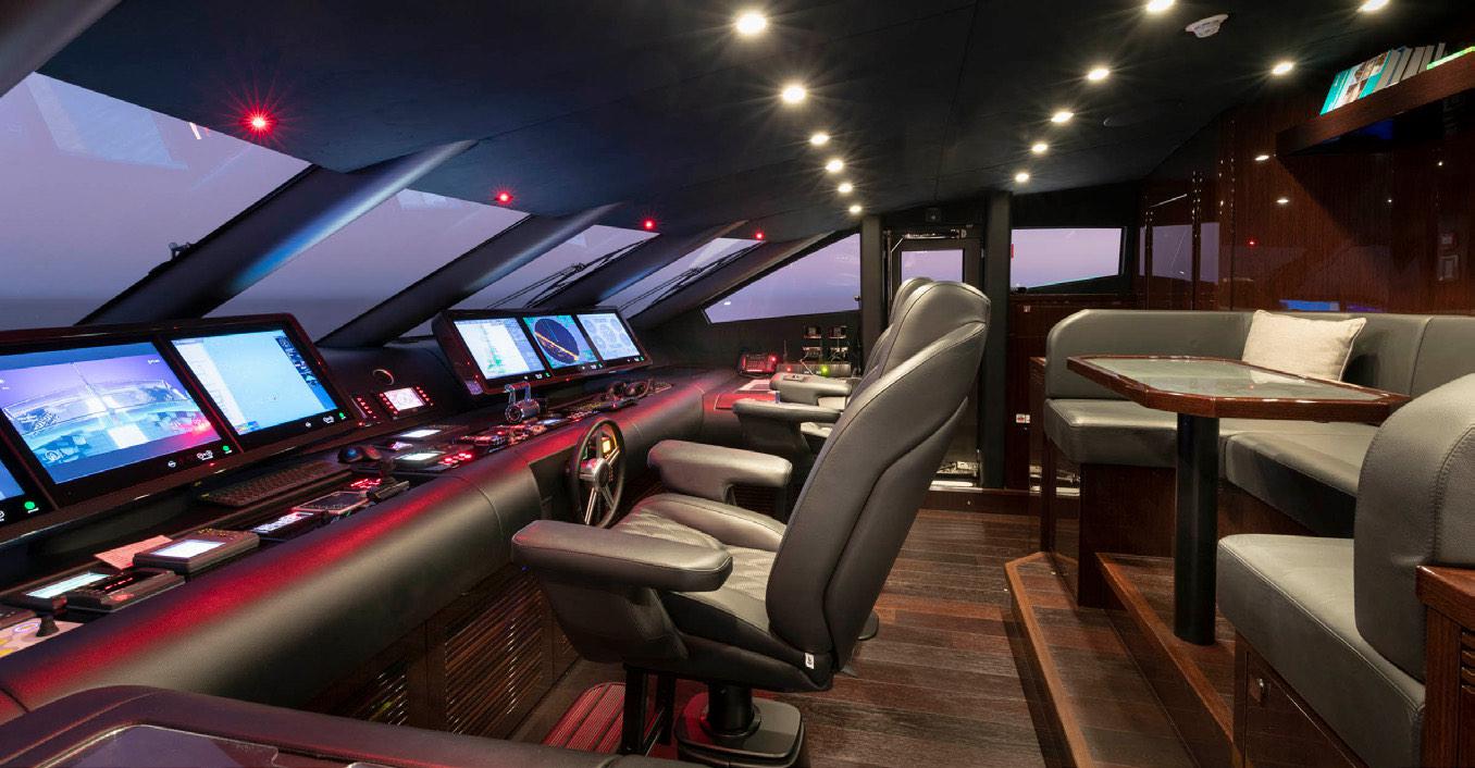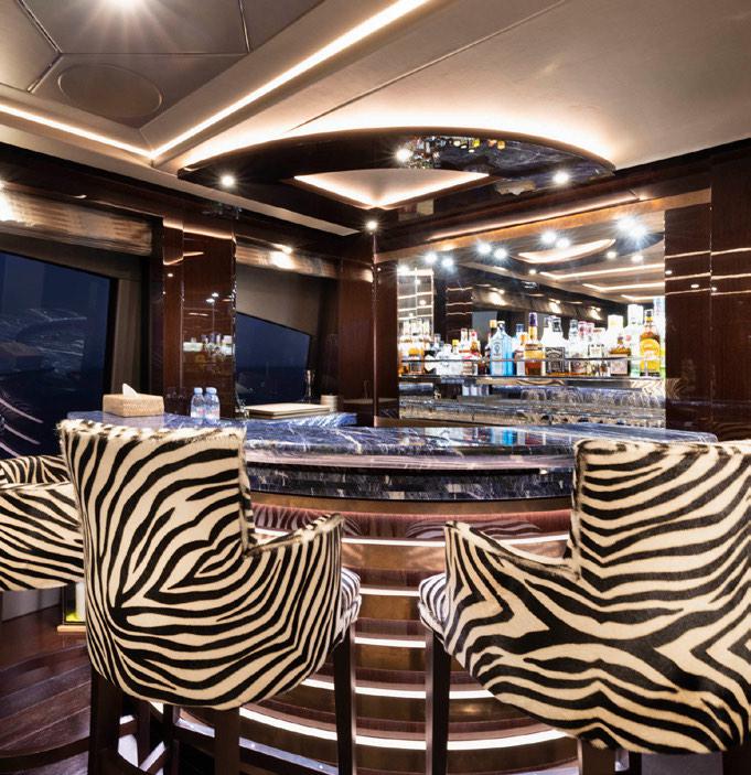On the upper deck, the helm station is forward and contains a C-shaped sofa and drinks table behind the pilot seat. The Captain's cabin is situated behind, followed by the sizeable skylounge. Within, there is a corner sofa and chaise-lounger to starboard and a sophisticated modern bar to port.