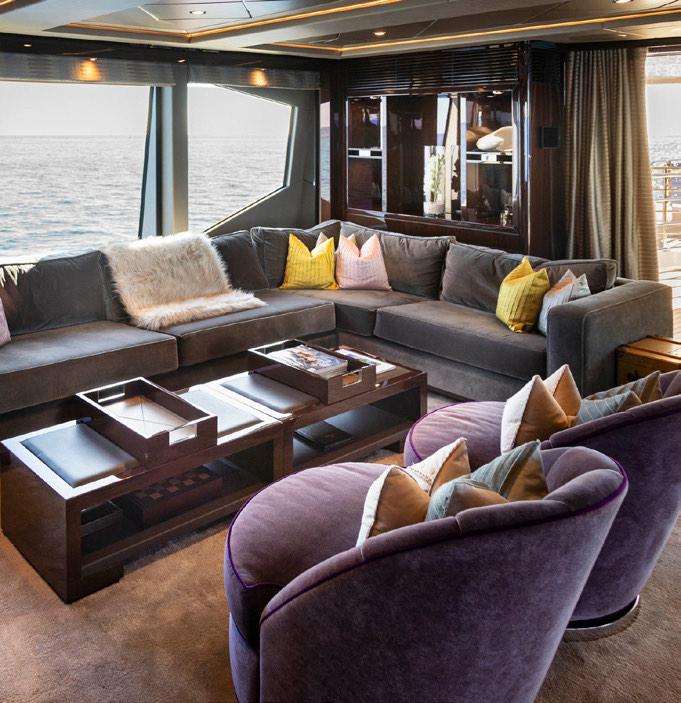 The upper deck aft is the main alfresco dining area, offering a grand table to seat 12 beneath the shade of the sundeck overhang. Two L-shaped sofas are fitted along the stern for guests to savour the outdoor ambiance before and after a meal.