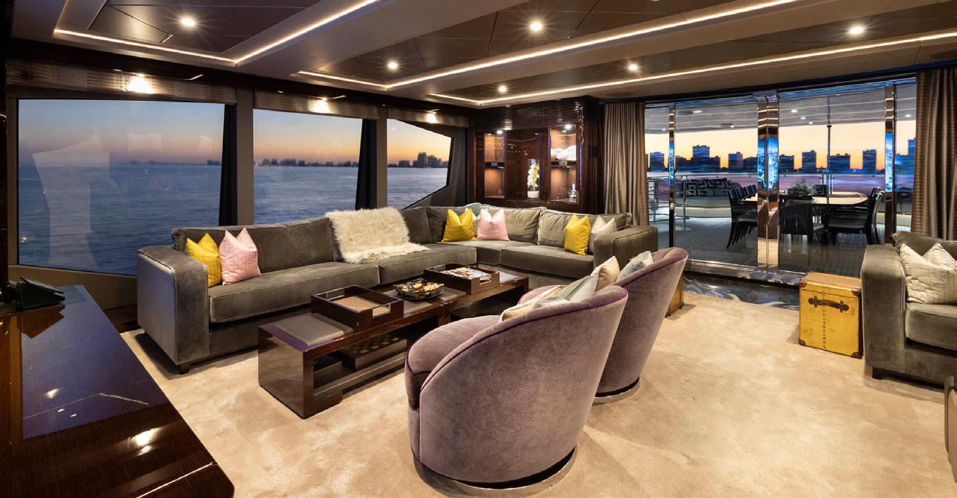 The Master suite is located forward on the main deck, with the galley and main foyer behind. The formal dining area and main salon in the aft are combined together to make one spacious room, which seats 10-12 guests in the elegant modern setting. Sofas and armchairs surround a central coffee table for an intimate conversational area.
