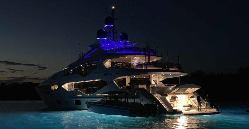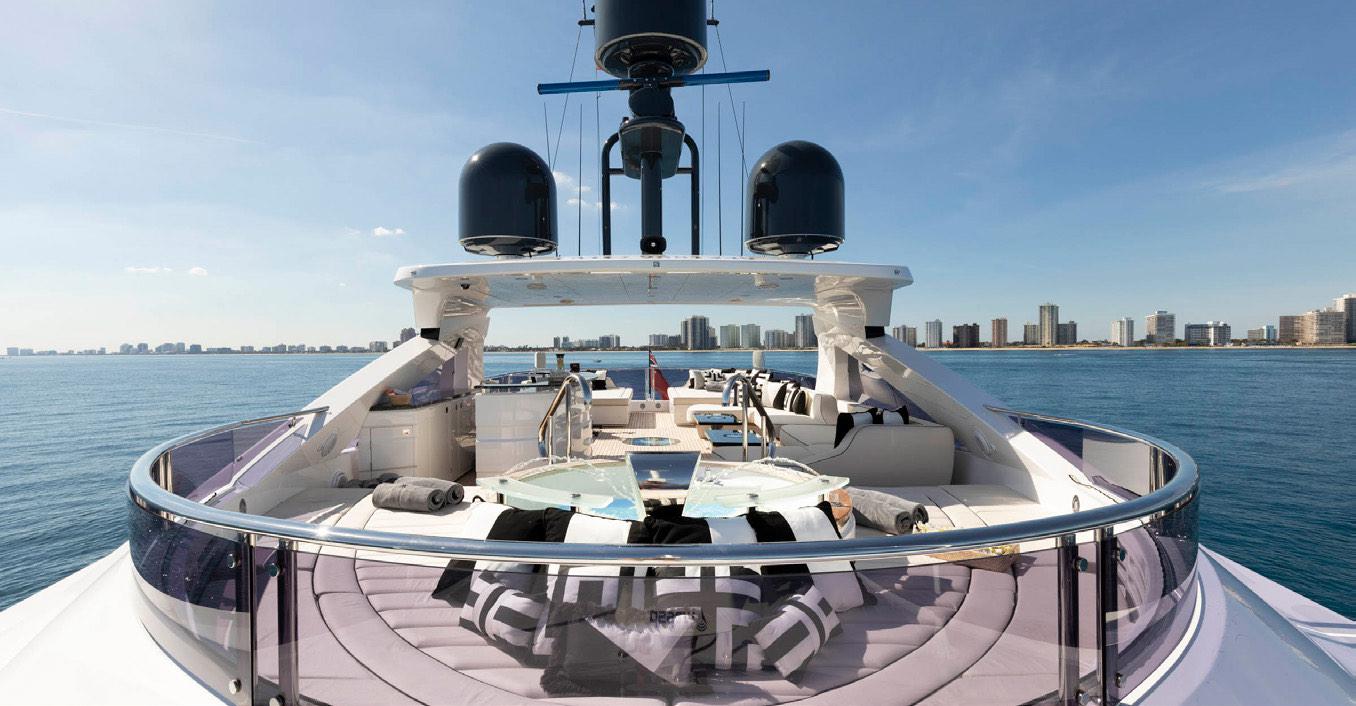 On the sundeck, the forward section is fitted with a raised Jacuzzi surrounded be sunpads, while amidships the hardtop offers shade to guests enjoying a cocktail at the starboard wet bar or dining alfresco on the two L-shaped sofas accompanied by small tables. The stern can be used as a sunbathing area and laid out with sun loungers, or used for exercise such as yoga.