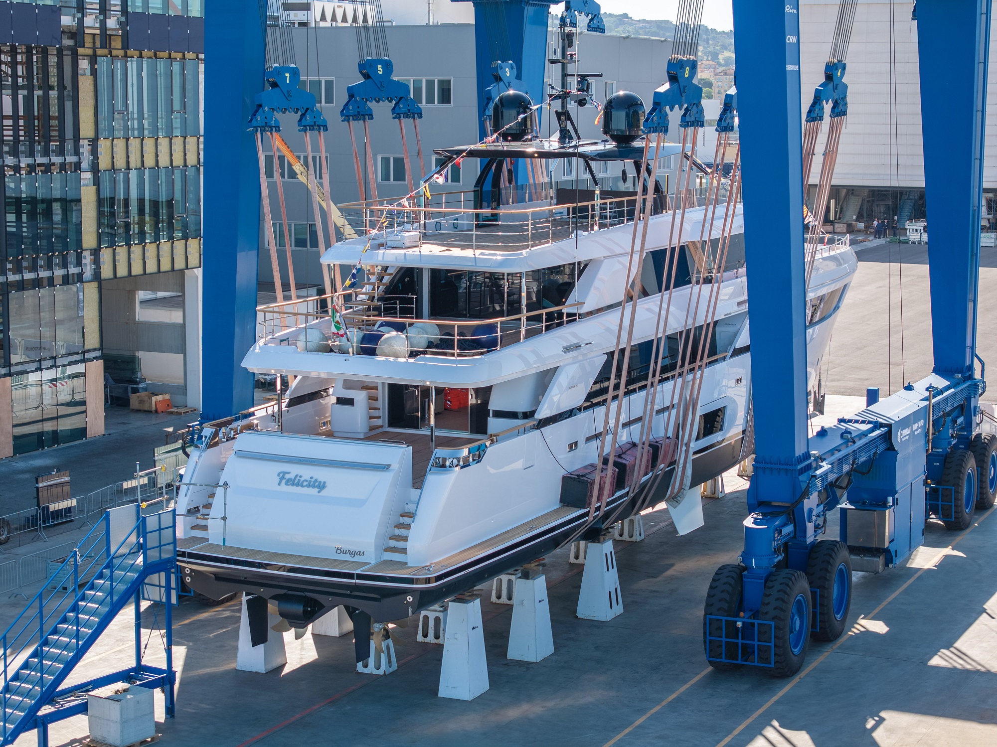 Luxury yacht FELICITY is a 41.8m (137'1") Custom Line Navetta 42 tri-deck yacht with exterior and interior design by Zuccon International Project. Accommodation is for up to ten guests in five suites with additional cabins for the seven crew members. Guest space is generous and varied with loads of al fresco entertainment space and comfortable interiors.