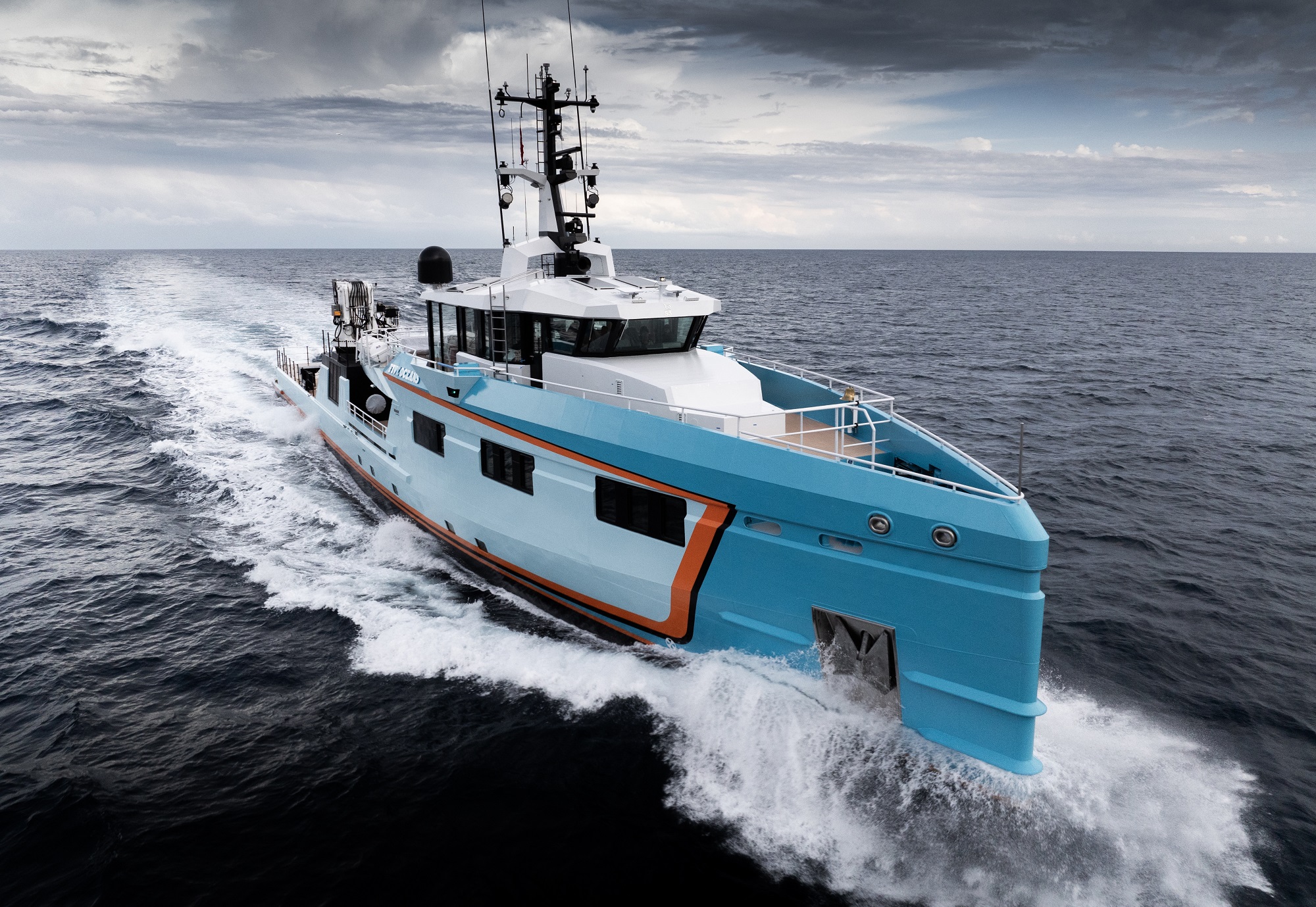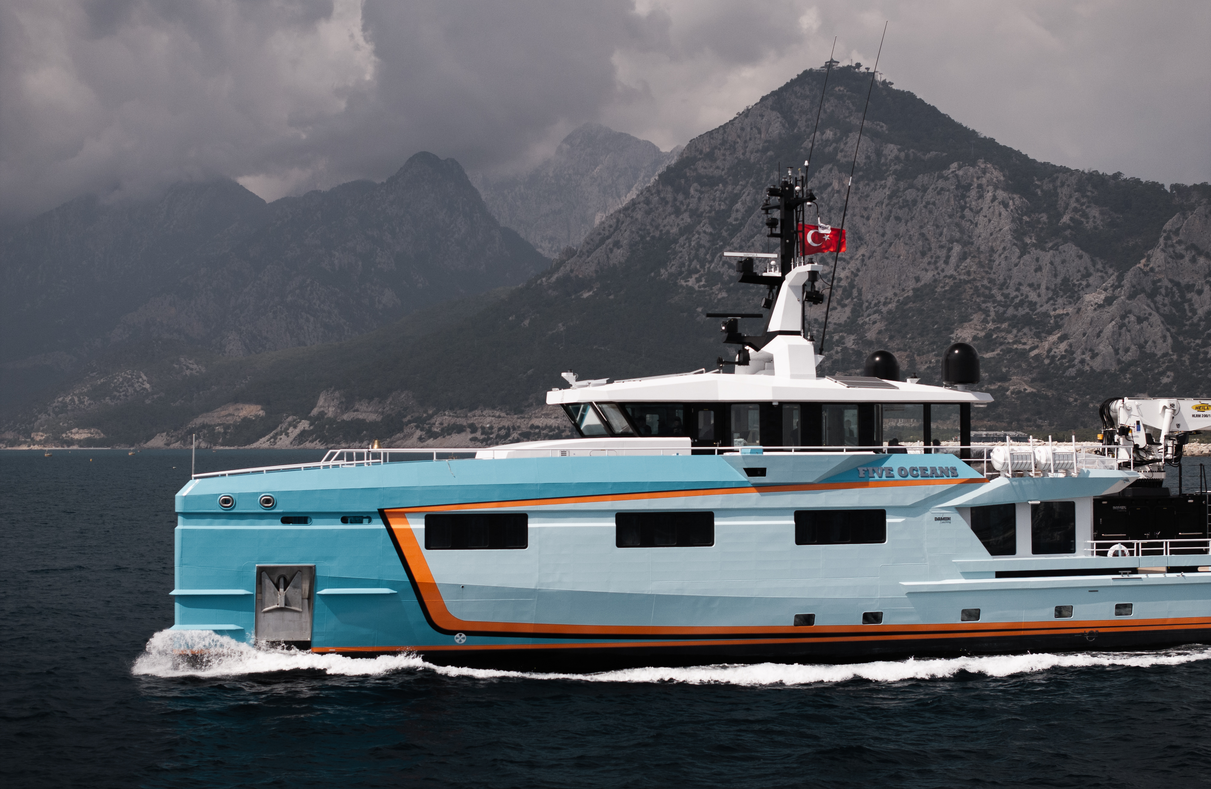 Luxury support yacht FIVE OCEANS (ex. YS5302) has been developed by Damen Yachting as part of their YS Insider series, in close collaboration with her owner. At 53.25 m (175'), she has a striking sky-blue hull which visually aligns with the ambitous and bold programme the support yacht will undertake.