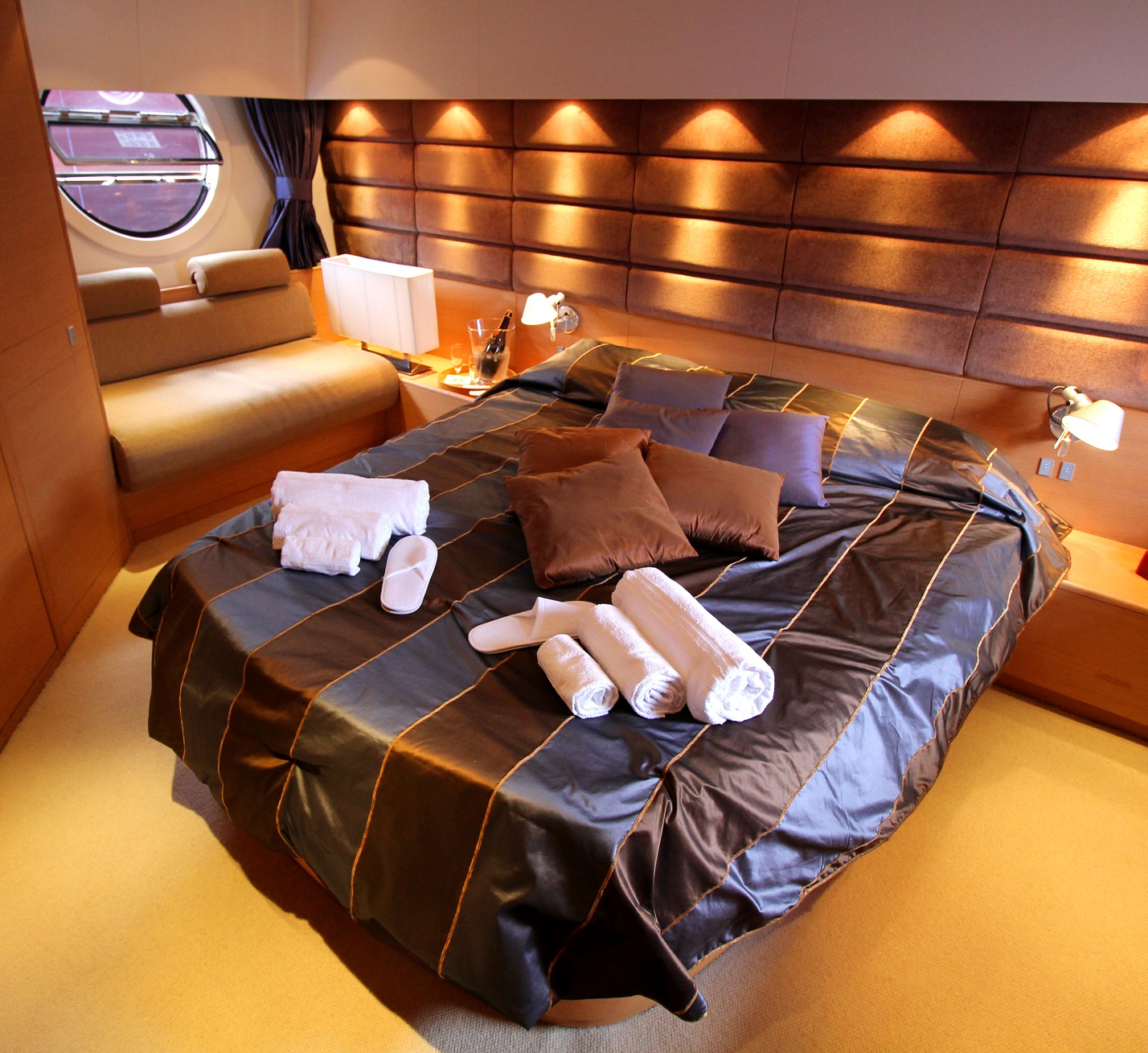 While up to 12 guests can remain on board while cruising, the accommodation sleeps a total of 6 guests in 3 en-suite cabins: 1 Master suite, 1 VIP stateroom and 1 twin cabin. ~ The Master suite is placed amidships to take advantage of the full beam and comes furnished with a queen-sized bed, a desk to port, a sofa to starboard. The en-suite bathroom provides a toilet, bidet, sink and shower. ~ The VIP stateroom is placed in the bow and has steps/seating to both sides of the queen-sized bed. There is plenty of wardrobe space, and the en-suite bathroom comes with a toilet, bidet, sink and shower. ~ The twin cabin has two single beds, lots of storage space and an en-suite bathroom fitted with a toilet, sink and shower. ~ The expert crew of 3 will ensure that all guests are well taken care of throughout their time on board.