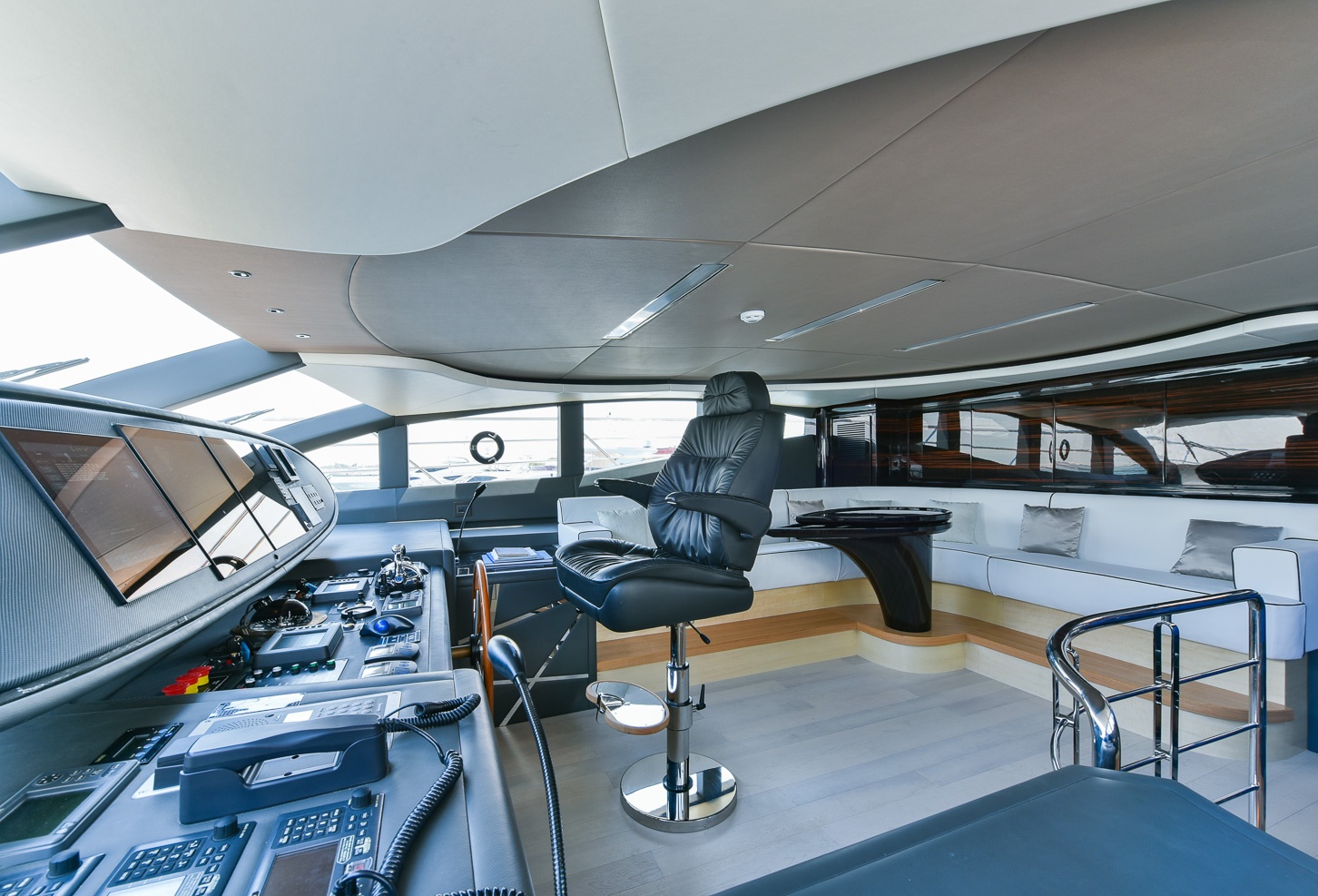 The interiors aboard the yacht are contemporary chic. In the salon, the use of timeless black and whites paired with pale woods, create a clean and minimalistic feel. Soft furnishings are an eye catching white with black piping and black with white piping. Centered in the salon lounge is a glass coffee table, featuring stingray leather edging, while forward is the open plan formal dining. Her main salon table is made of 3 layers of crushed glass. The entire salon is surrounded in large panoramic windows, optimizing natural light and offering spectacular views. To starboard there are sliding glass doors leading directly to the side deck, with a fold out balcony over the ocean, as well as aft sliding doors for access to the generous aft deck. Accommodation is in 5 well-appointed cabins, with the master on the main deck forward and full beam, while a further 4 cabins are on the lower deck.