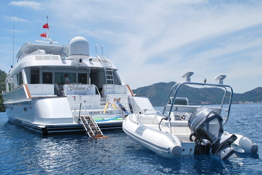 The GILAINE O yacht has a 5.00m Novurania rib tender with outboard 115HP, Water-skis, Wake board , Kayak , Donuts , Snorkeling Equipment , Wi-Fi internet , Satellite TV system, Stereo sound system , LCD TVs DVDs in saloon / all cabins, Stabilizers , Bow thruster , Water maker , Satellite communications